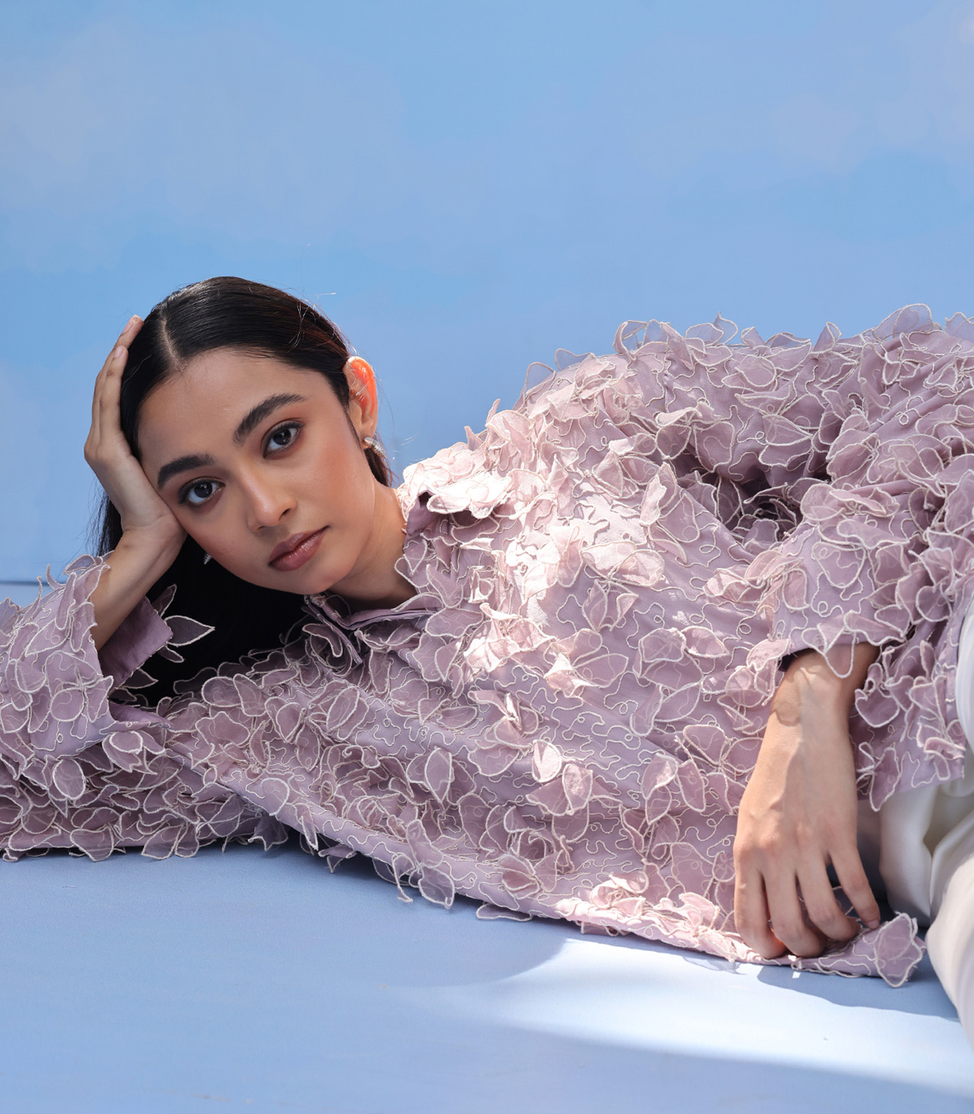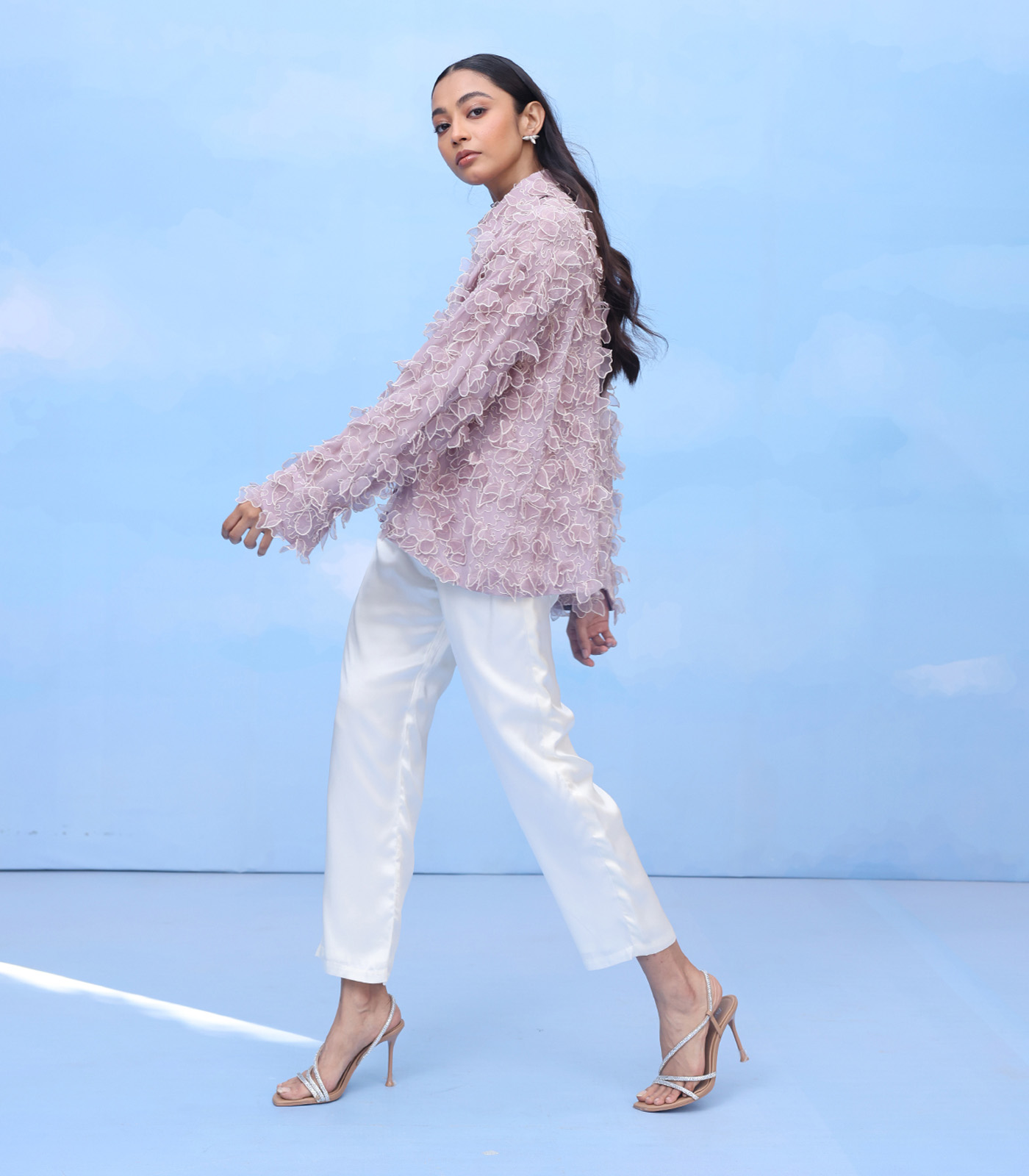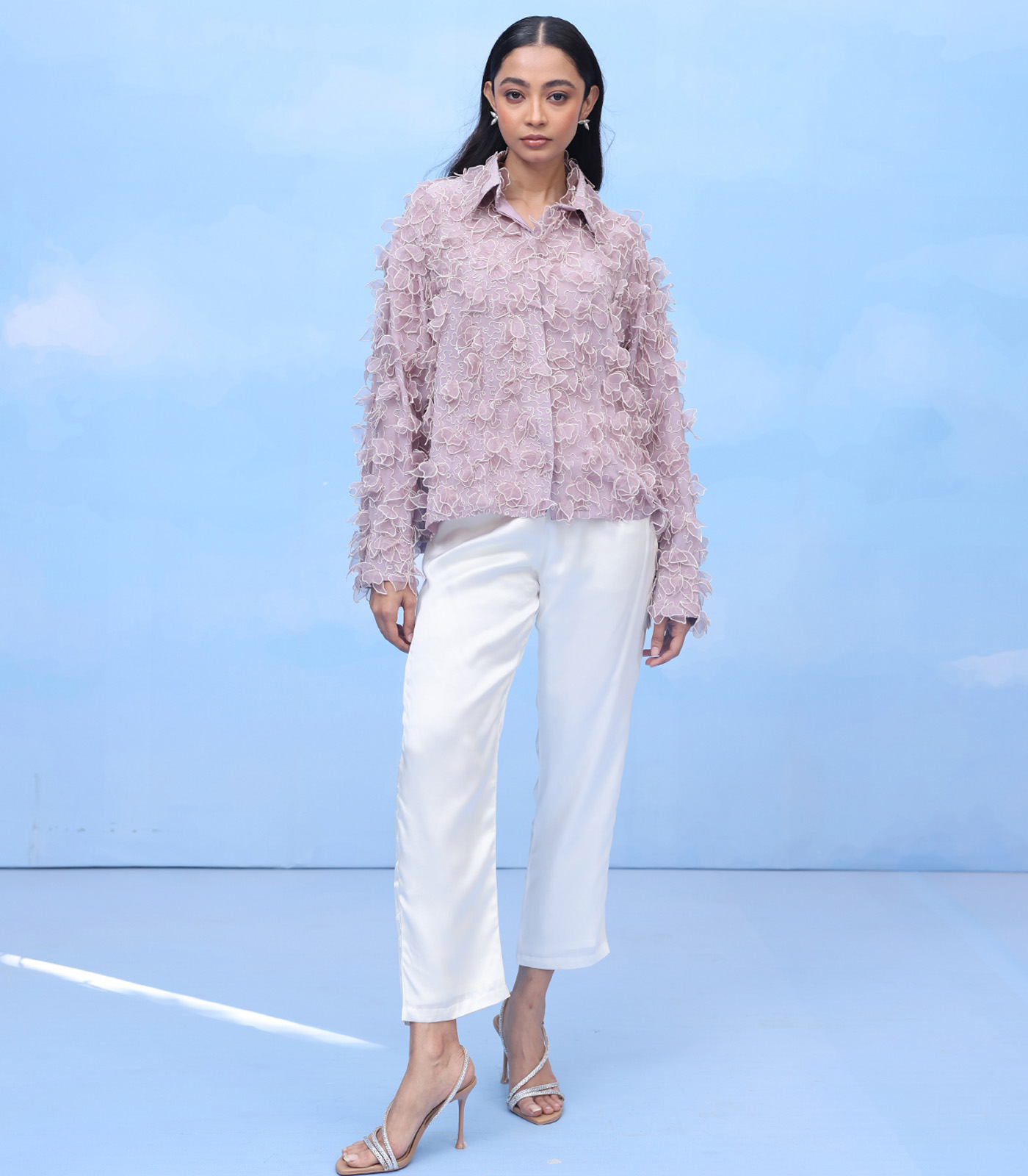 An oversized shirt with 3D petal patch embroidery on crepe. Featuring jan collar and long cuff with slit for a polished look.
