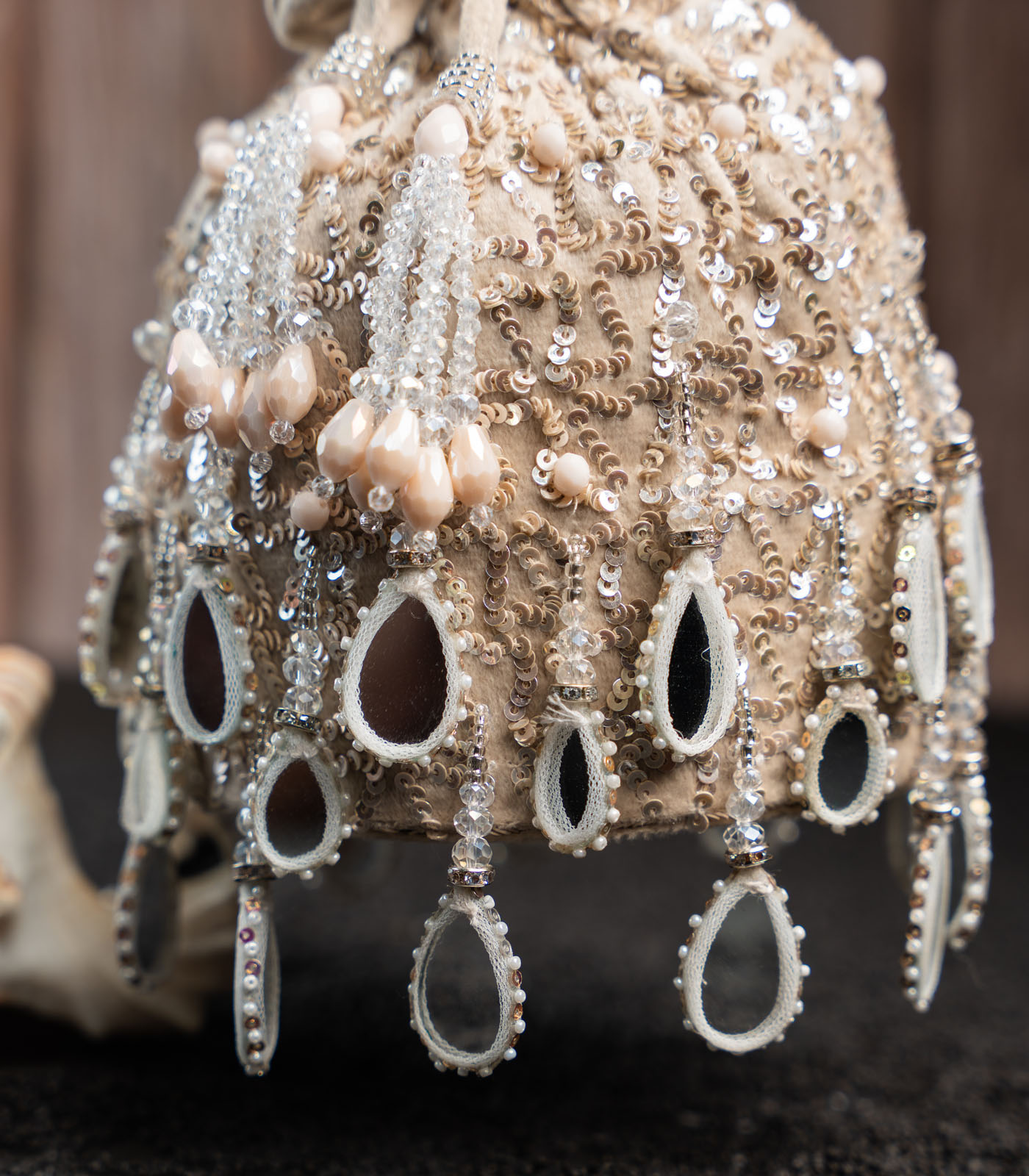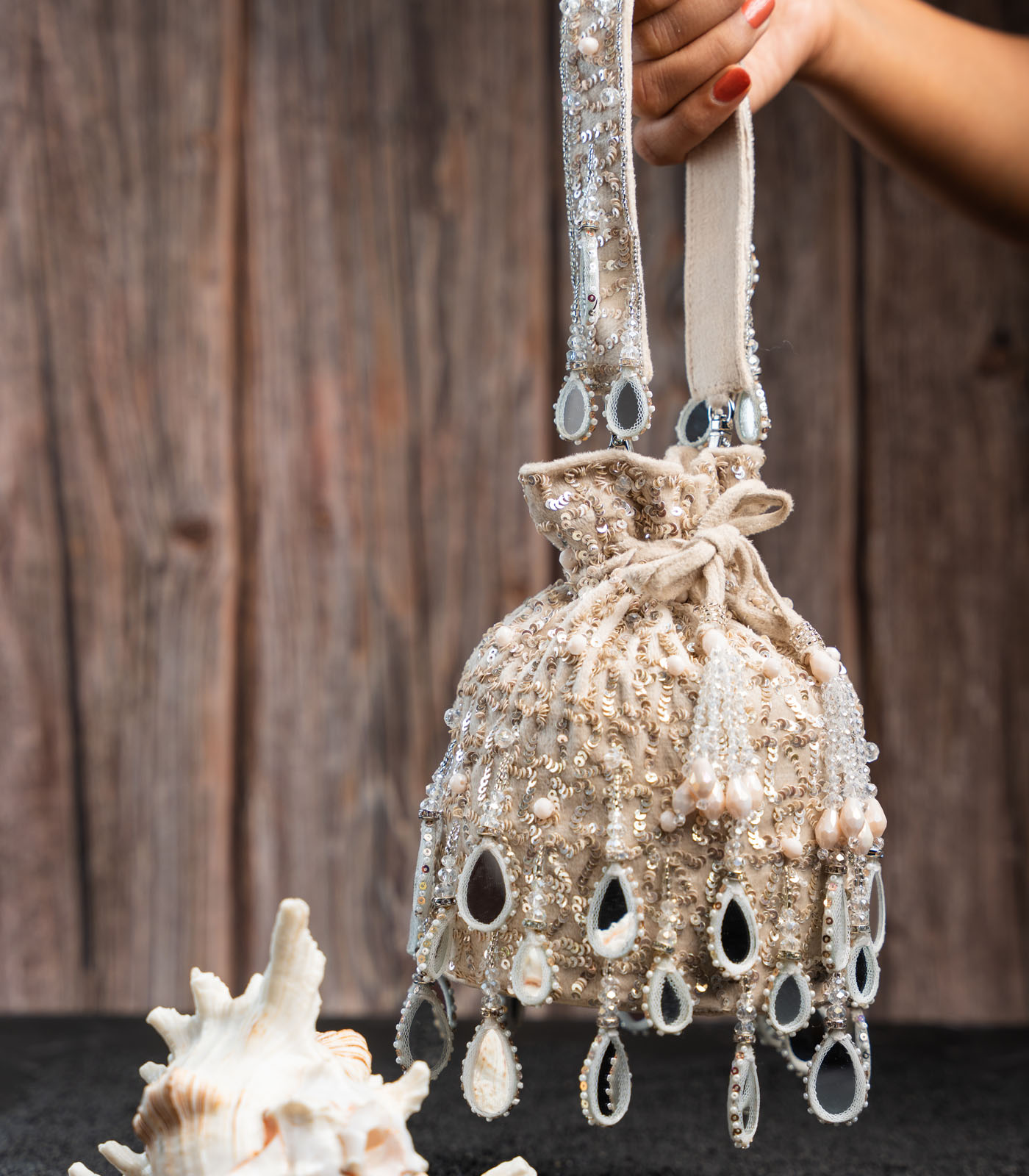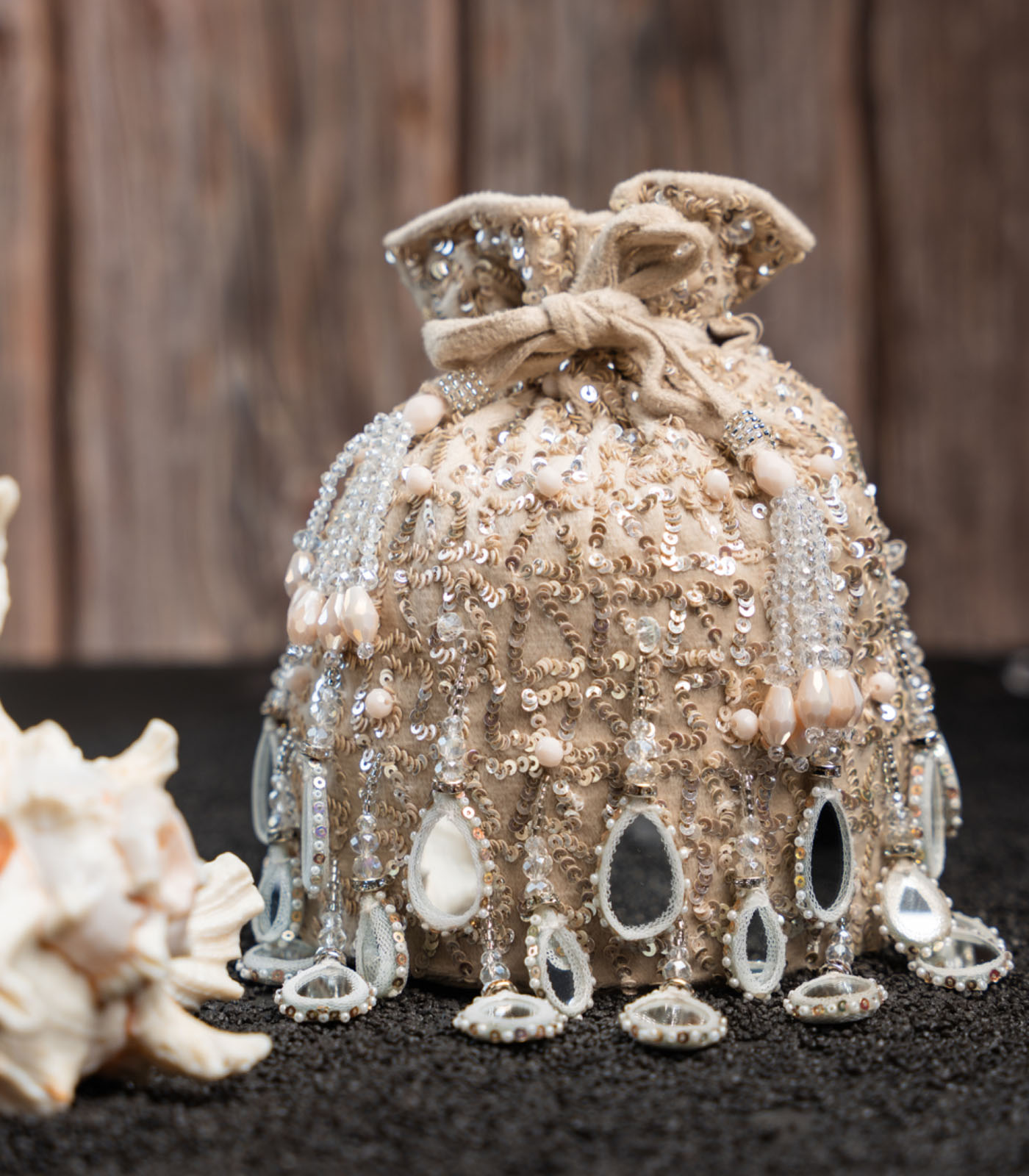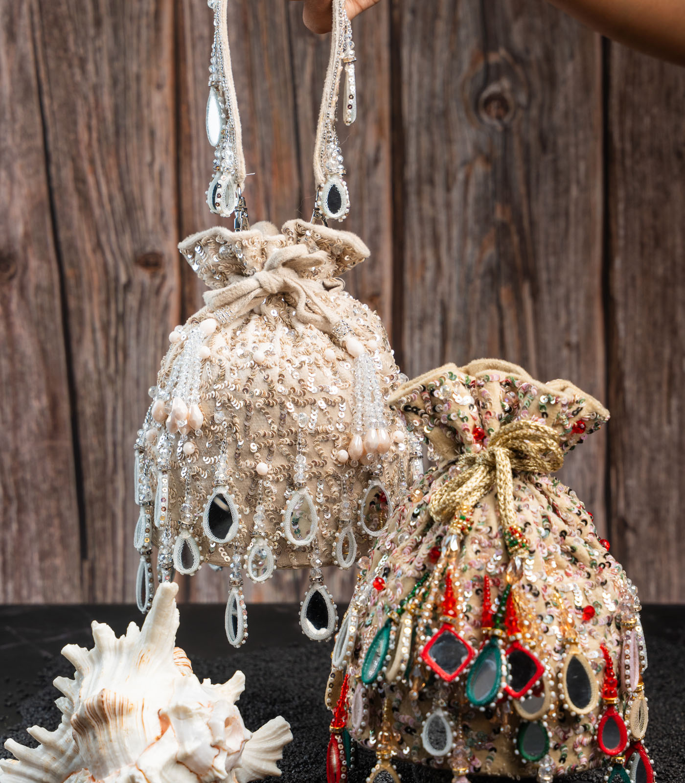 A stunning fusion of tradition and style, this ivory-based potli is adorned with beads and mirrors that create a vibrant, eye-catching design. Accented with playful tassels, it’s perfect for adding a colorful sparkle and elegant flair to any special occasion.