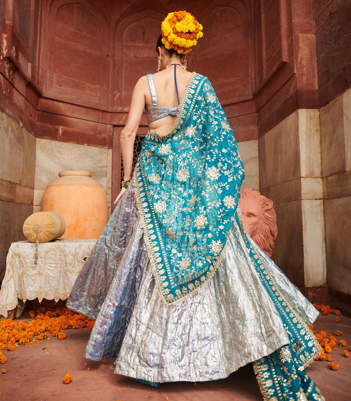 Blue lampi lehenga paired with a matching square neck blouse and highlighted with organza mirrorwork dupatta with fine kiran.