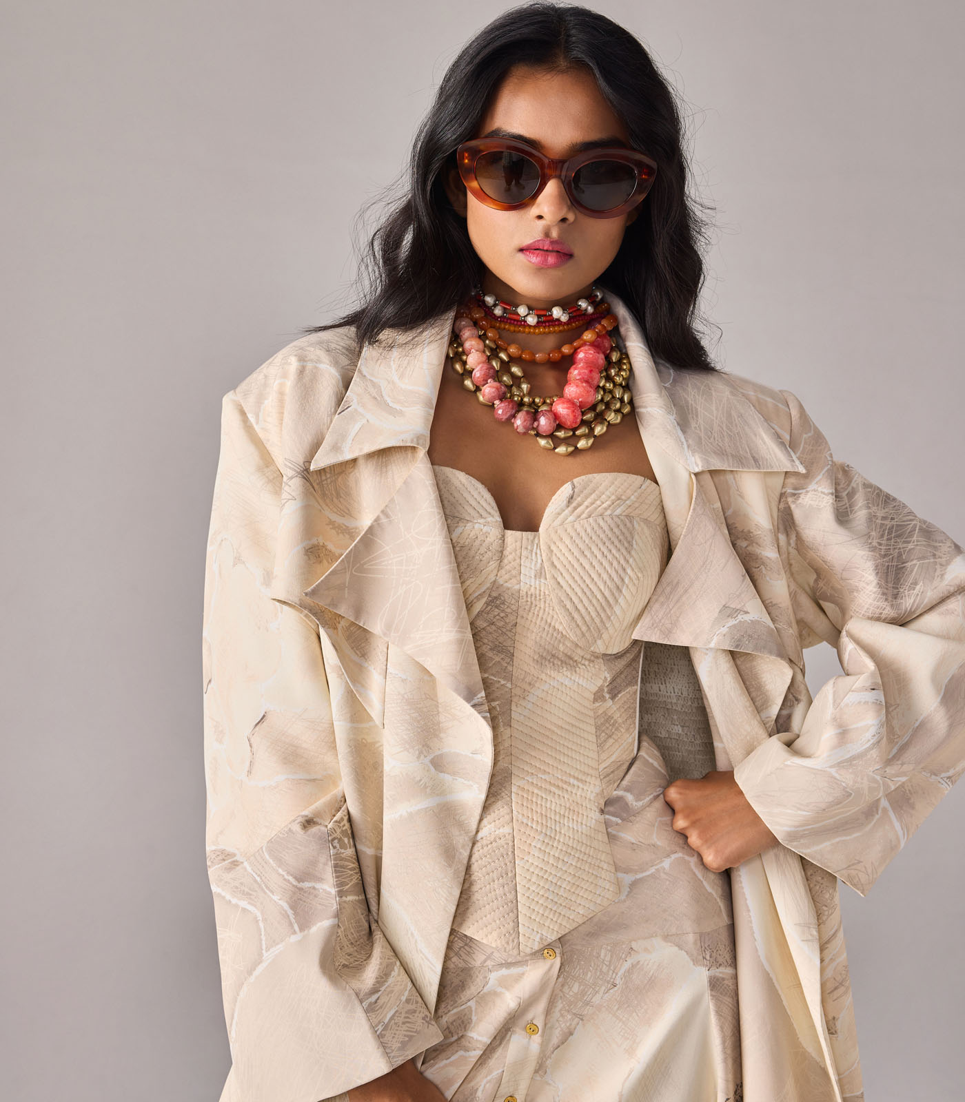 Corset : Abstract floral print strapless, asymetric corset with quilting detailing