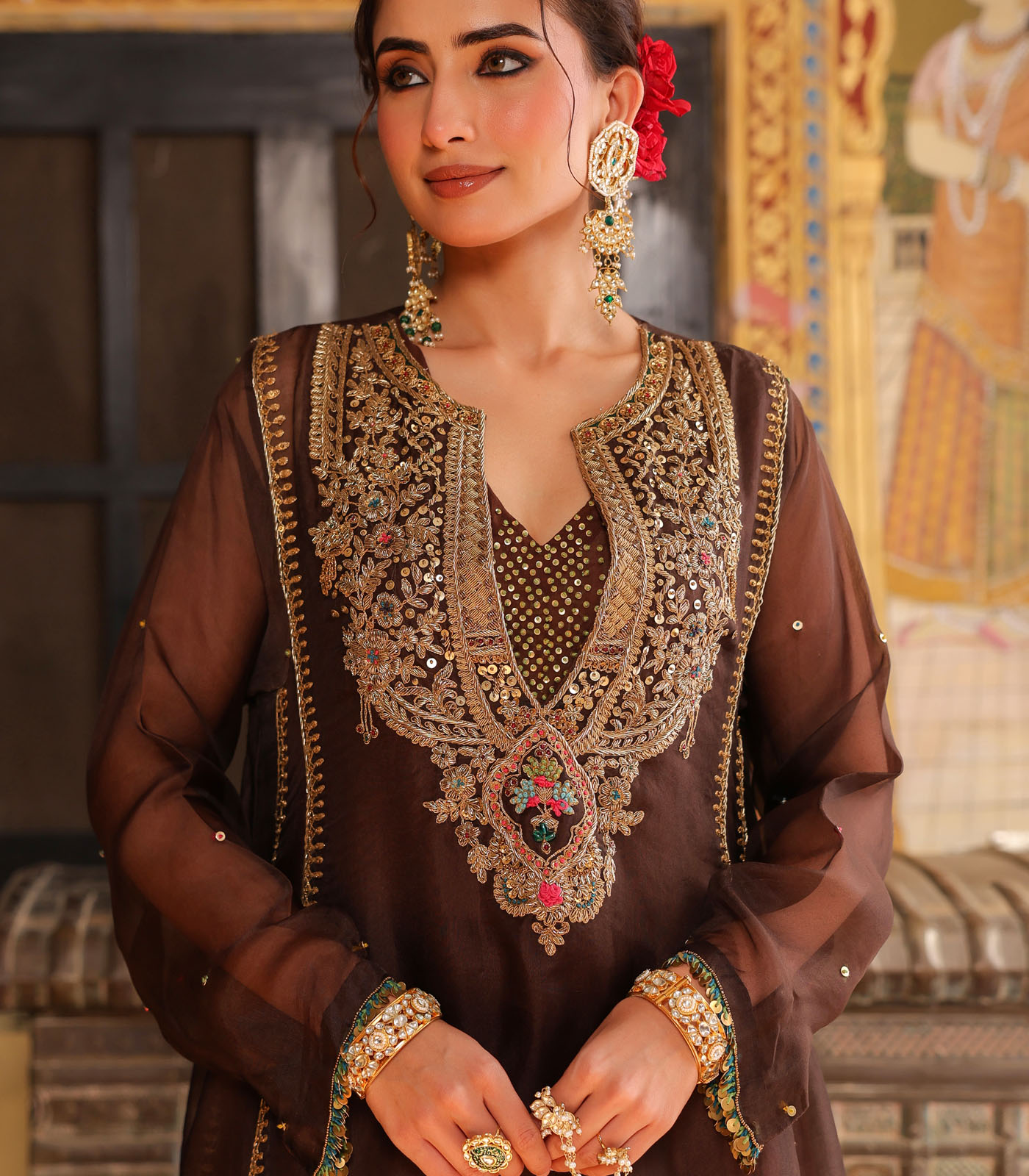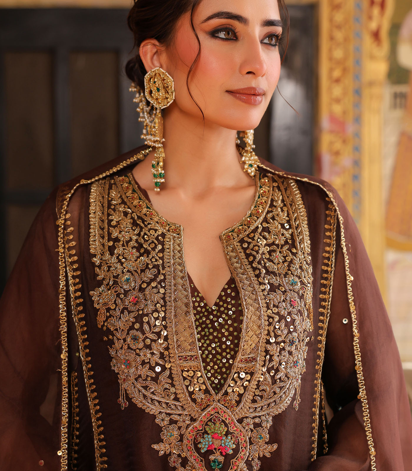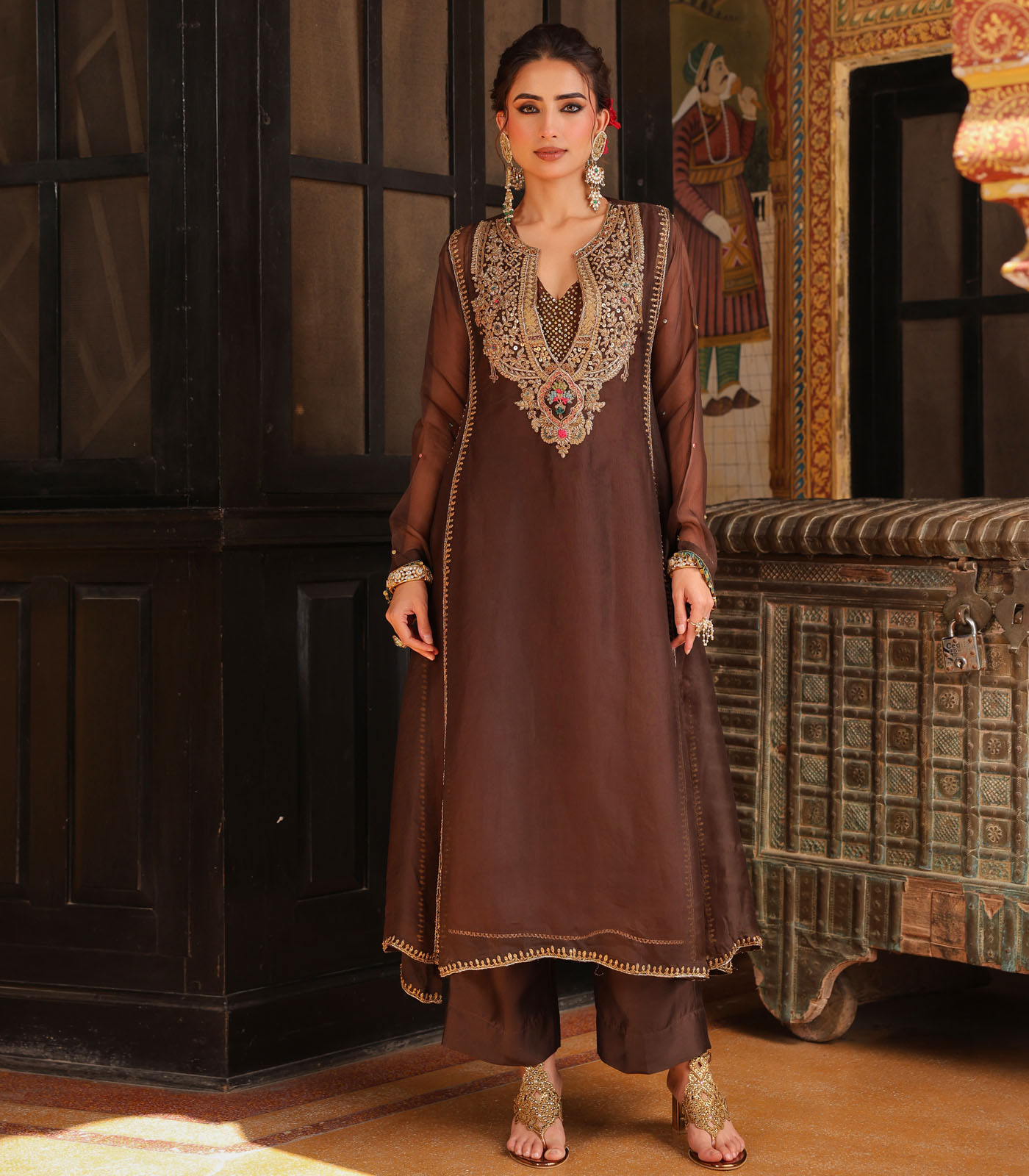 Ahista Brown Pakhi Yoke Pheran Long Kurta Set
