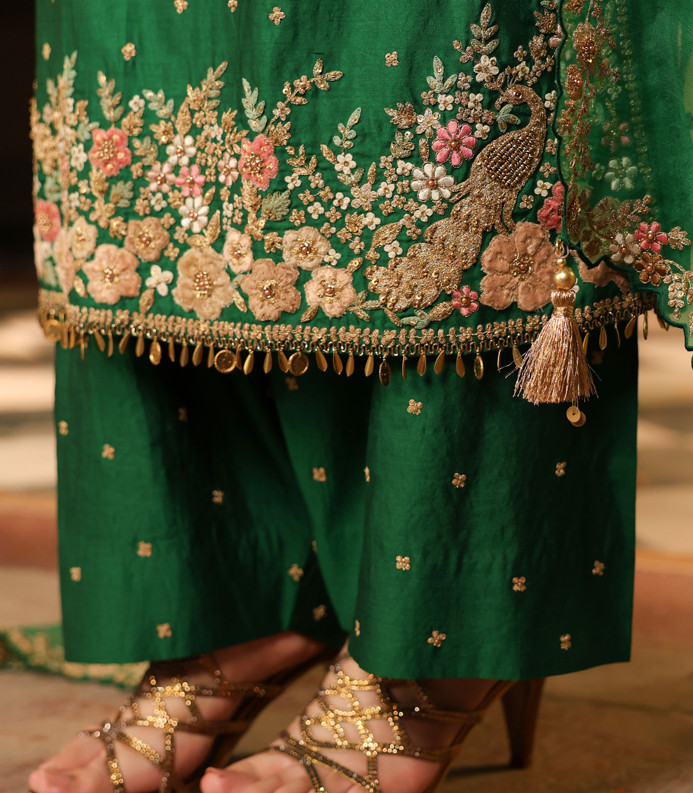 This 3 piece kurta set features heavy applique embroidery enhanced with zardosi and tikki on the hem and sleeves of the kurta with butis spread all over. It is paired with embroidered pants and dupatta.