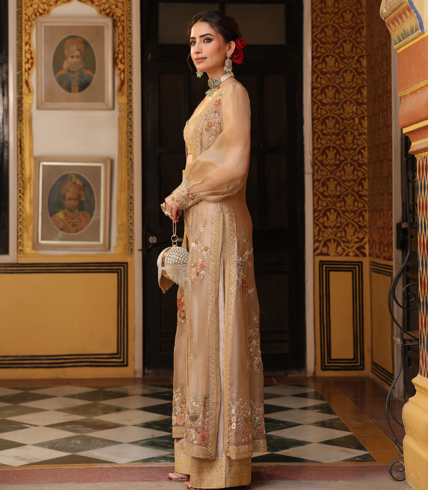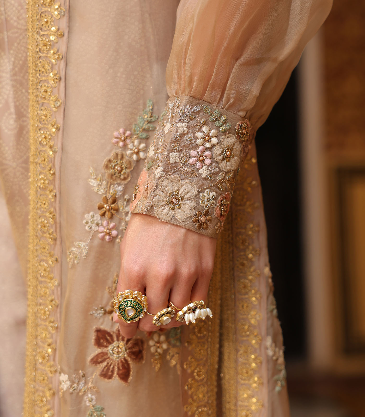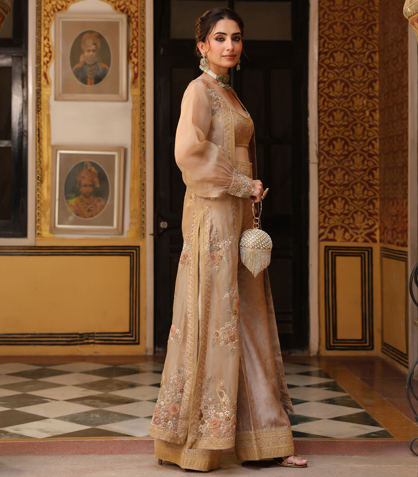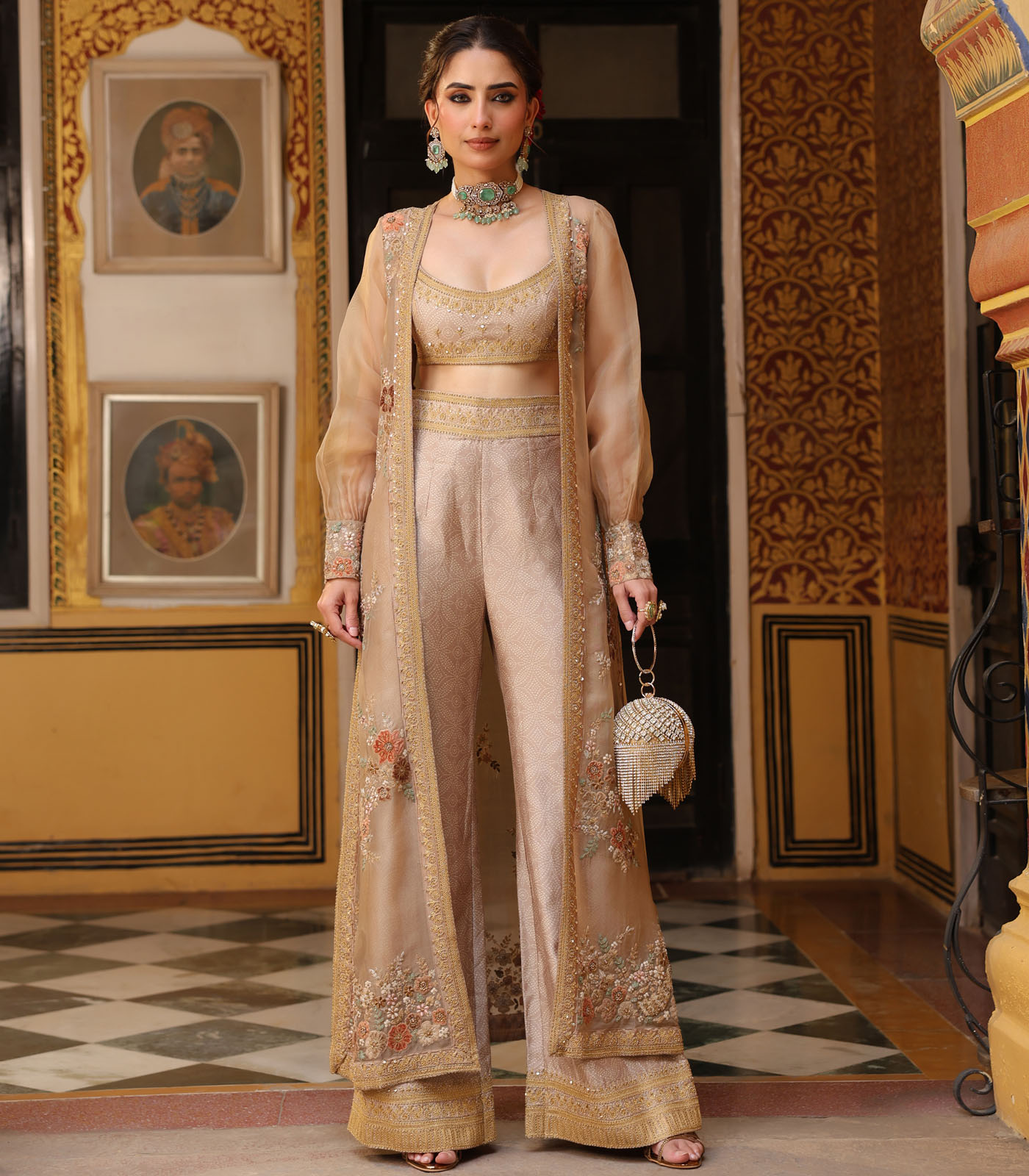 This 3 piece cape set features delicate aari embroidery enhanced with tikki and zardosi work on the cape. It is paired with a printed embroidered bustier and flared pants.