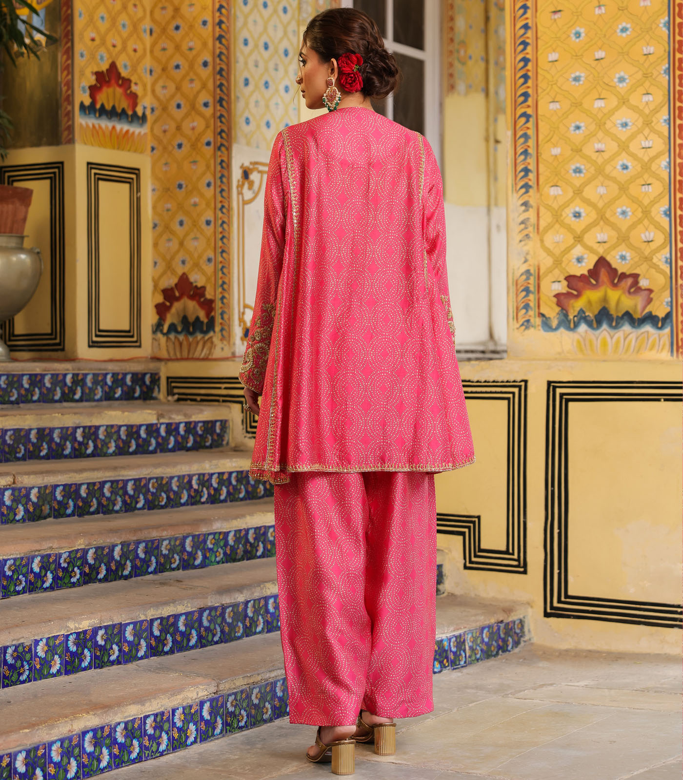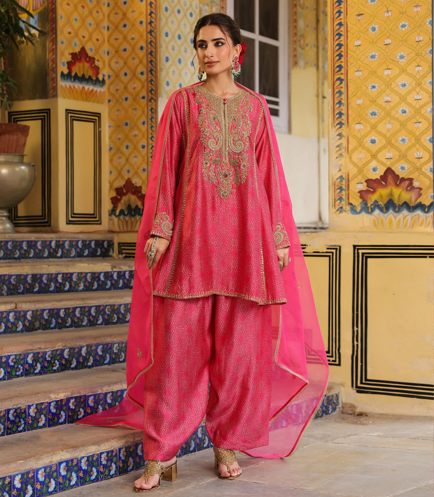 This 2 piece printed kurta set features heavy zardosi, tikki and resham embroidery on the neckline and sleeves of the kurta. It is paired with a printed salwar. Optional embroidered dupatta available on request.