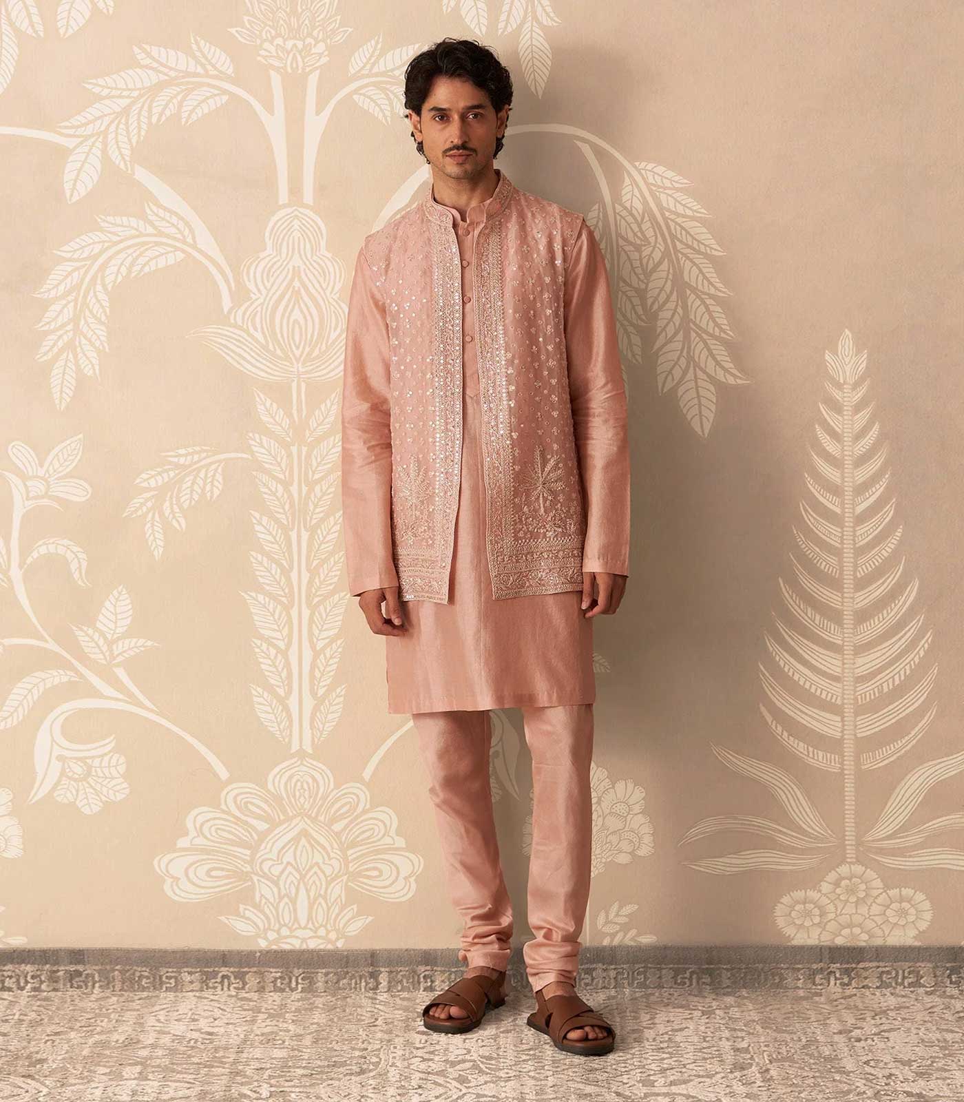 ORGANZA ALLOVER EMBROIDERED SLEEVELESS SHORT BANDI PAIRED WITH CHANDERI KURTA AND TROUSER