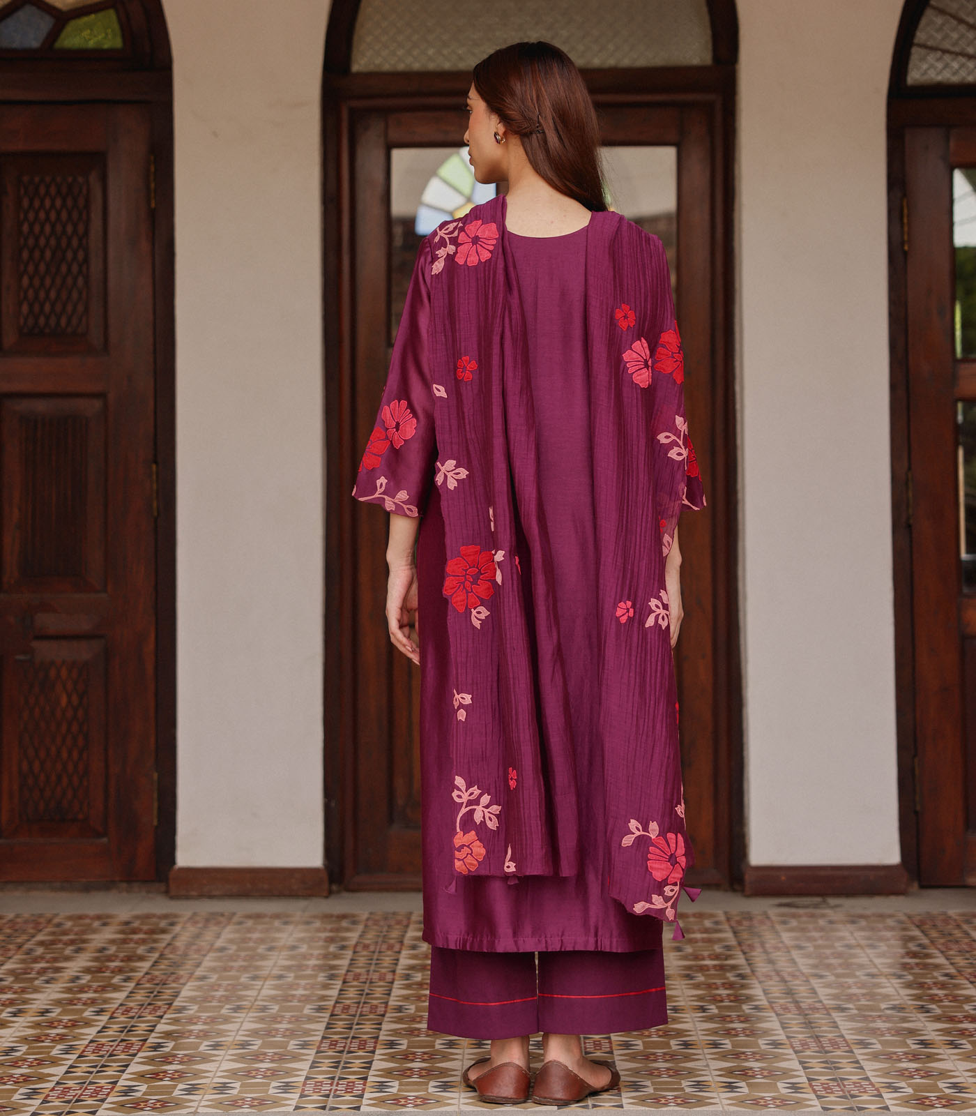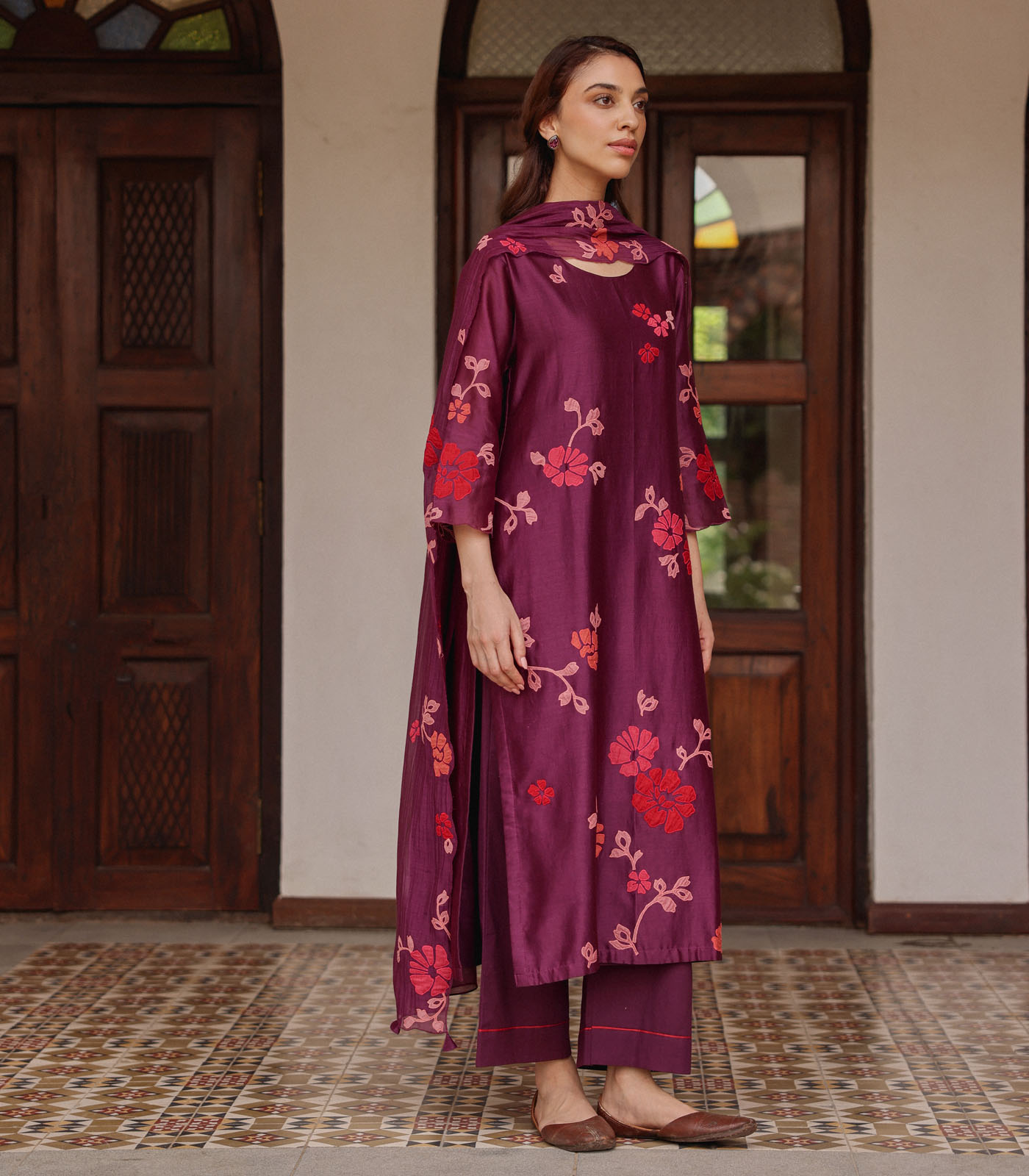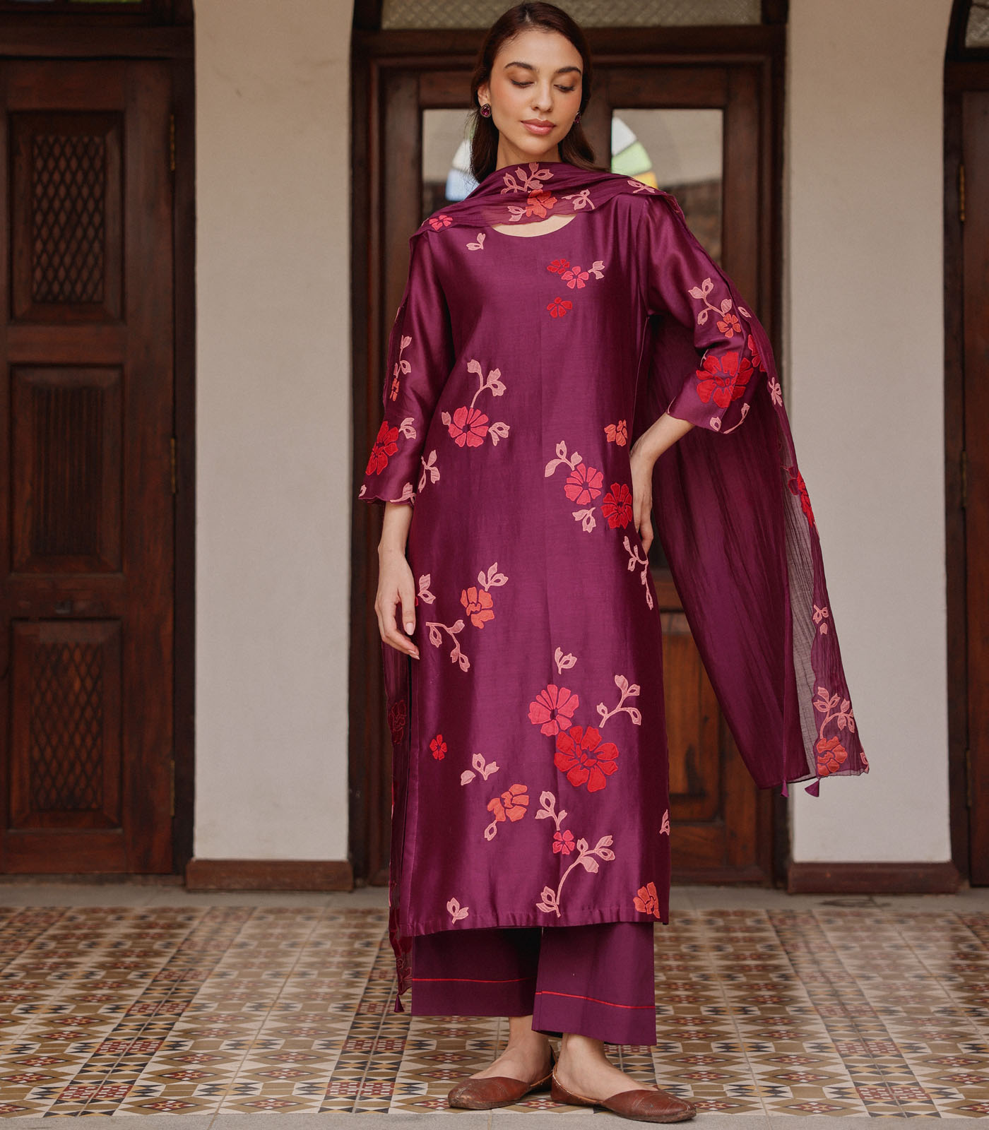 Scattered blooms lend charm to the Amethyst Applique Floral Kurta Set, with contrasting applique blooms accenting the kurta and sleeves. Pair it with matching pants and a dupatta adorned with blooms and finished with tassels, a graceful ensemble made for festive occasions.