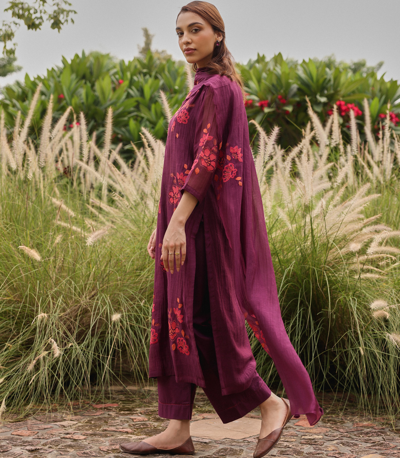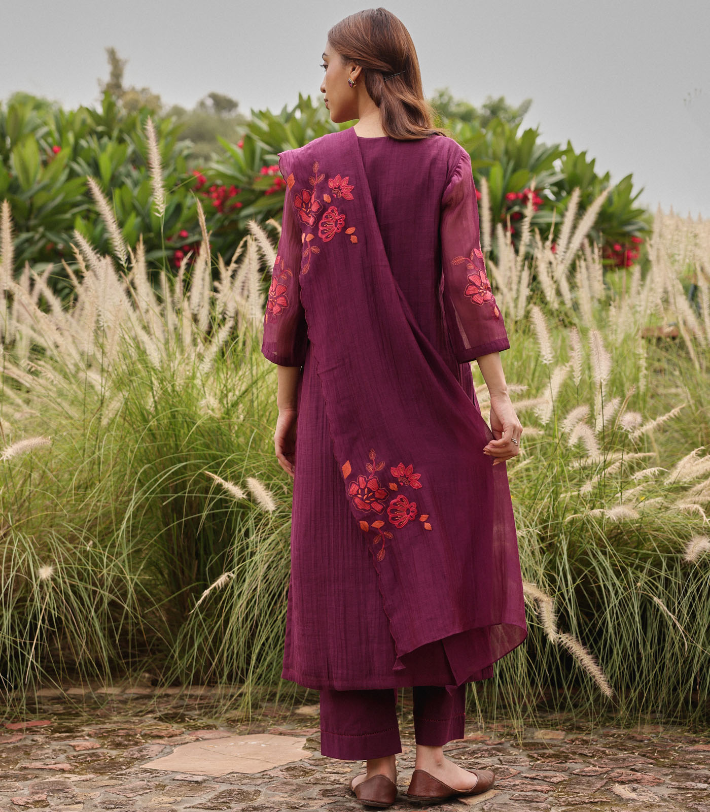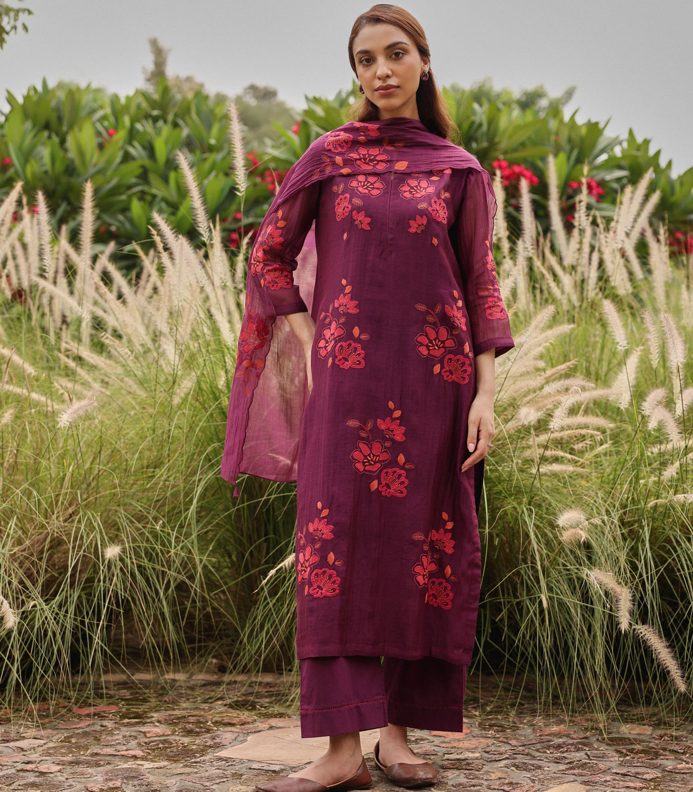 The Amethyst Applique Kurta Set showcases contrasting applique blooms scattered across the kurta. Paired with matching pants and a dupatta adorned with applique blooms, it offers a graceful and elegant ensemble perfect for festive occasions.