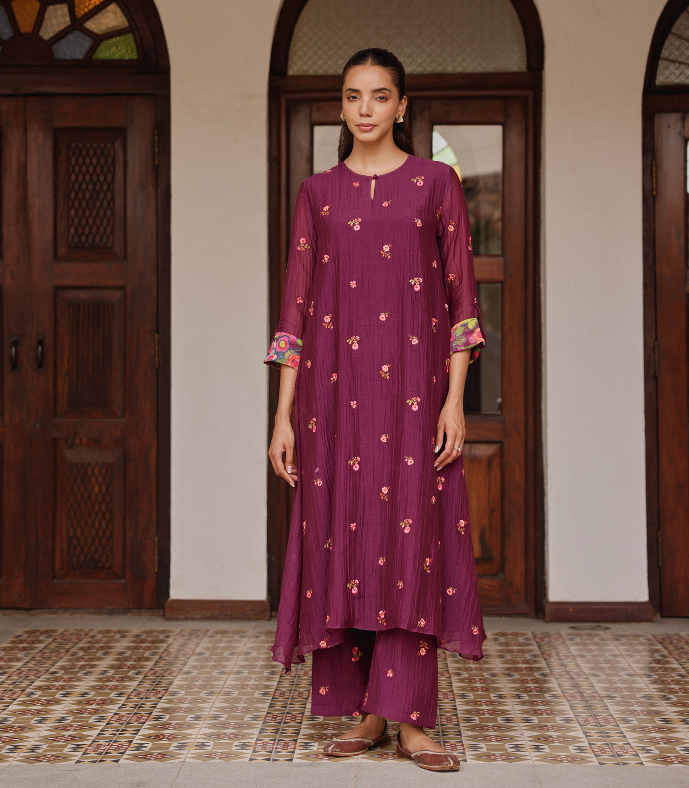 The Amethyst Bloom Co-ord Set showcases a fluid, elegant silhouette, adorned with delicate embroidered blooms artfully scattered across the kurta and sleeves. Subtly accented with printed cuffs, it adds a refined touch of charm. The ensemble is completed with matching pants featuring complementary embroidery, creating a graceful look that transitions effortlessly from daytime gatherings to evening celebrations.