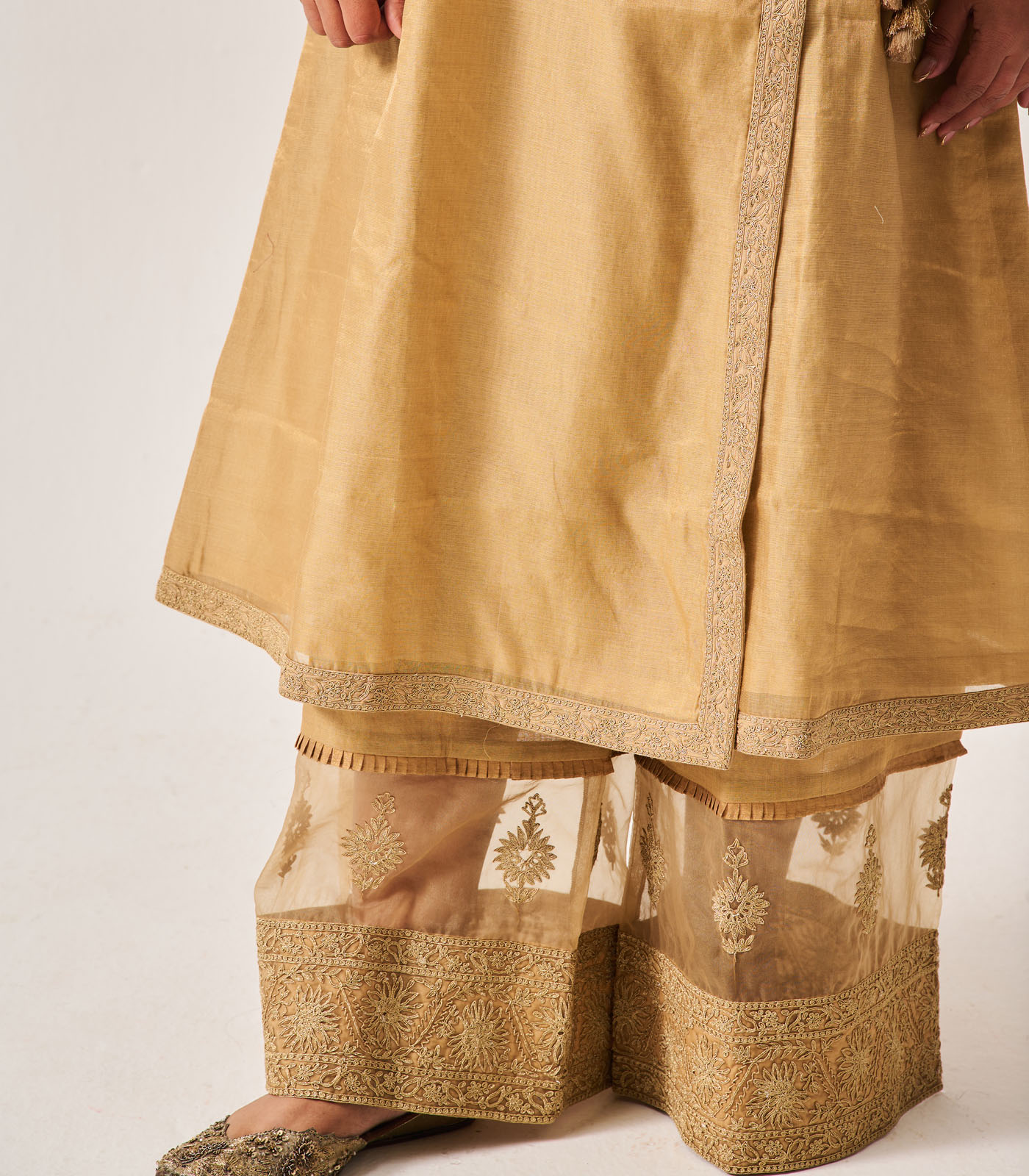 Angrakha Anarkali with Flare Pants and Dupatta / Tissue Woven / Beige / Golden Bloom / Dori/Hand Embroidery