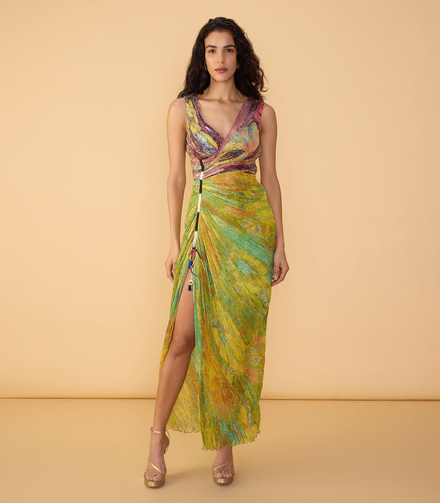 Dual abstract floral print surplice bodice, hand micro pleat dress with adjustable mirror and tassle hand embroidered side drawstring detailing