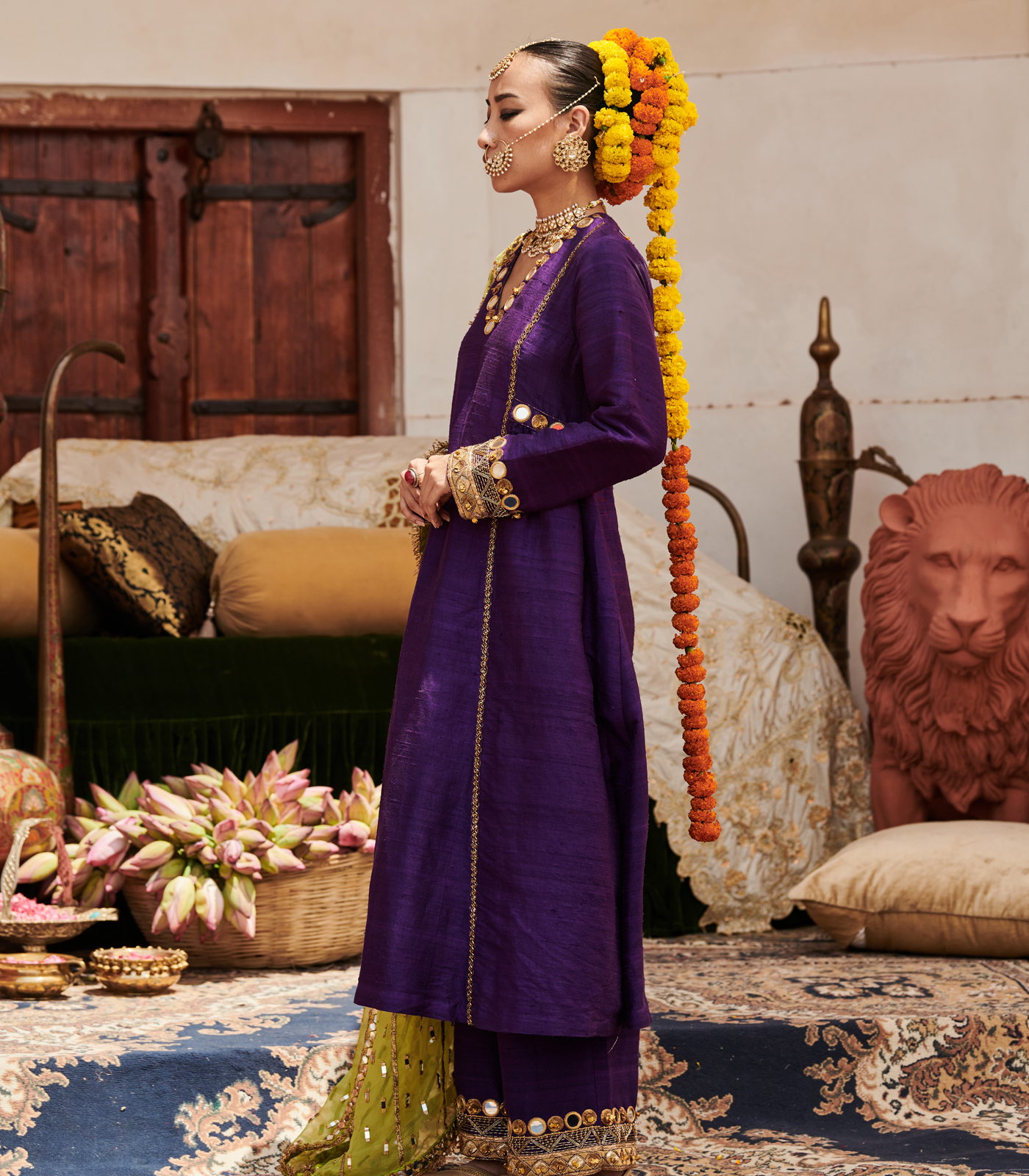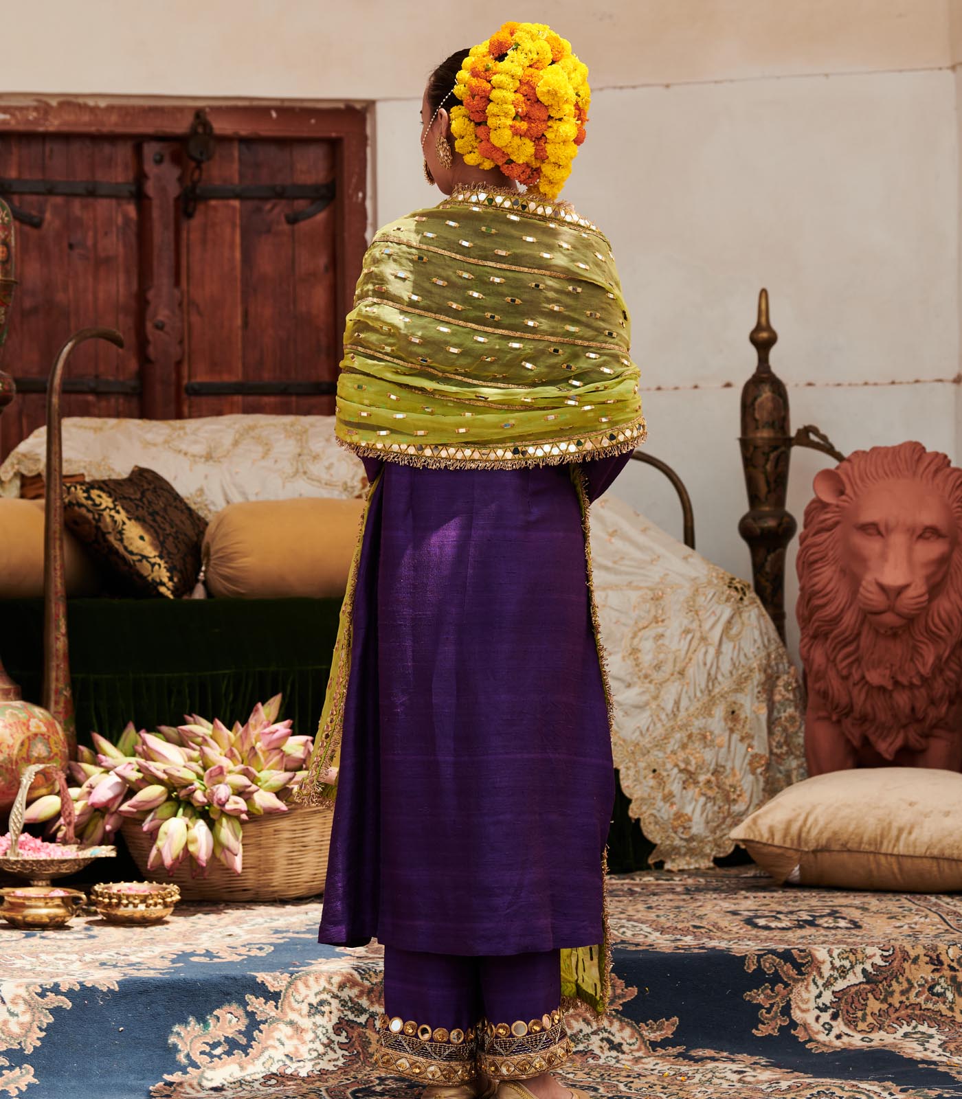 Purple Raw Silk Sharara set with mirror work on neckline and sleeves paired with matching pants and contrasting lime green organza dupatta.