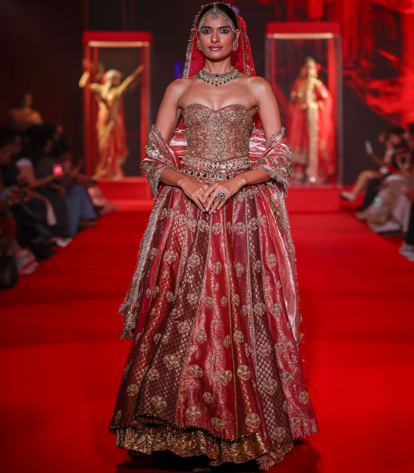 This set consists of a magenta, red, purple and brown panelled embroidered lehenga paired with a panelled intricate embroidered corset and organza embroidered dupatta.