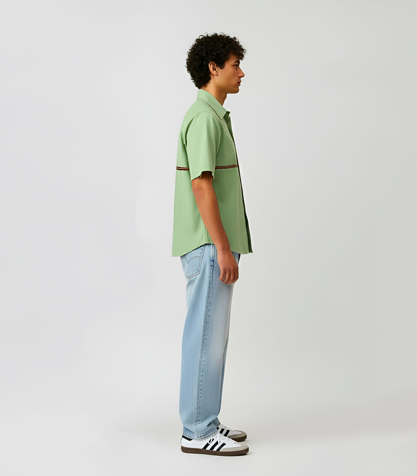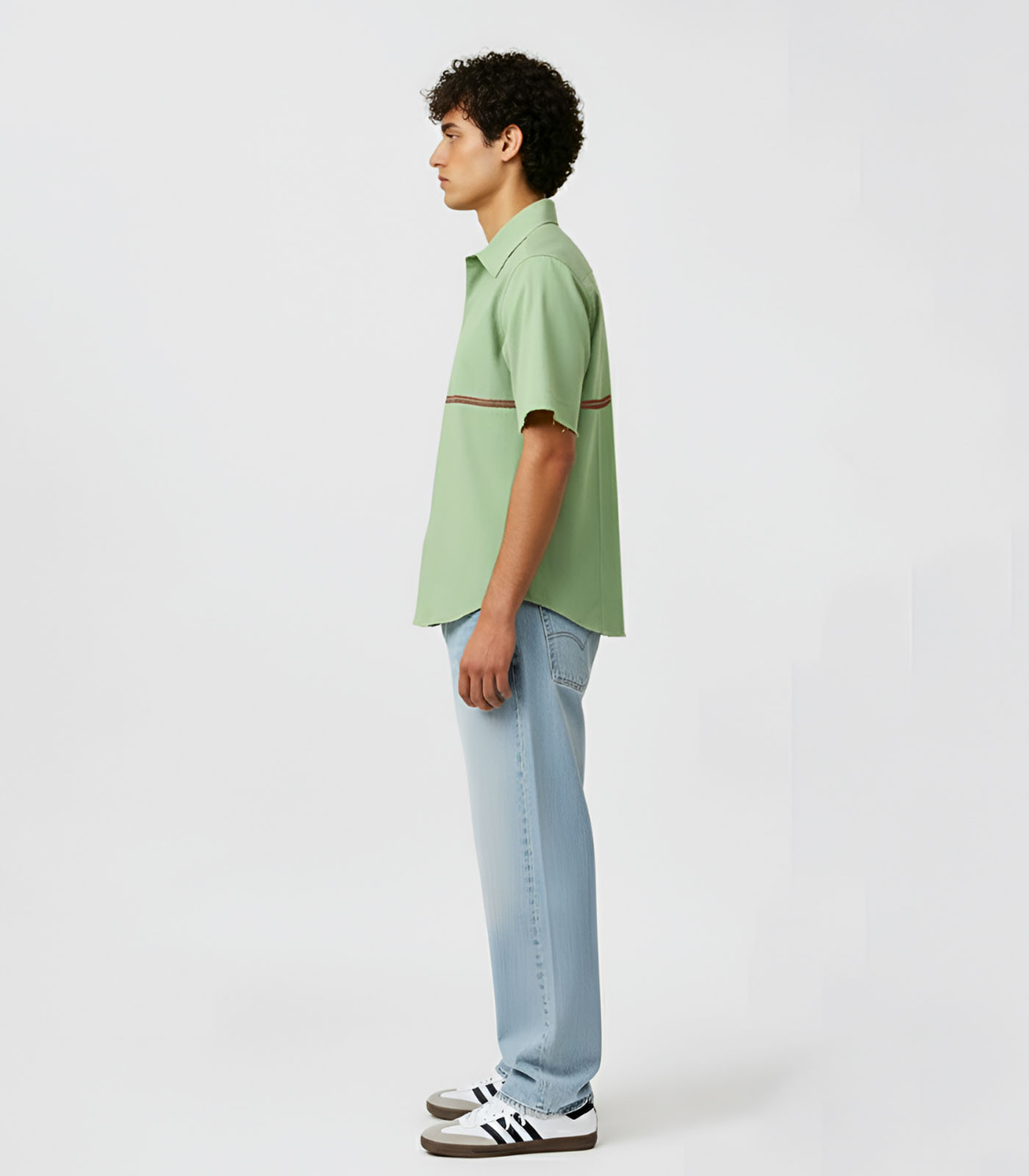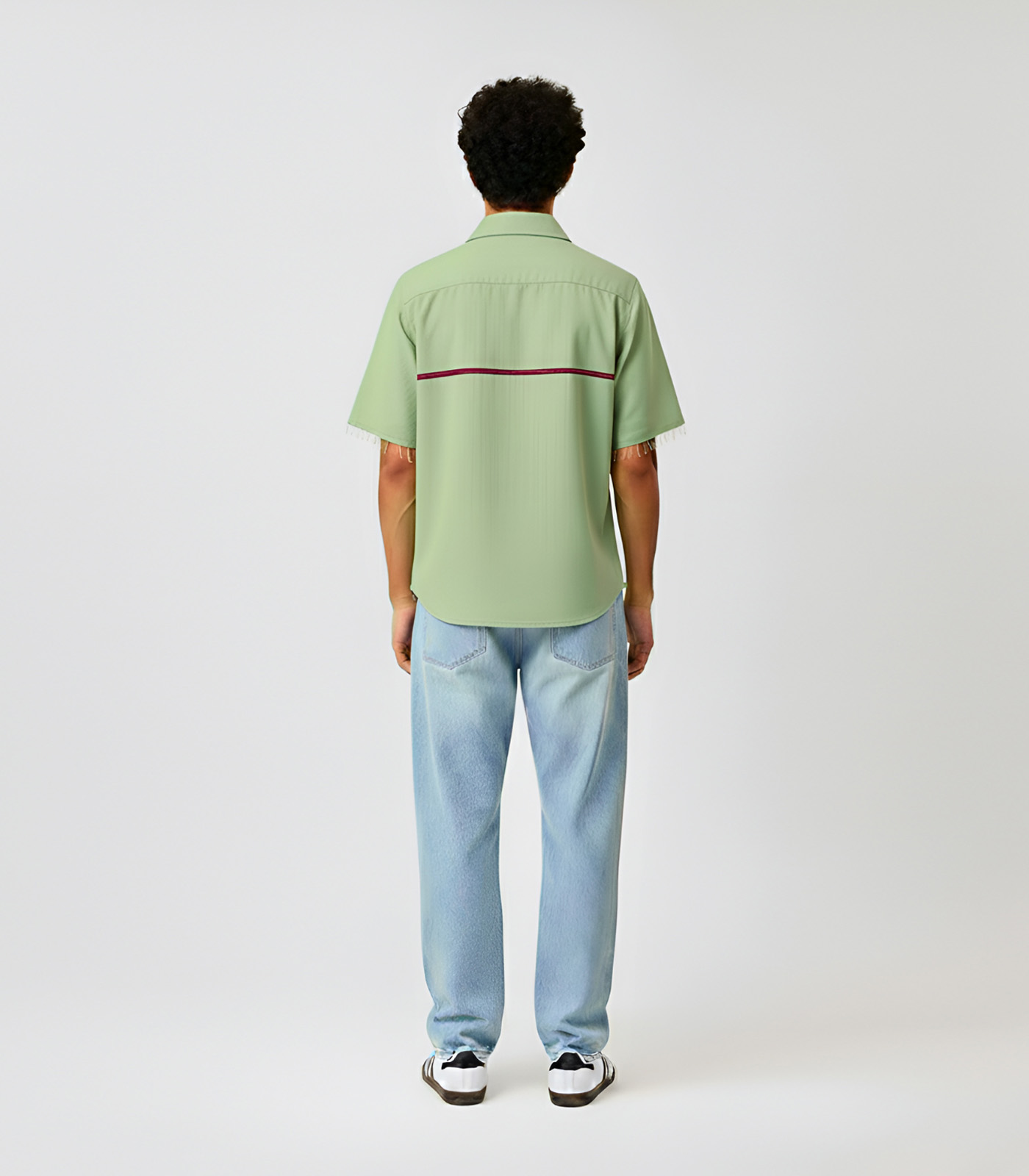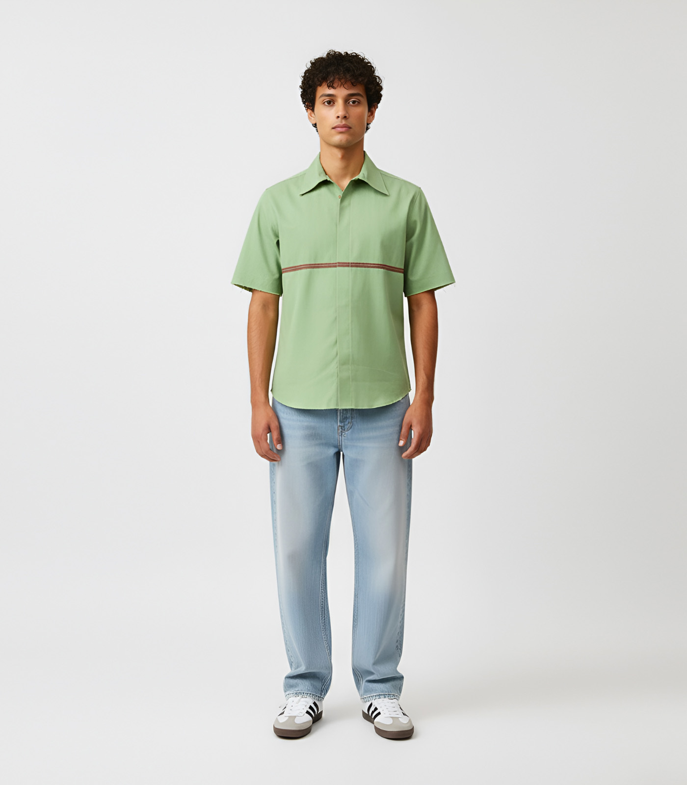 This asparagus green and tuscan red shirt is designed with a clean, structured silhouette and tuscan red horizontal stripe accent on the front. It features basic half sleeves with a horizontal stripe in the back and is finished with a classic collar. Easy to style for both work and everyday wear, this shirt combines function with a polished look.