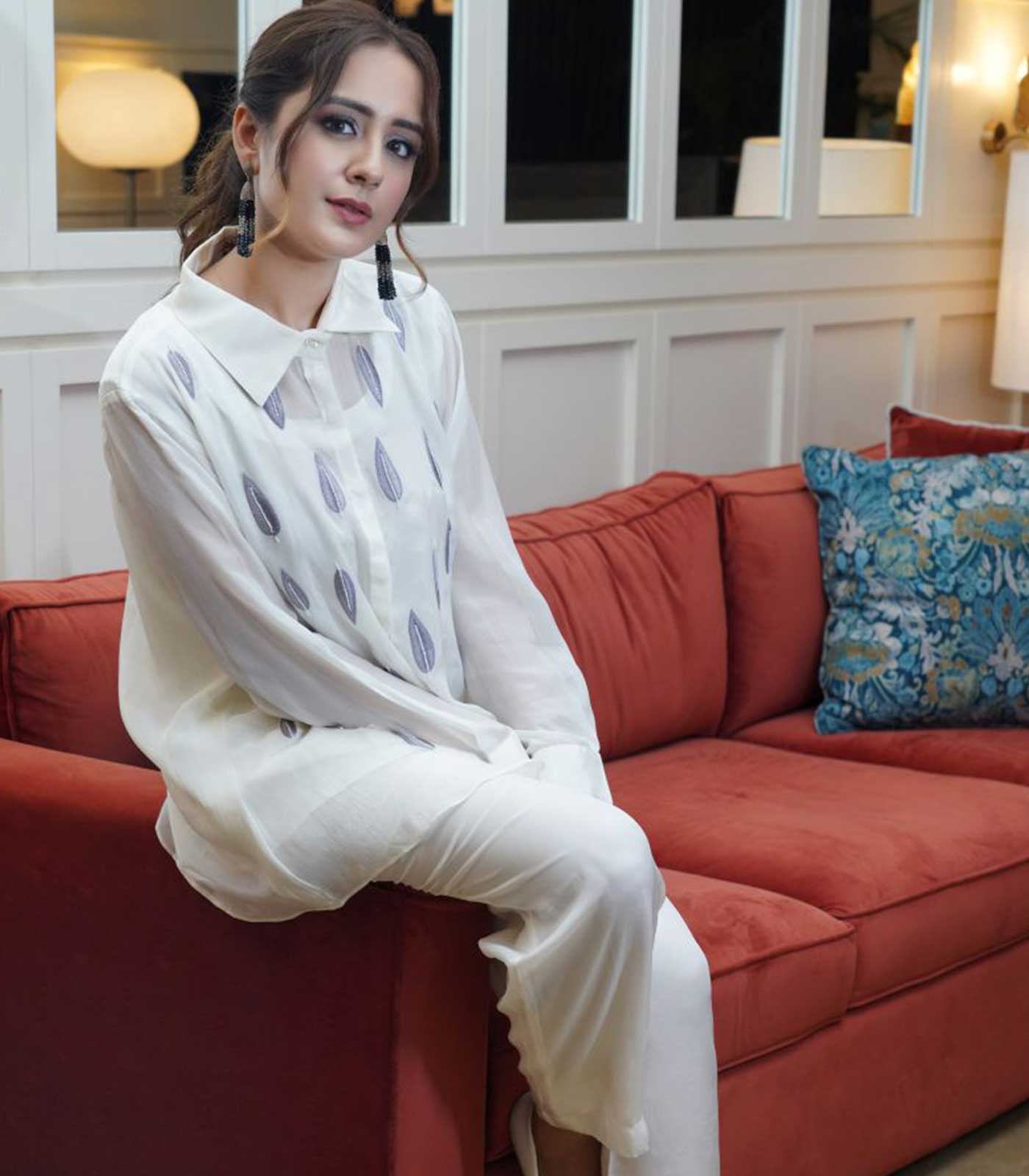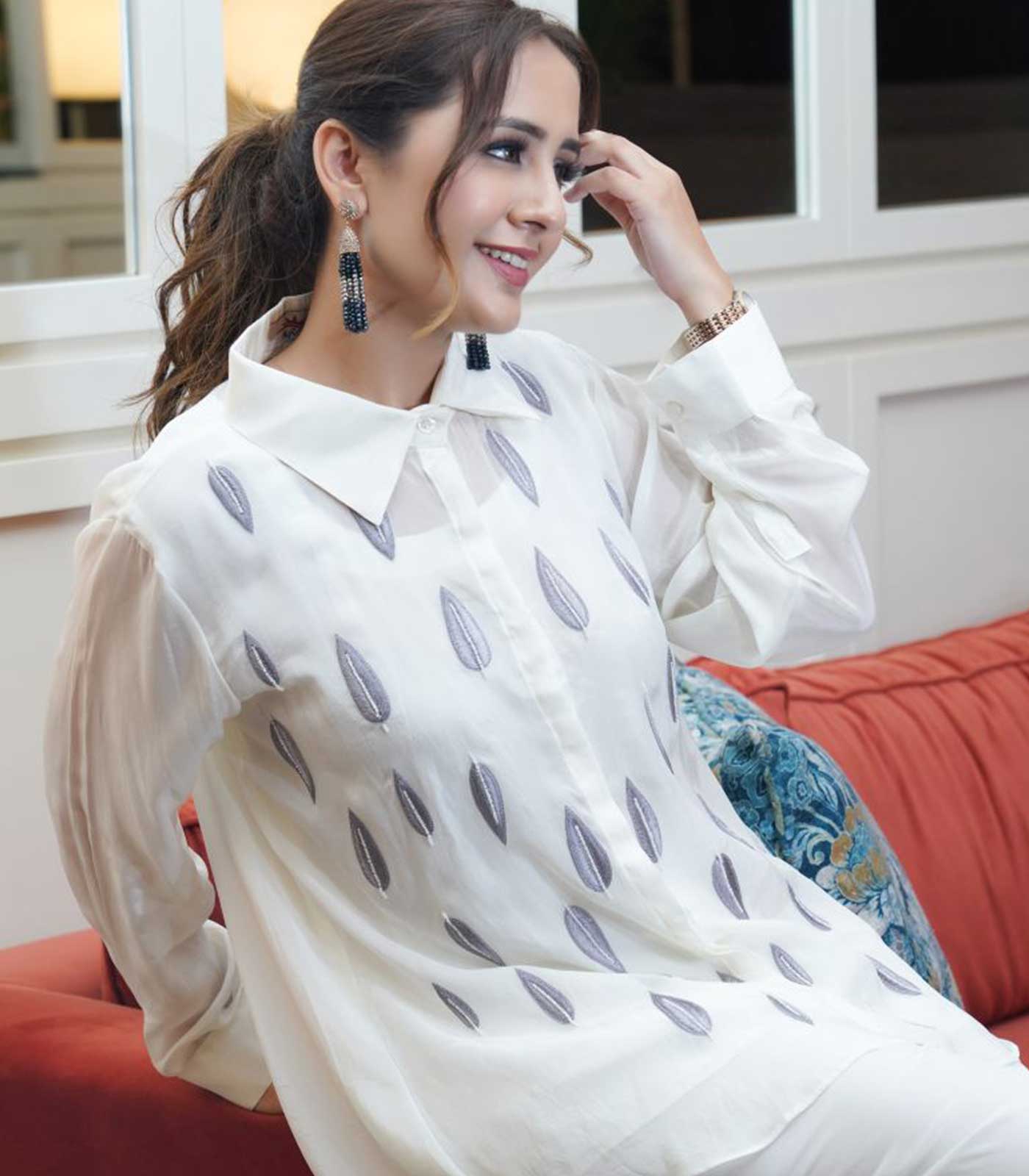 The white set’s asymmetric collar neck exudes both grace and confidence with its electrifying presence.