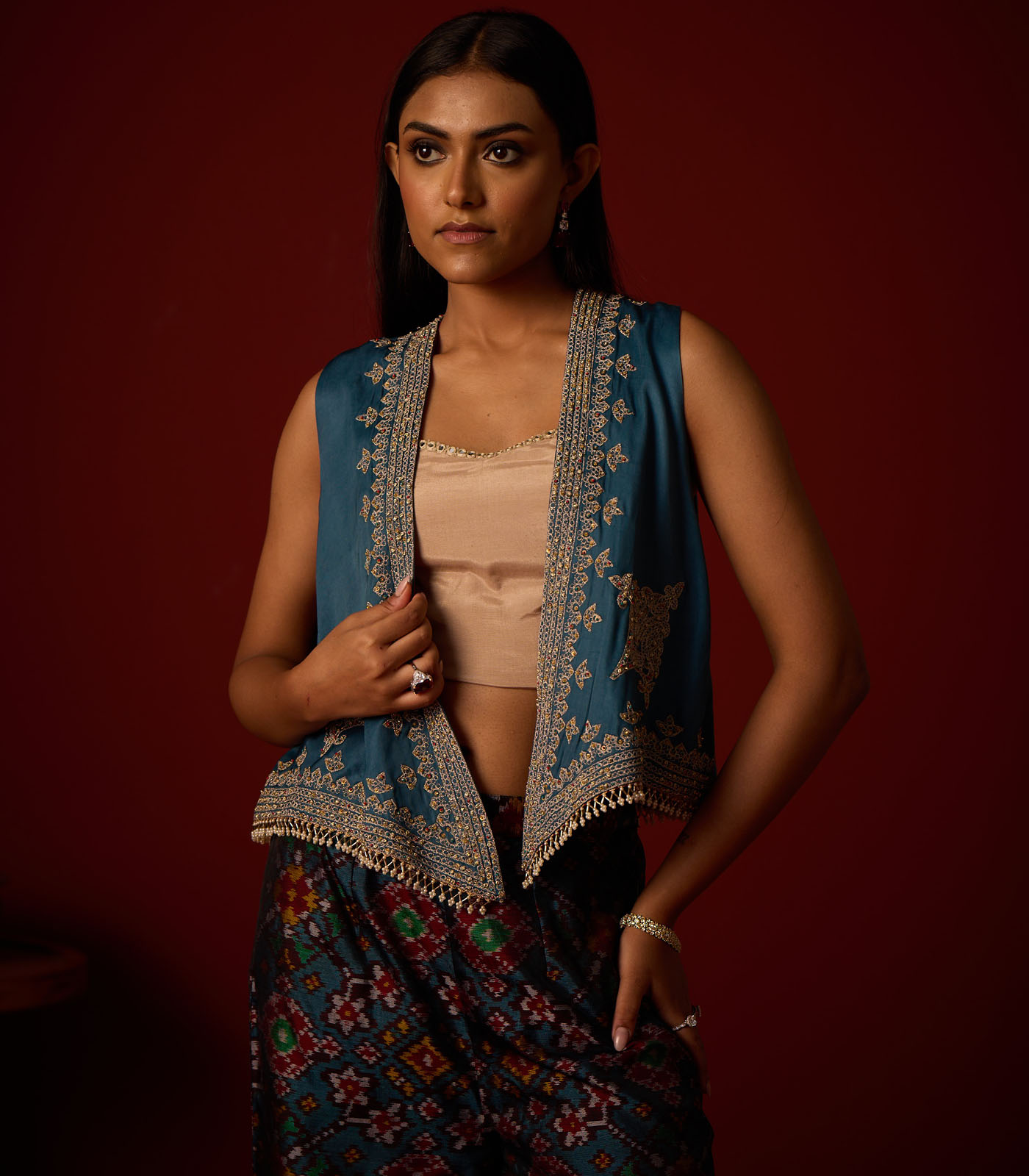 Satin Silk Asymmetrical Gilet With Marodiwork, Enhanced With Beadwork And Tassel details