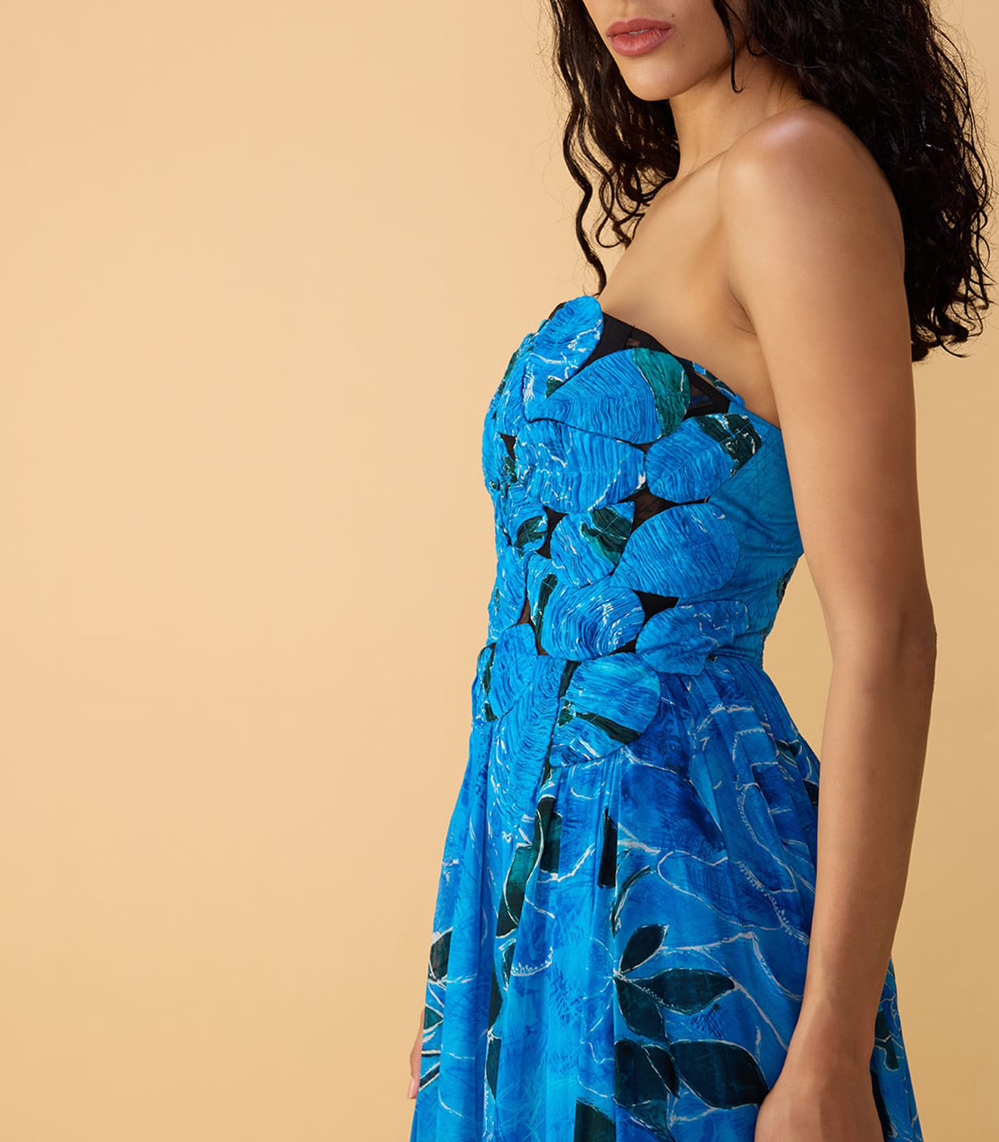 Abstract rose print sleeveless gown with intricate hand embroidered cutwork applique bodice