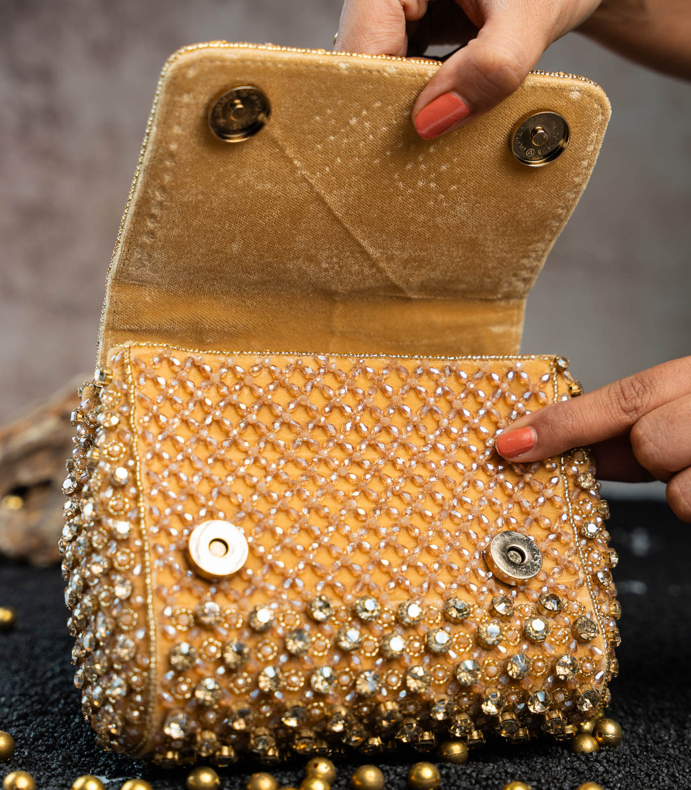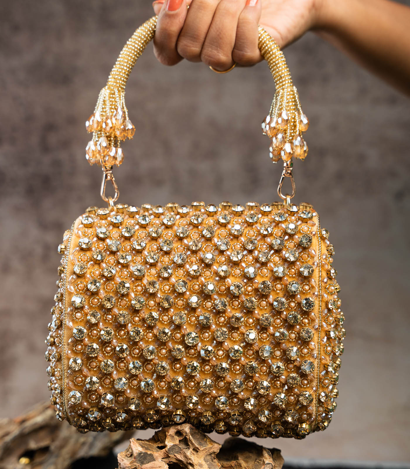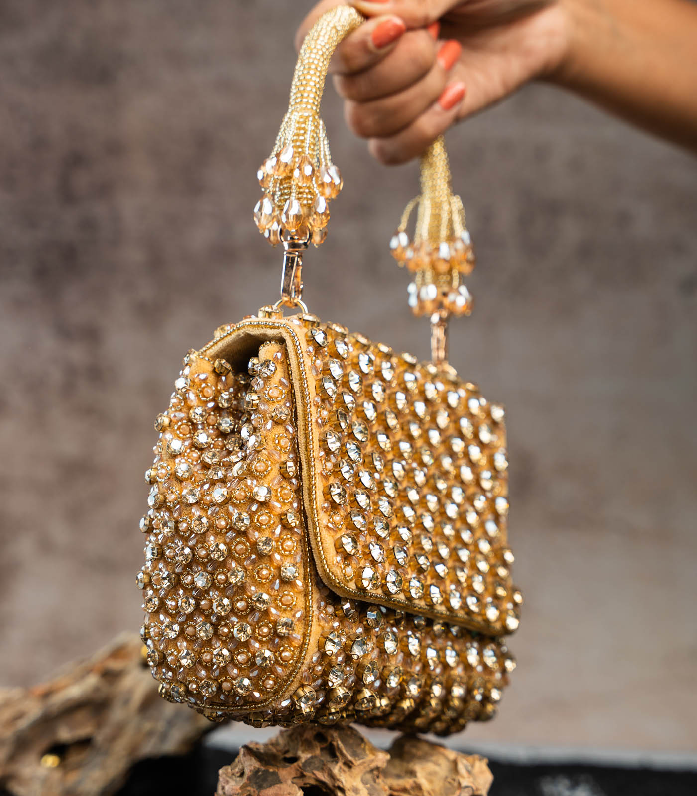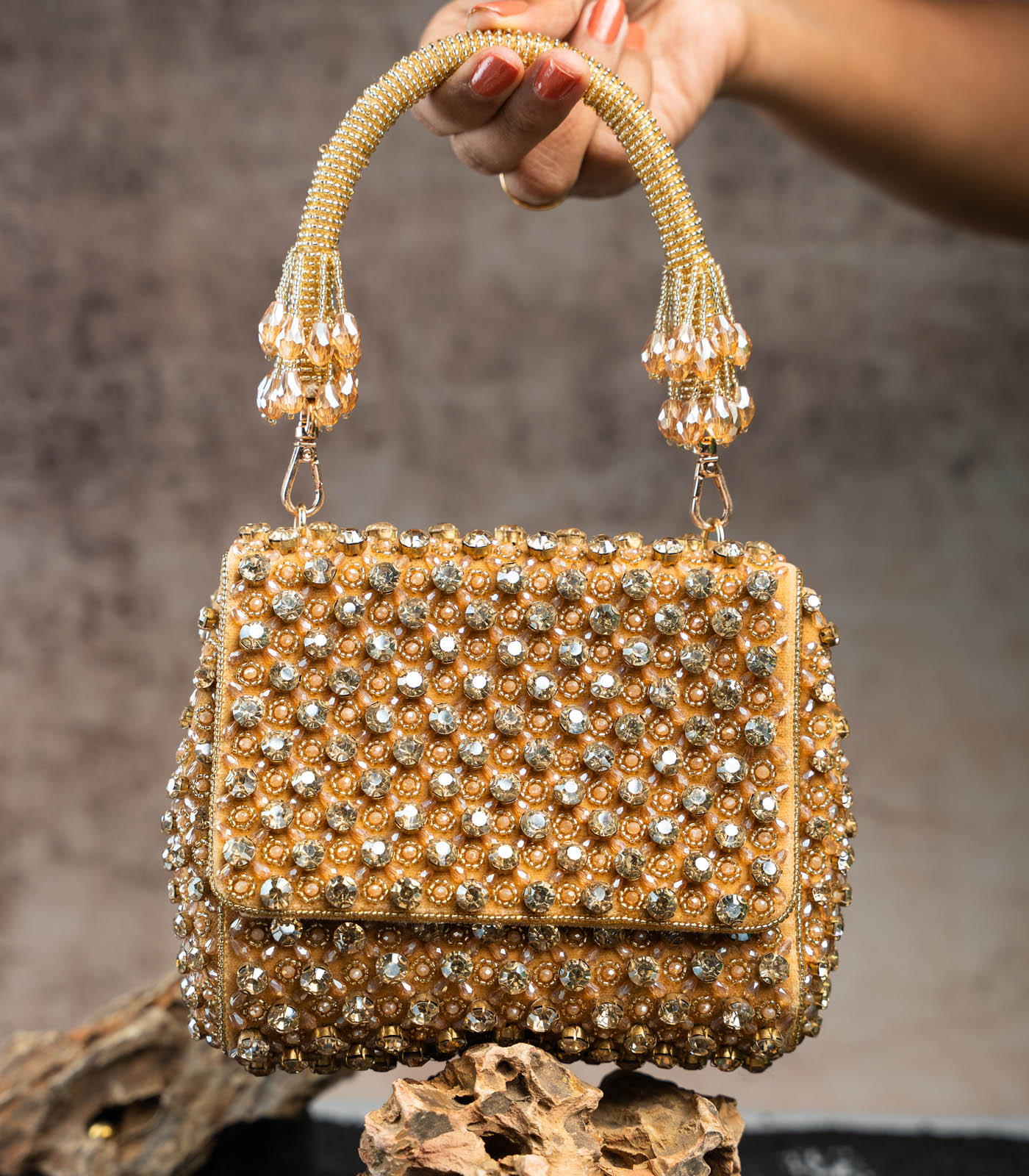 a gold mini bag adorned with shimmering crystals and intricate bead work. Perfect for adding a touch of elegance and sparkle to any special occasion, this clutch blends traditional artistry with a modern, sophisticated design. comes with a dazzling beaded handle finish making it a convenient and fashionable addition.