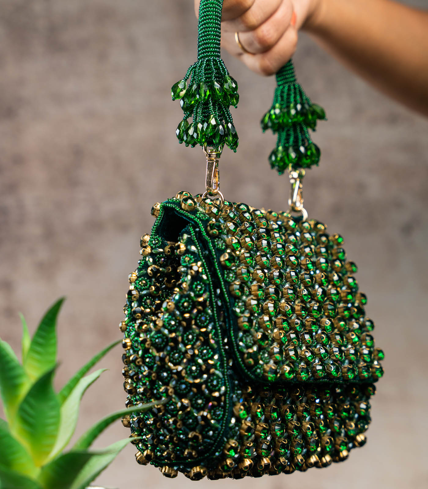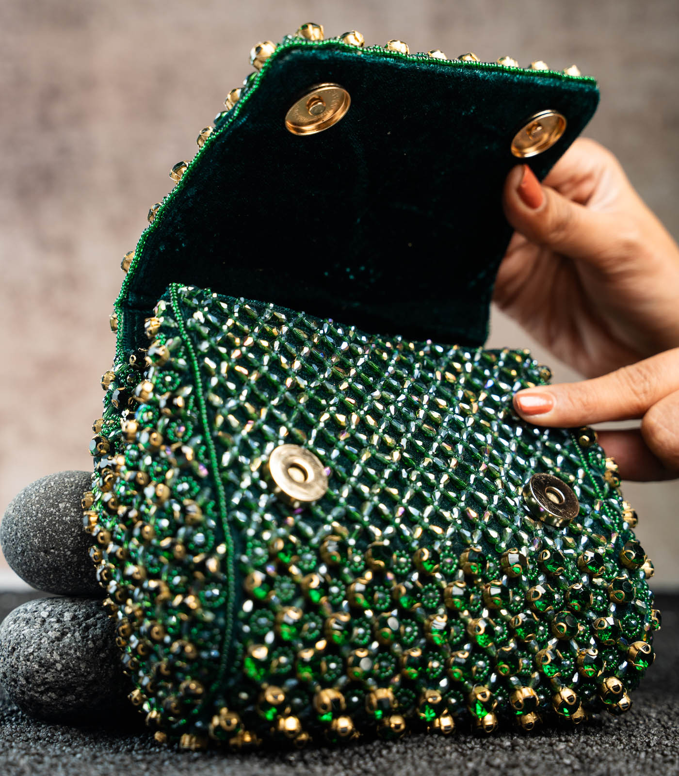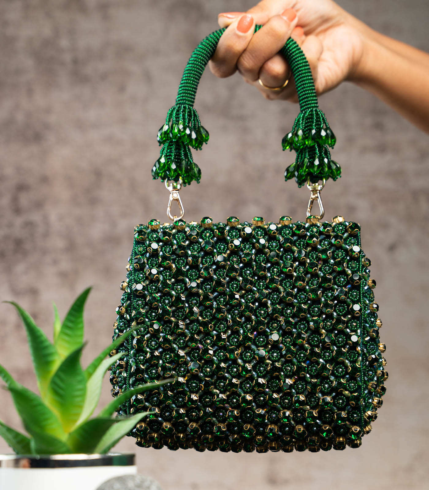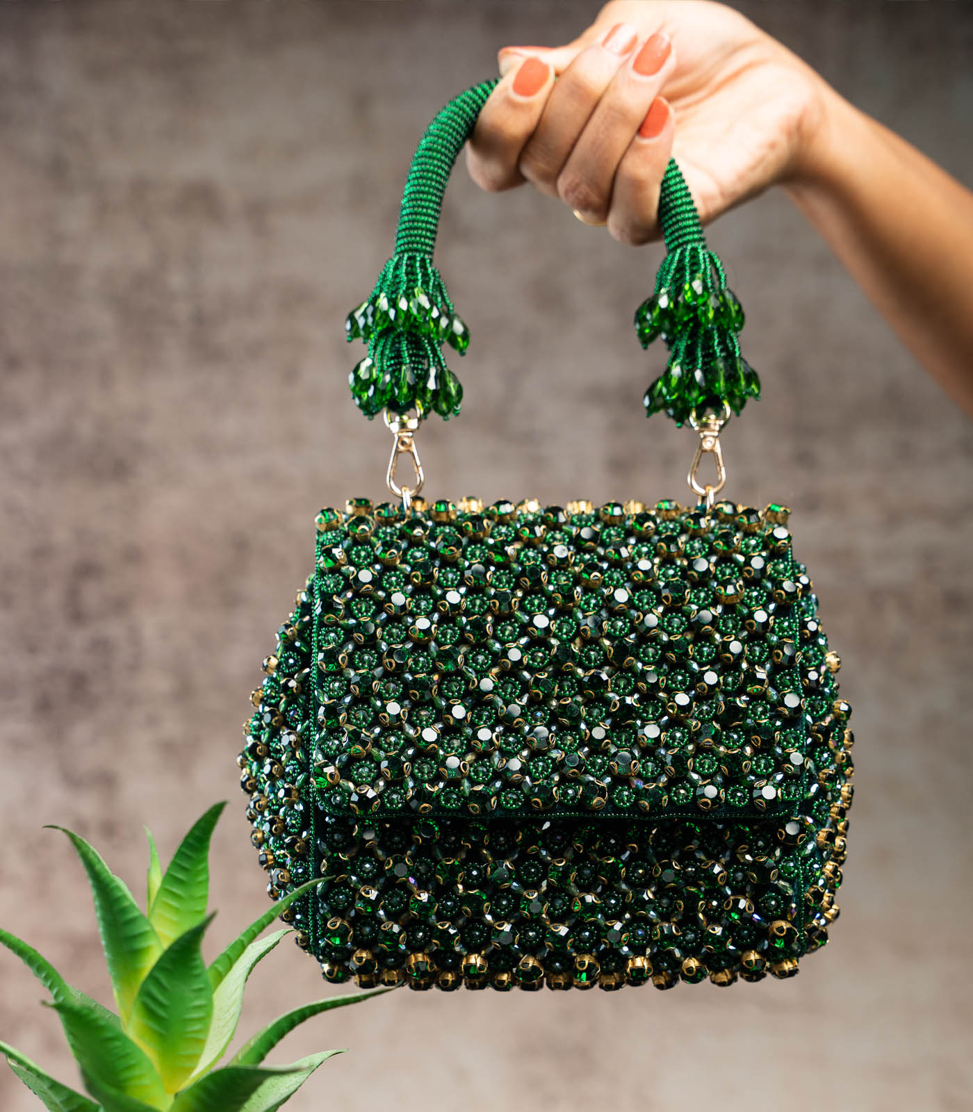 an emerald green mini bag adorned with shimmering crystals and intricate bead work. Perfect for adding a touch of elegance and sparkle to any special occasion, this clutch blends traditional artistry with a modern, sophisticated design. comes with a dazzling beaded handle finish making it a convenient and fashionable addition.