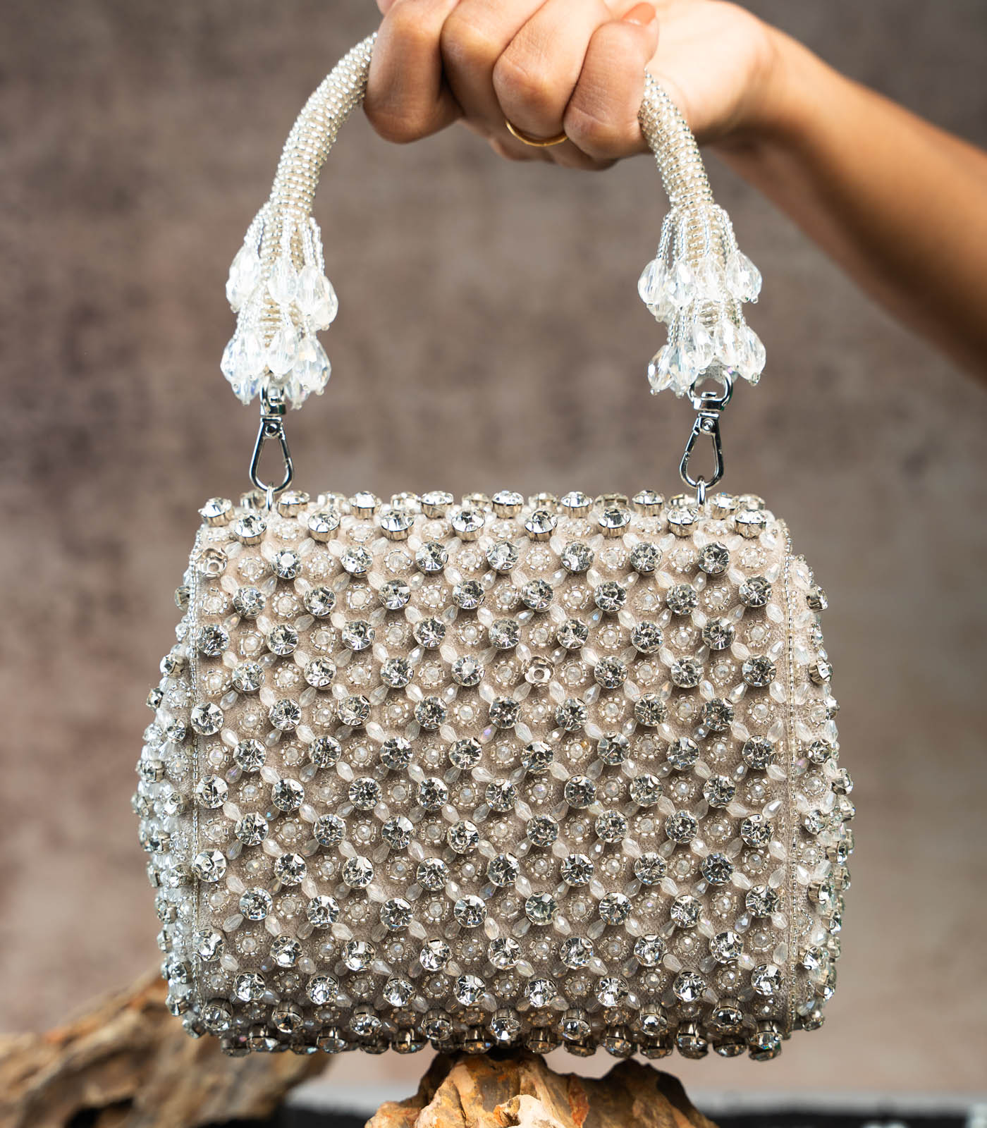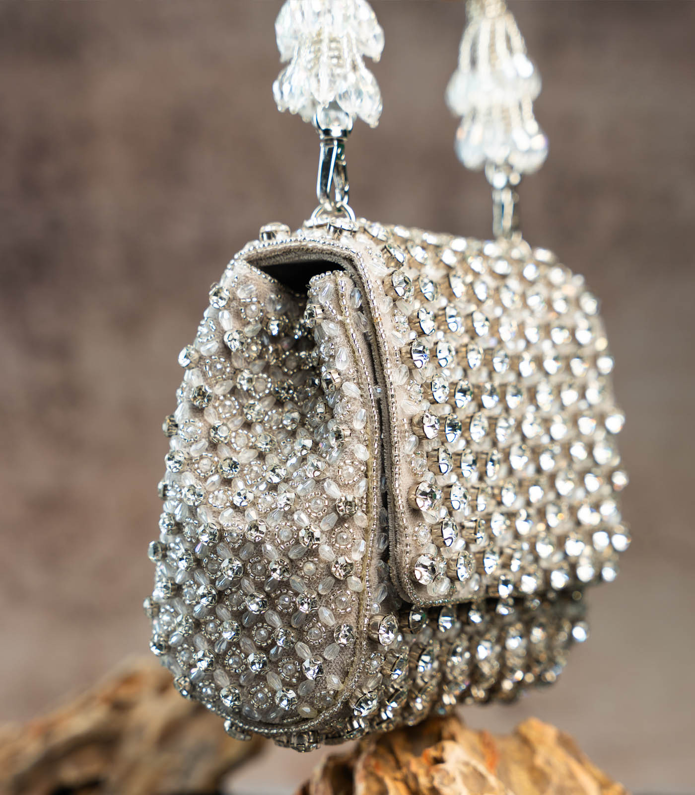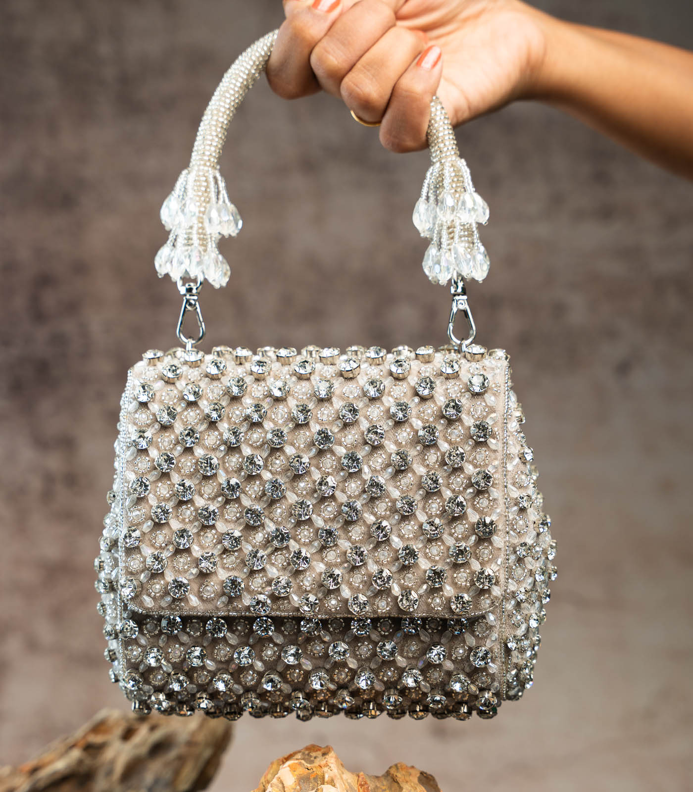 a silver mini bag adorned with shimmering crystals and intricate bead work. Perfect for adding a touch of elegance and sparkle to any special occasion, this clutch blends traditional artistry with a modern, sophisticated design. comes with a dazzling beaded handle finish making it a convenient and fashionable addition.