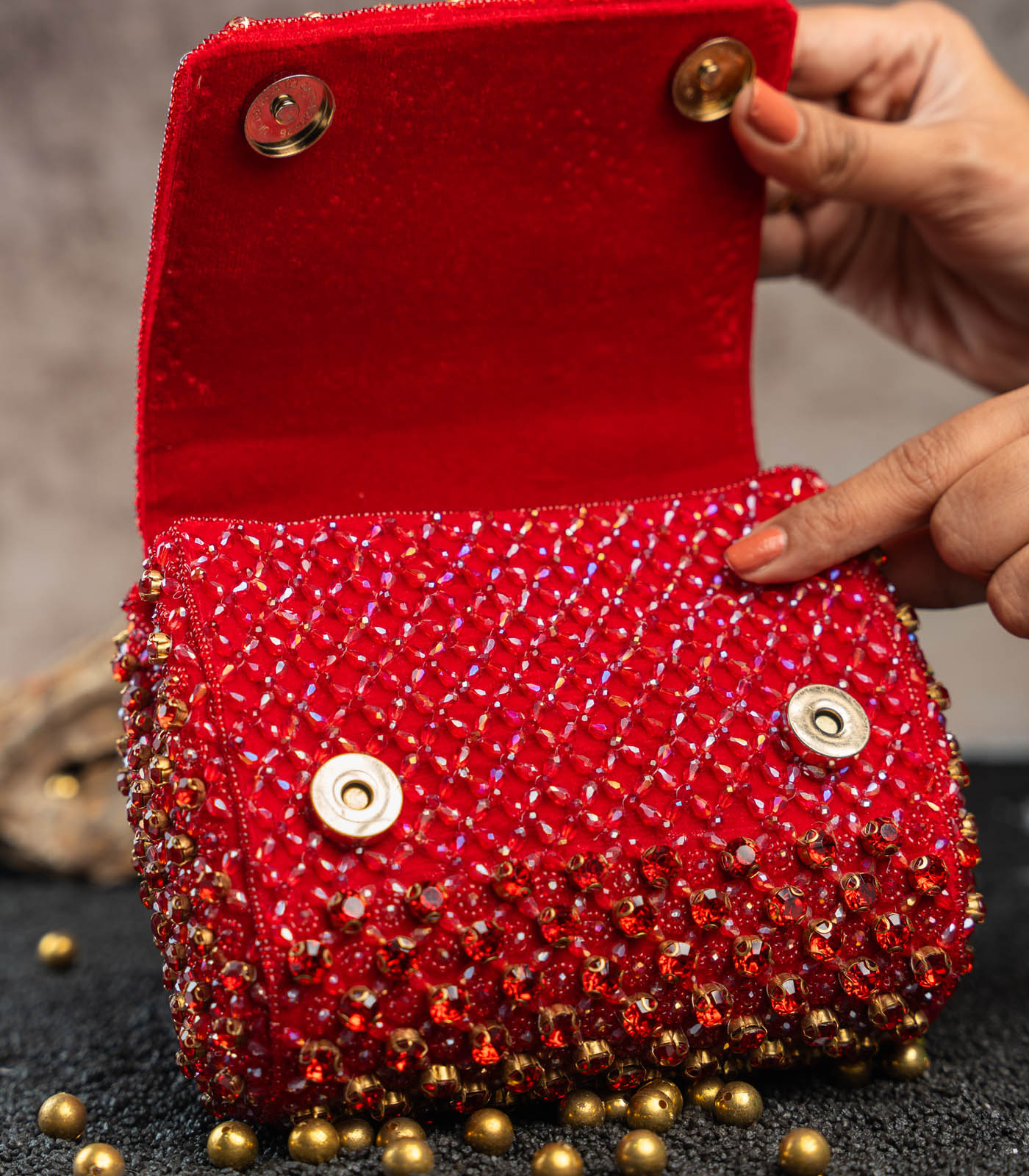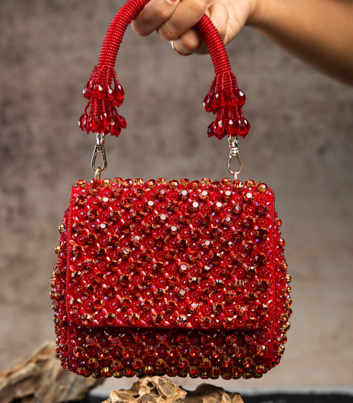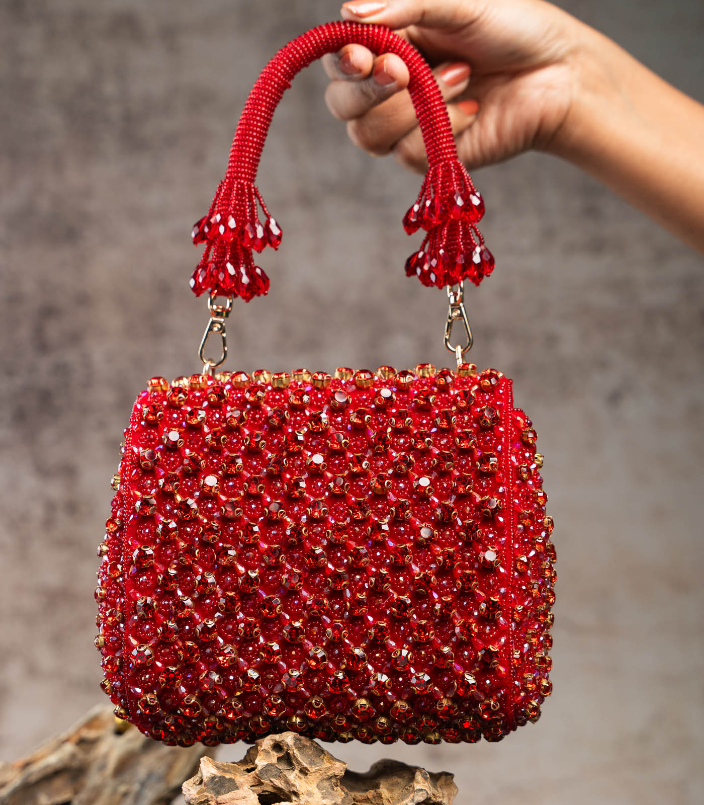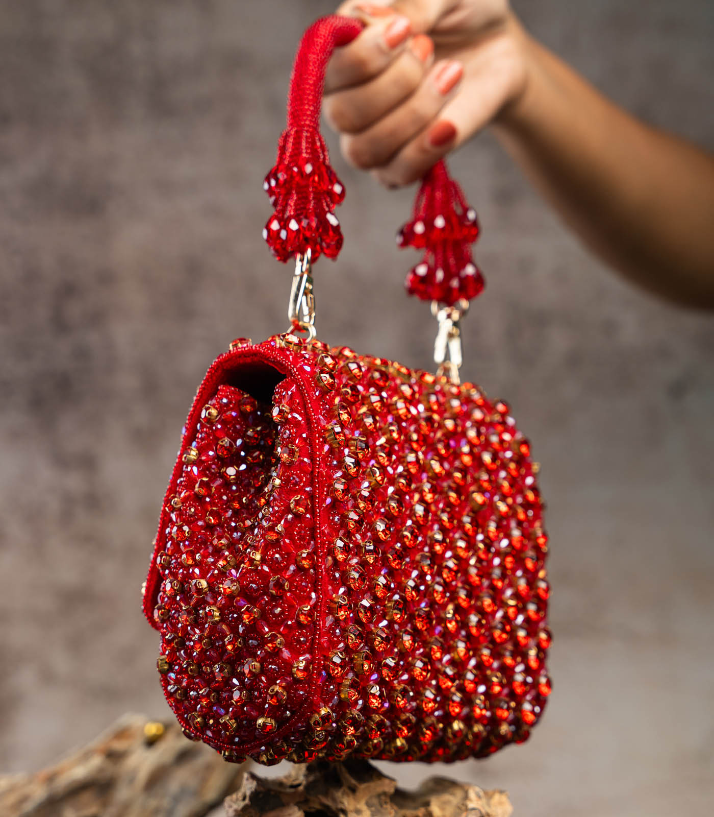 a wine mini bag adorned with shimmering crystals and intricate bead work. Perfect for adding a touch of elegance and sparkle to any special occasion, this clutch blends traditional artistry with a modern, sophisticated design. It comes with a dazzling beaded handle finish making it a convenient and fashionable addition.