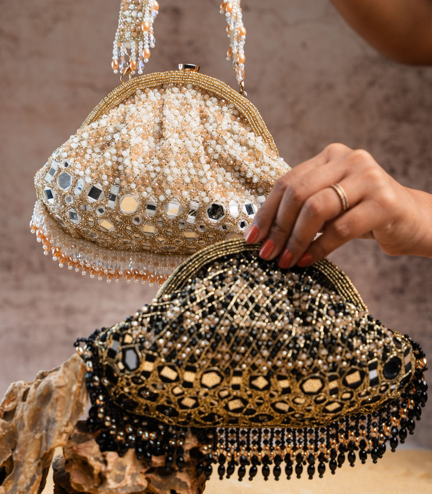 a stunning blend of tradition and elegance. This clutch is adorned with sparkling mirrors, pearls and intricate bead work, all in a sophisticated black hue. The mirror finishing adds a luxurious touch, while the beadwork brings a playful yet elegant flair. Perfect for special occasions, this potli is designed to catch the light and elevate your ensemble.