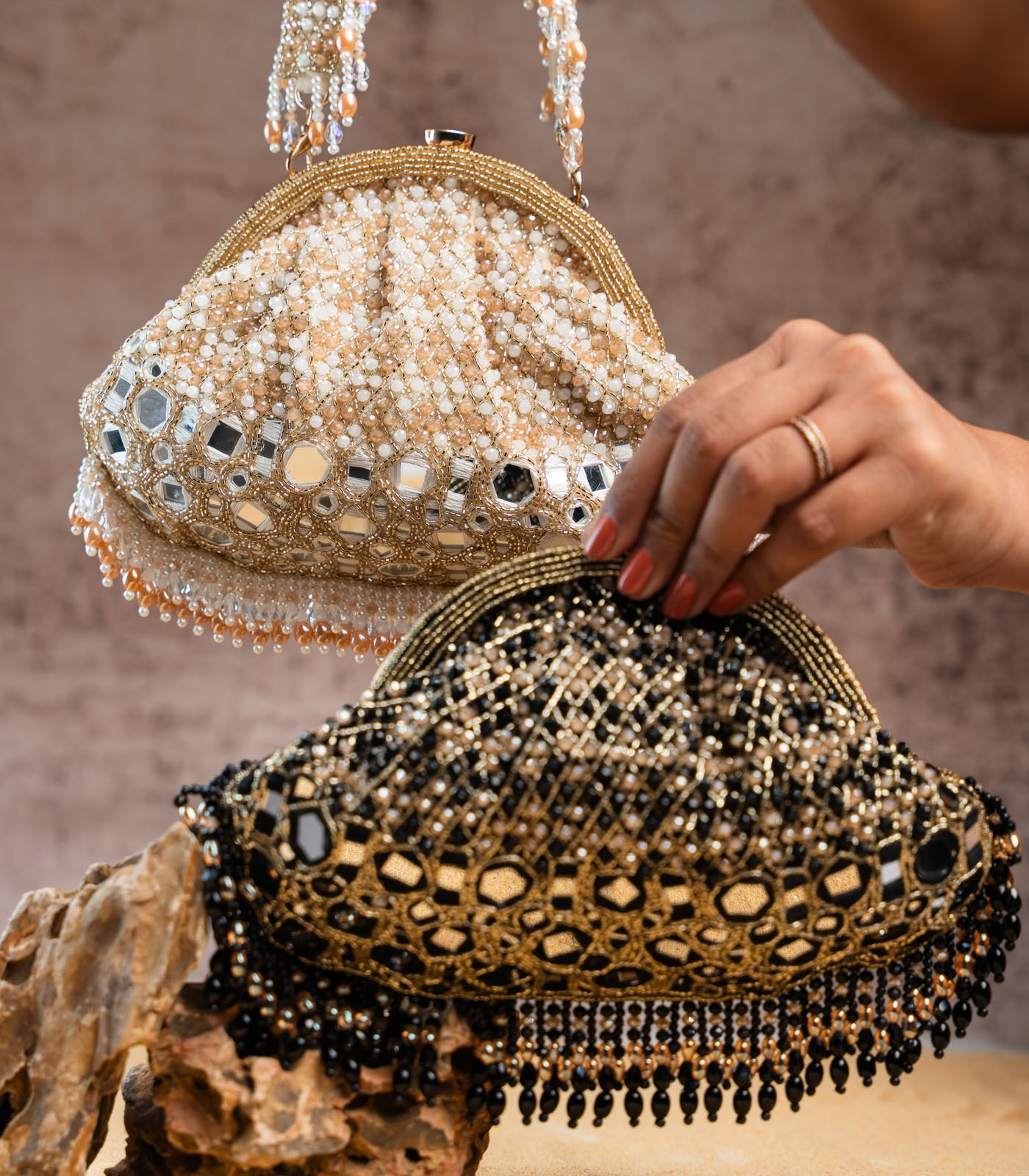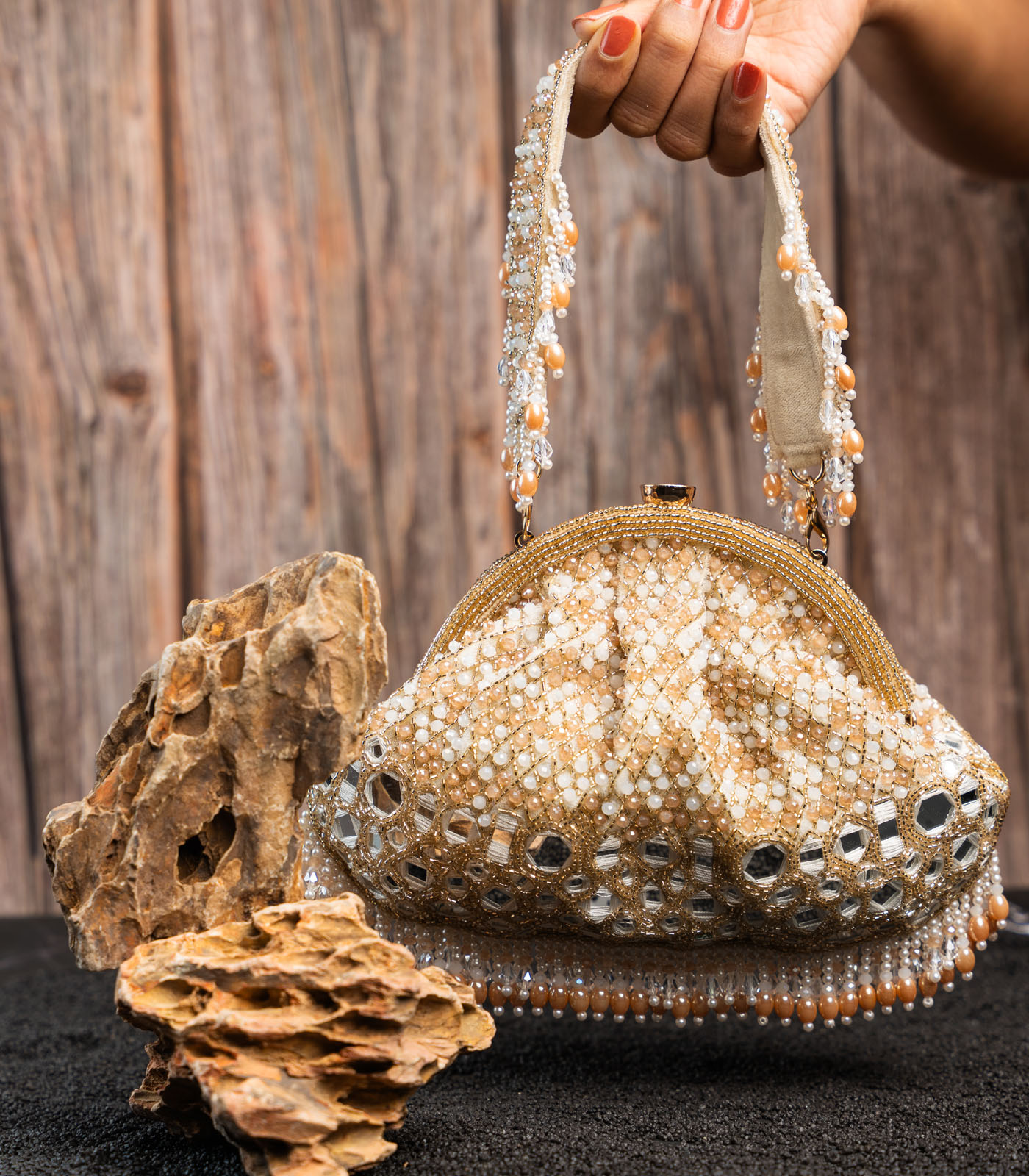 a stunning blend of tradition and elegance. This clutch is adorned with sparkling mirrors, pearls and intricate bead work, all in a sophisticated gold hue. The mirror finishing adds a luxurious touch, while the beadwork brings a playful yet elegant flair. Perfect for special occasions, this potli is designed to catch the light and elevate your ensemble.