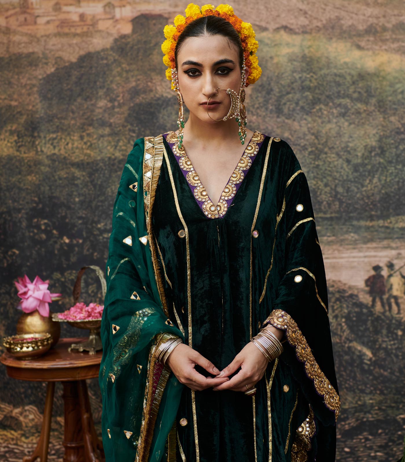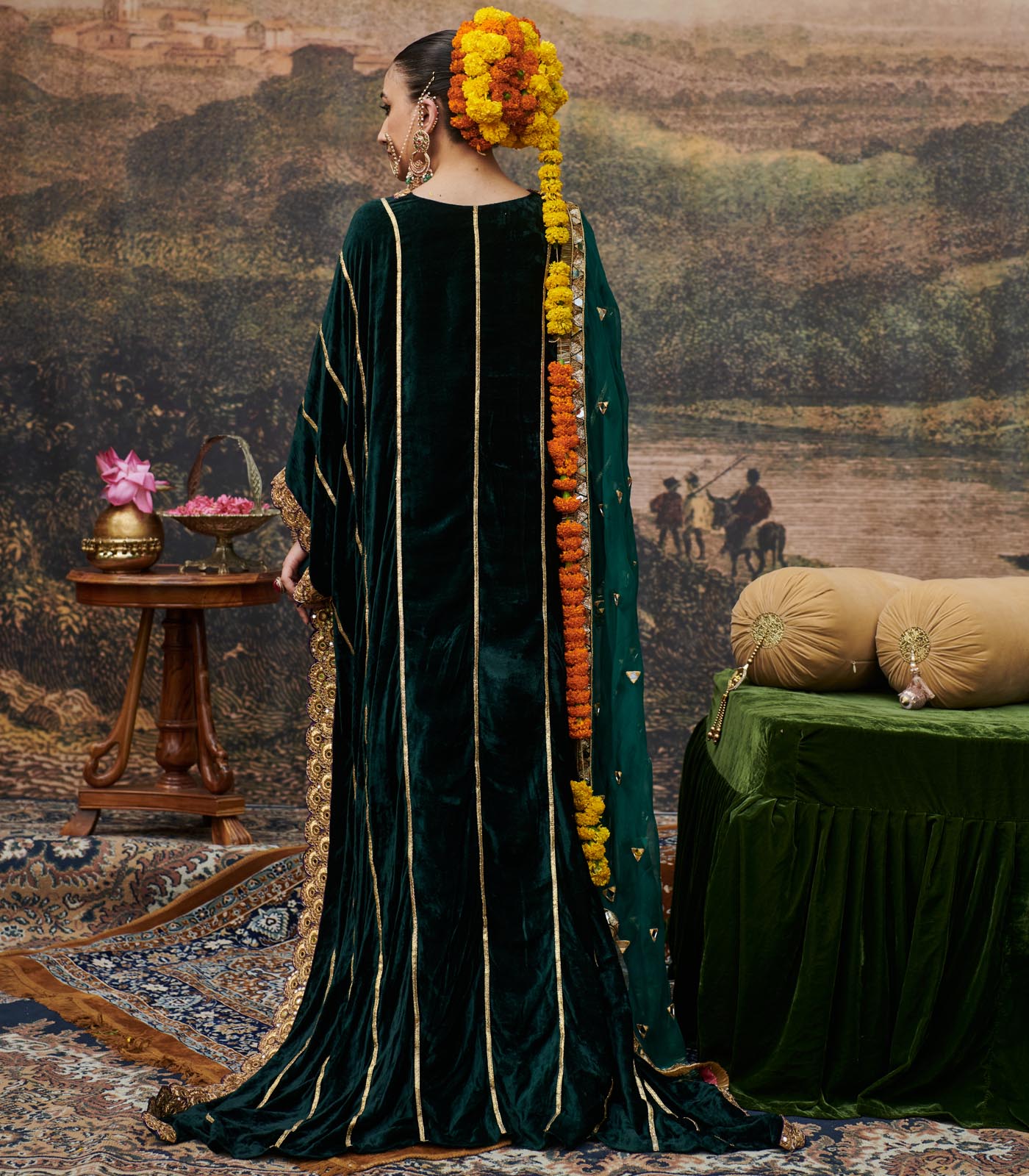 This green kaftan set in rich velvet fabric adorned with delicate gotta patti antique sequins are meticulously embroidered on kaftan.