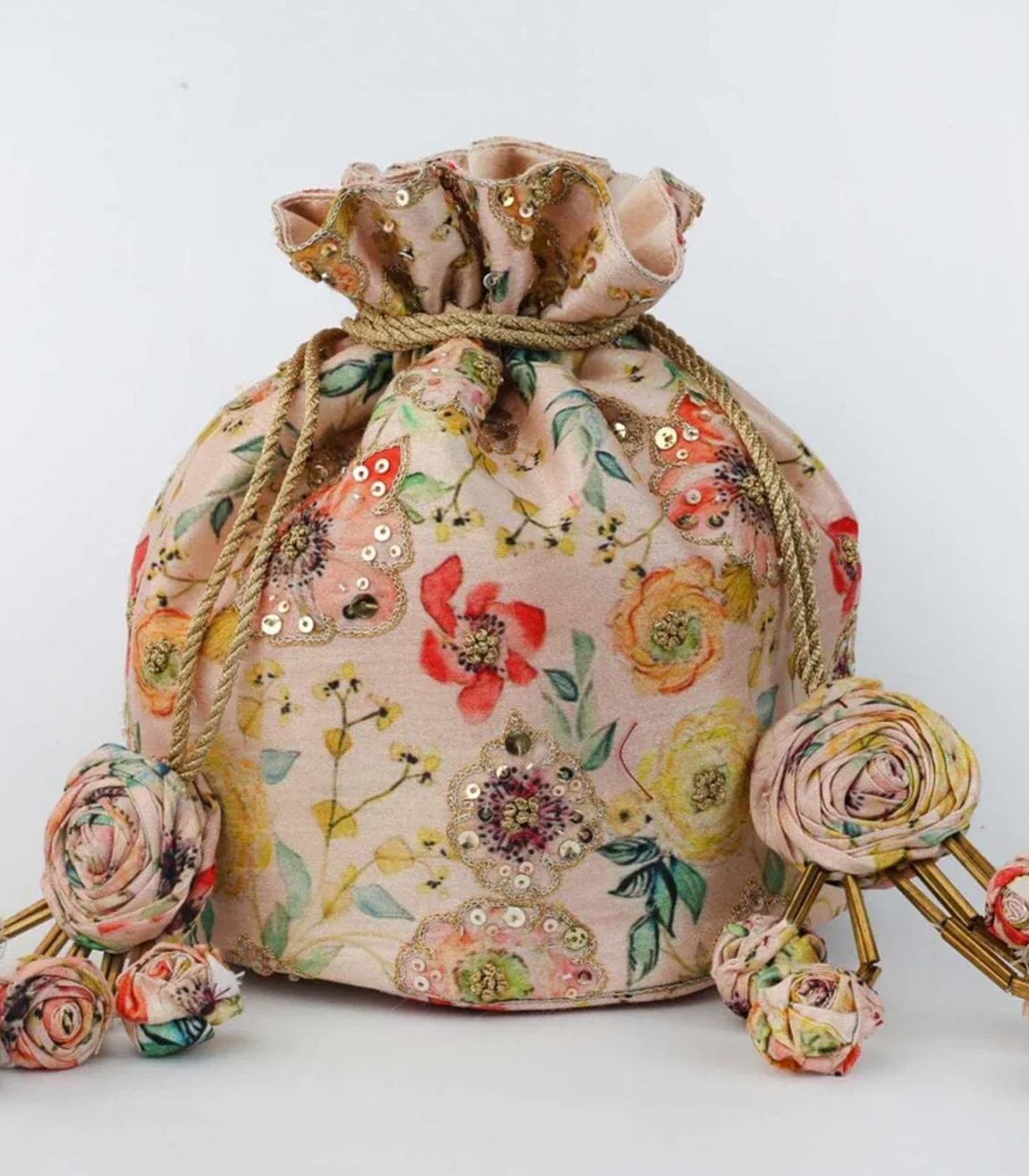 All over floral print with blush pink base. Embroidery highlighted with french knot, different shade of light gold sequinces and zari work. Potlis come with beautifully hand made flower tassels which is the USP of the brand.