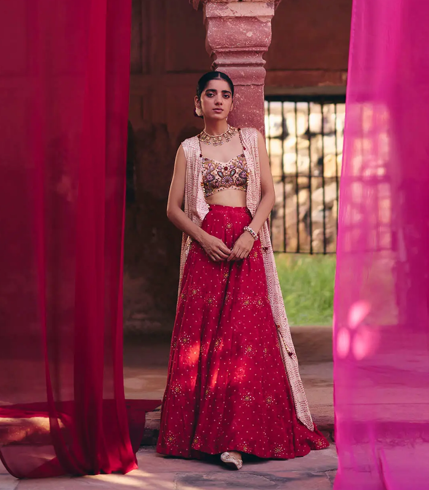 Bandhani cape teamed with a hand work bustier & printed sharara highlighed with threadwork buttis.