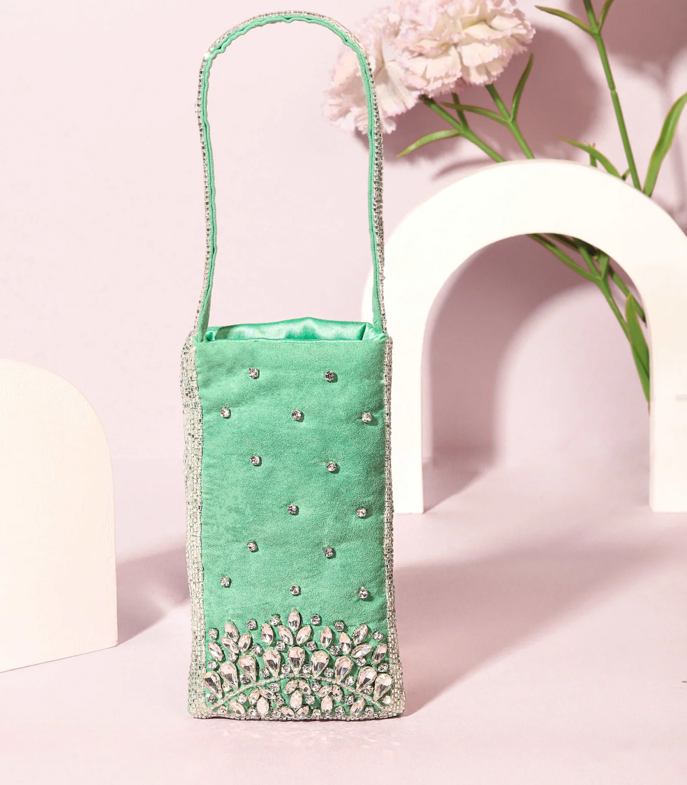 This intricate Rectangular Design Mobile Pouch highlighted with Rhinestones in a crown shape in a Stunning Green colour, adds another dimension to any outfit! This is perfect to keep any important IDs, money and your mobile!