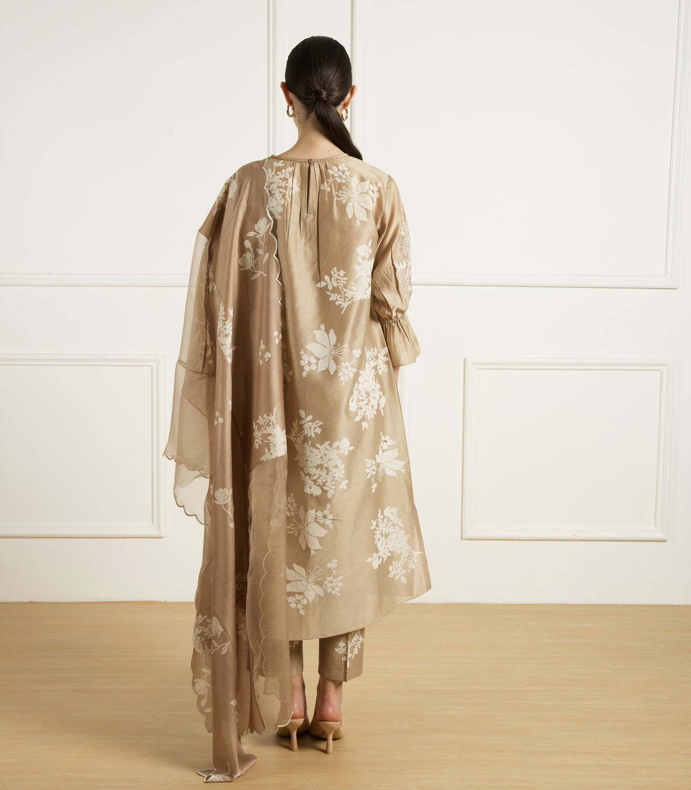 BEIGE DISCHARGE PRINT TUNIC IN SILK CHANDERI WITH DORI EMBROIDERY AND PANTS IN SILK CHANDERI