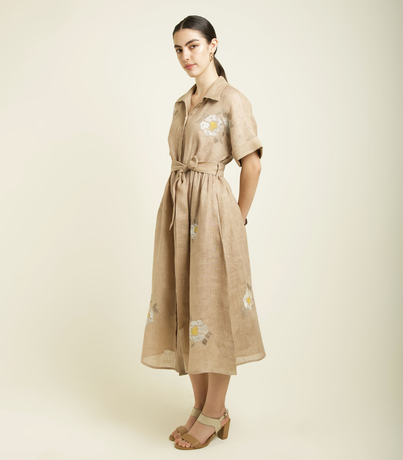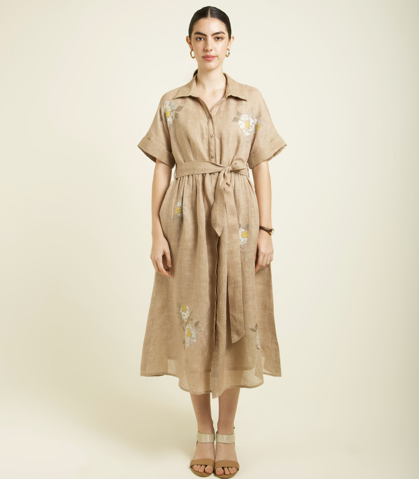 BEIGE EMBROIDED DROP SHOULDER DRESS IN GAUZE LINEN