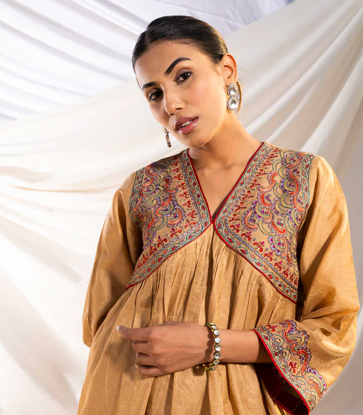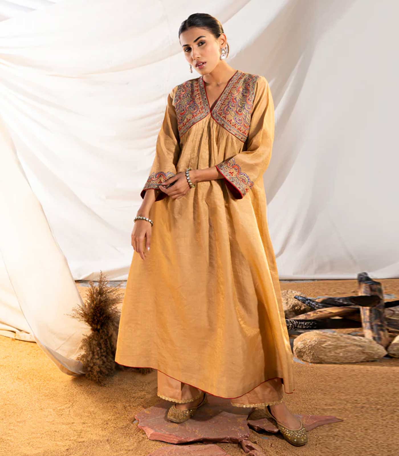 Beige Handloom Cotton Zari Kurta—an epitome of comfort and sophistication. Gathers envelop the silhouette around a rounded yoke, creating a graceful and relaxed fit. The yoke boasts intricate embroidery, drawing inspiration from the enchanting Suzani motifs, adding a touch of cultural allure to every stitch.