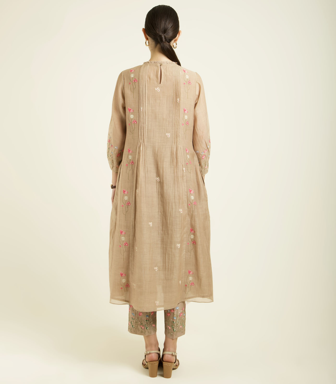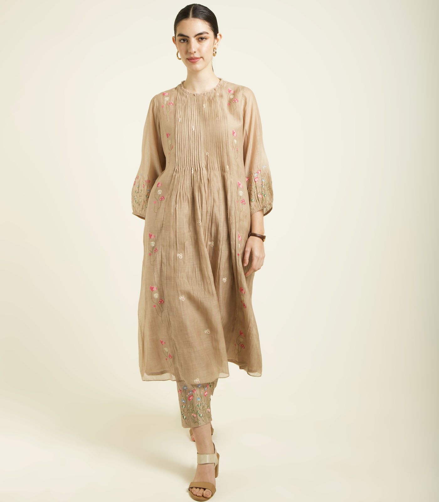 BEIGE MUL CHANDERI PLEATED TUNIC WITH STRAIGHT PRINTED PANTS IN SILK CHANDERI