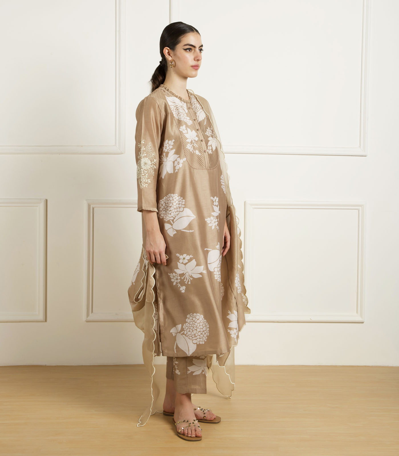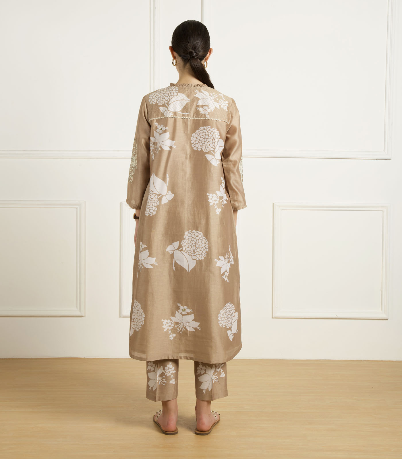 BEIGE PLEATED YOKE TUNIC IN SILK CHANDERI WITH DORI EMBROIDERY AND PANTS IN SILK CHANDERI