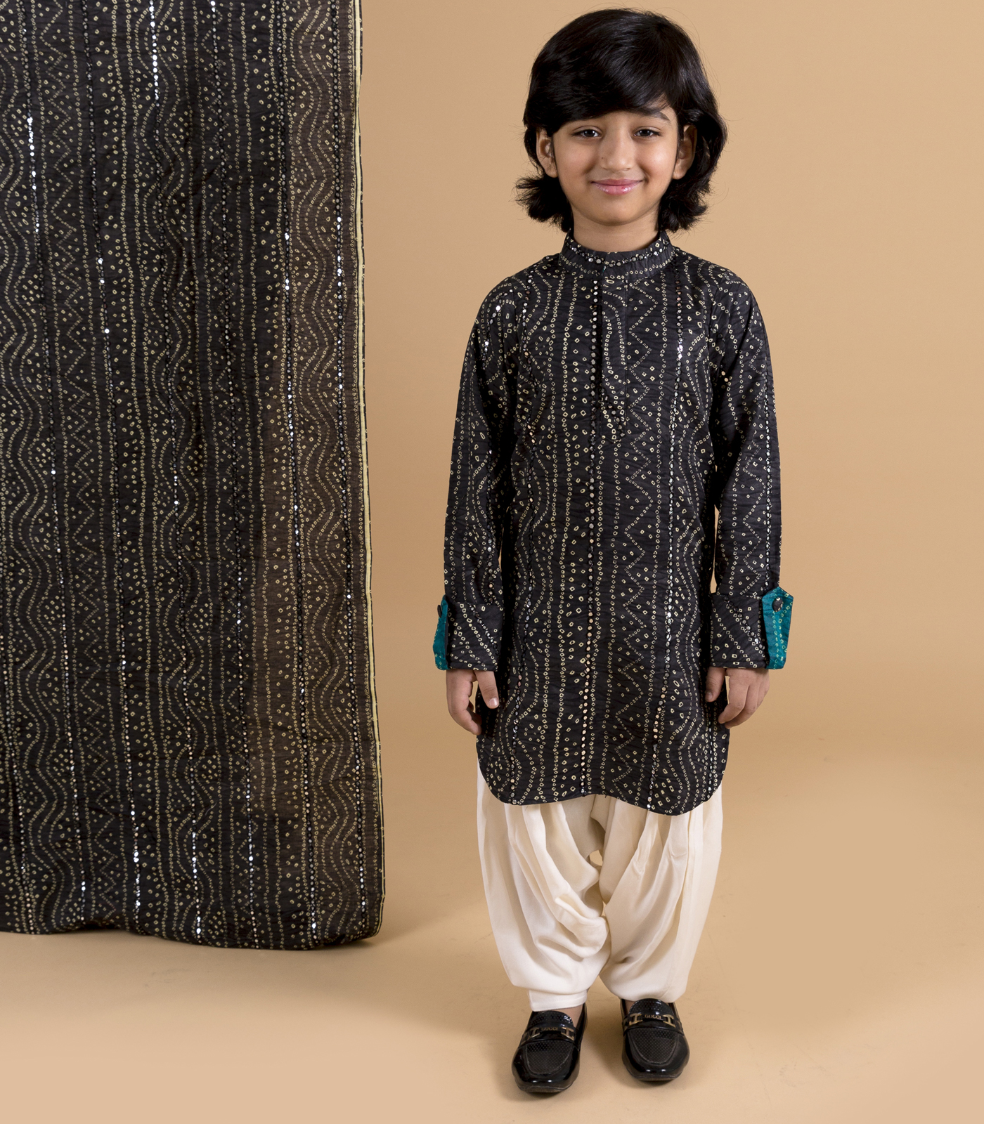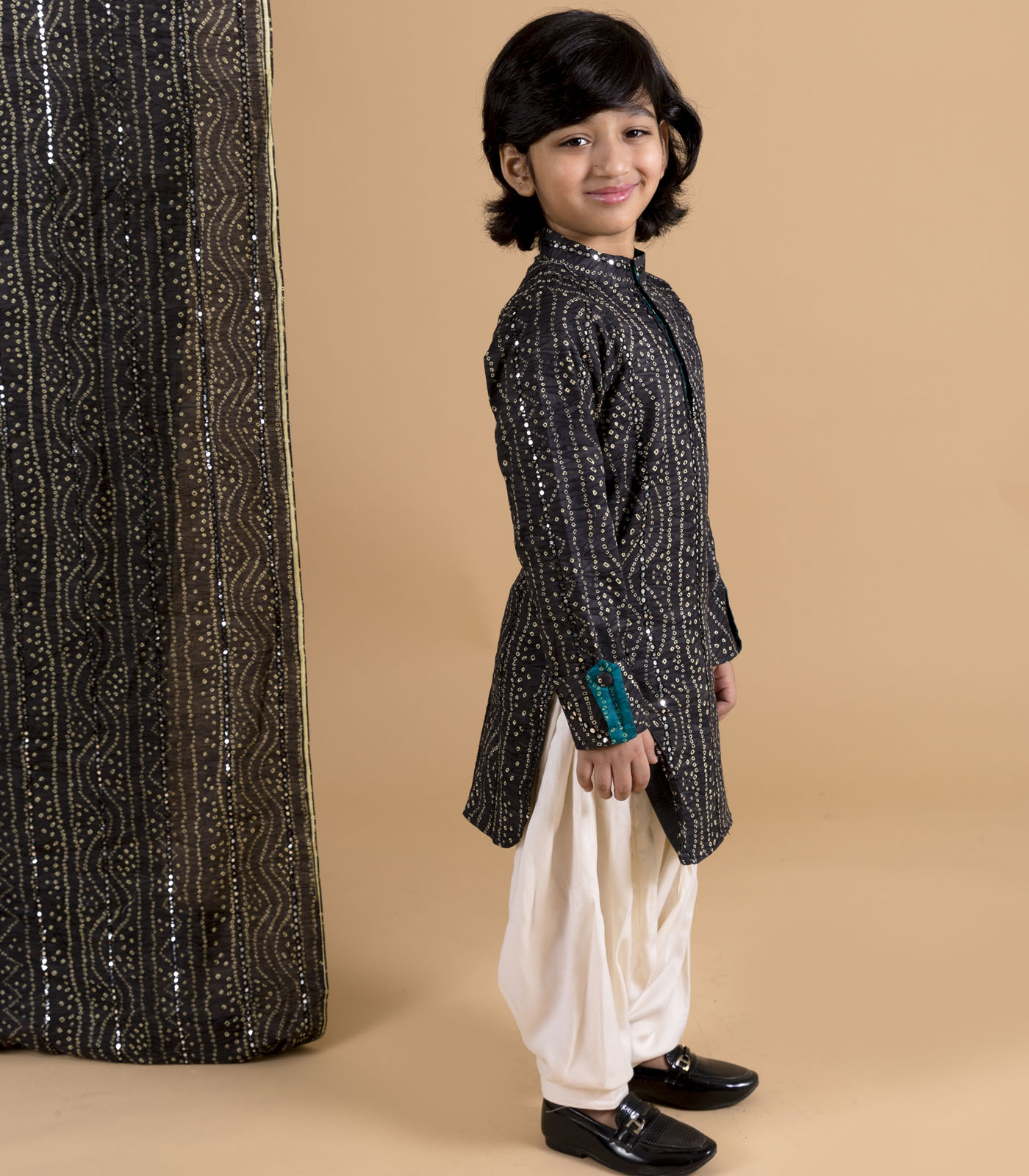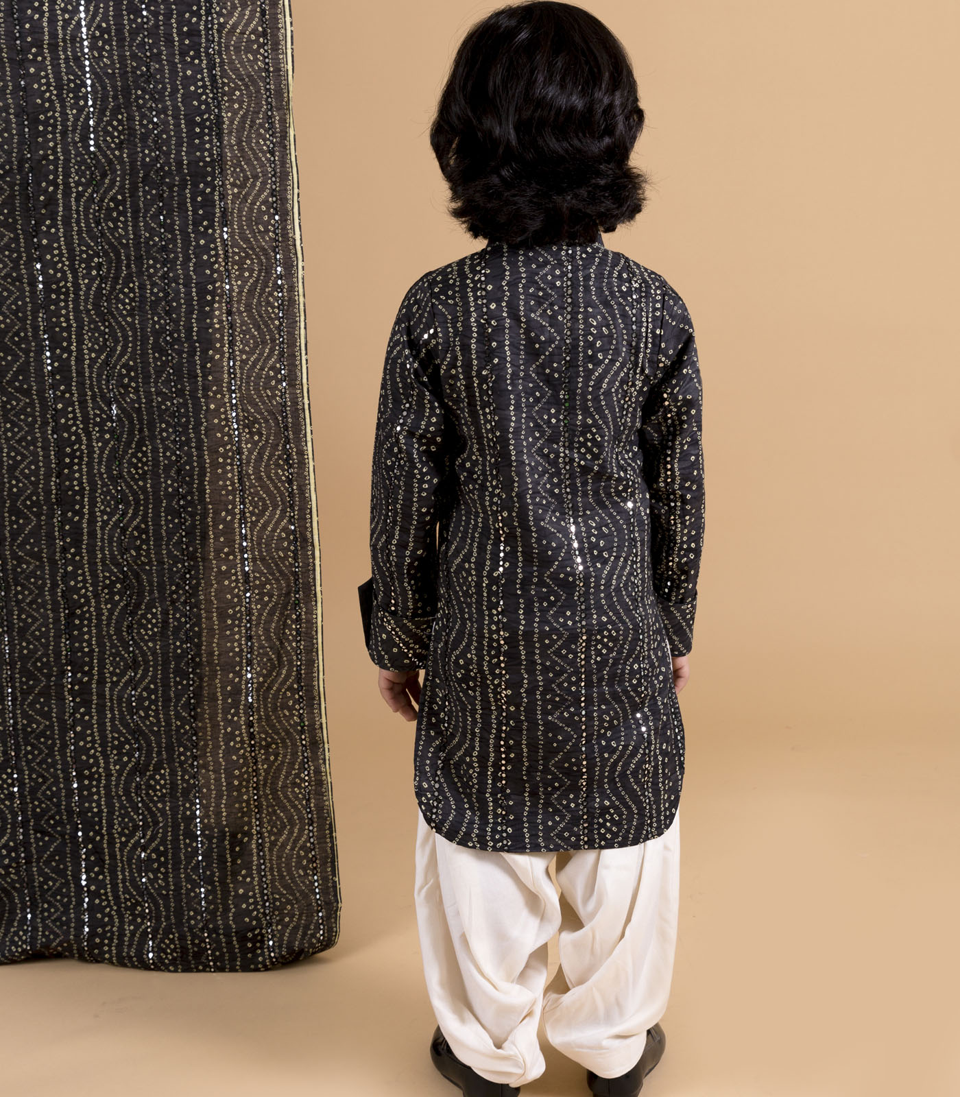 Black bandhni print kurta with faux mirror detailing