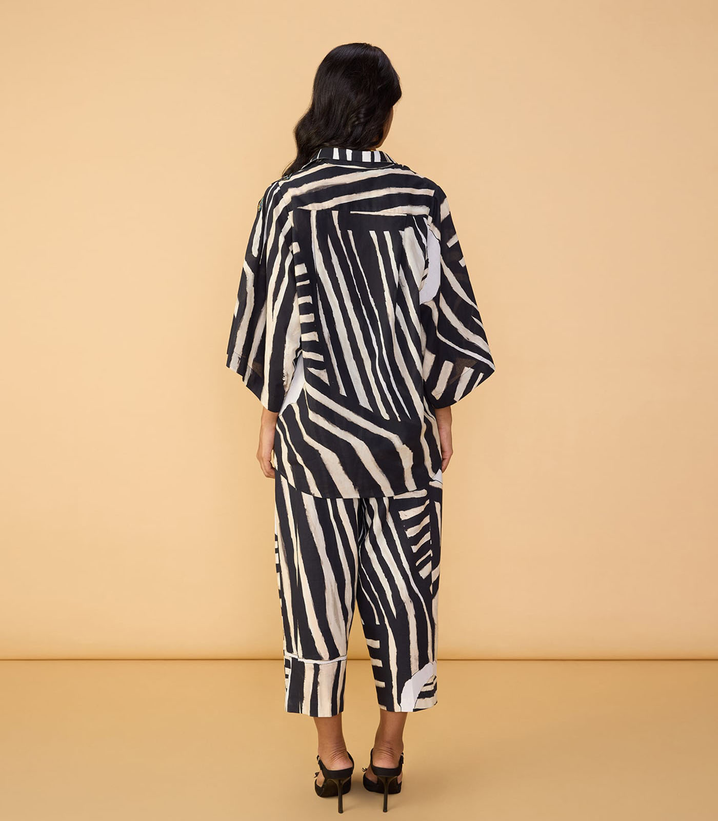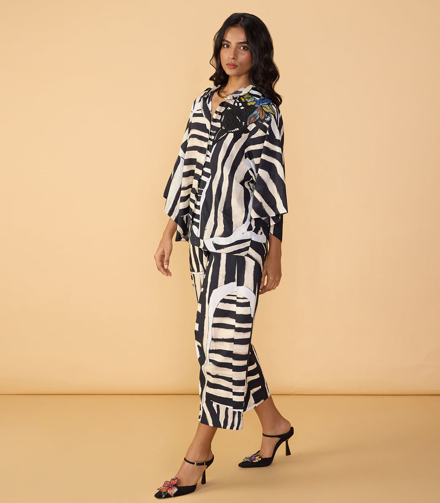 Shirt : Abstract stripe print batwing collared shirt with intricate hand embroidered floral cutwork applique shoulder detailing