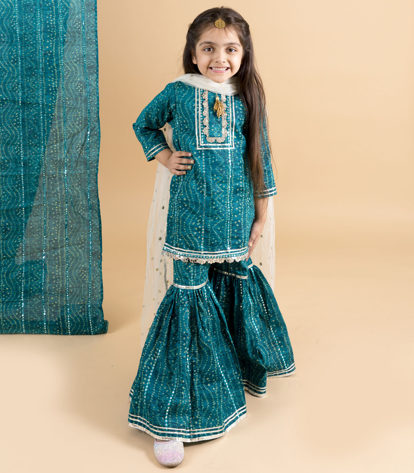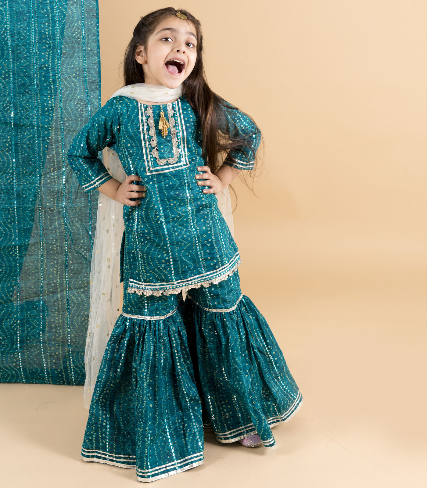 - Sharara set with bandhni print, thread work and faux mirror detailing