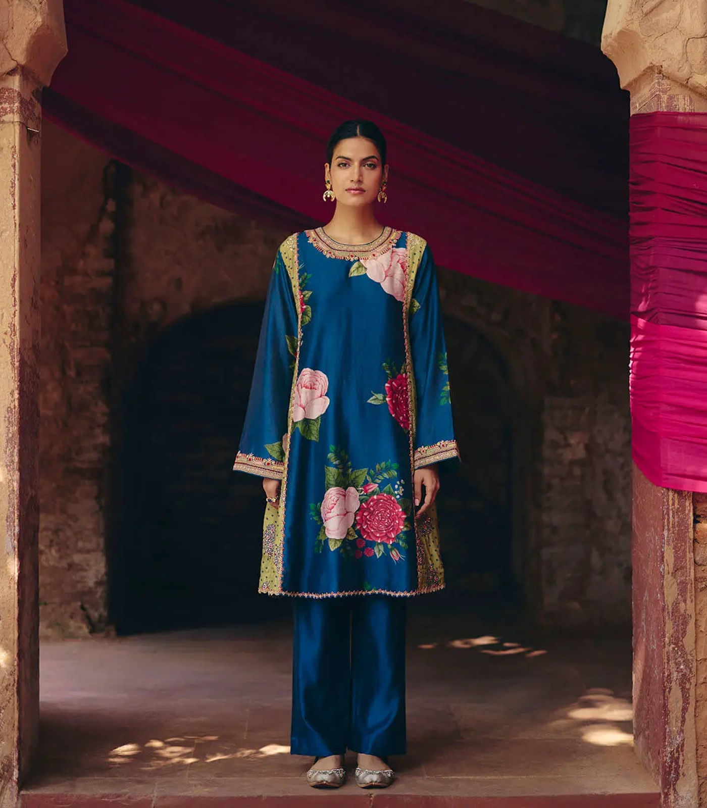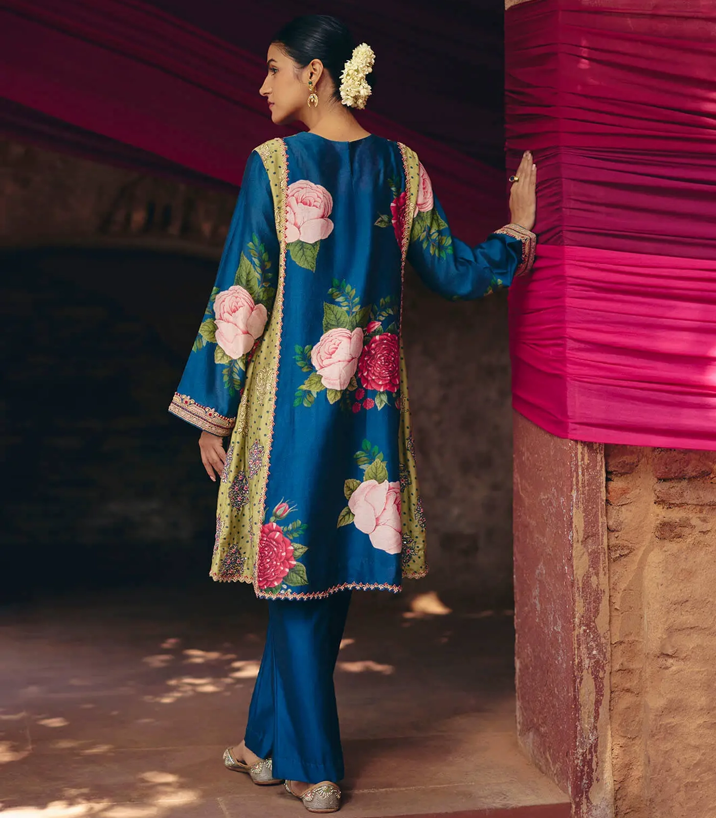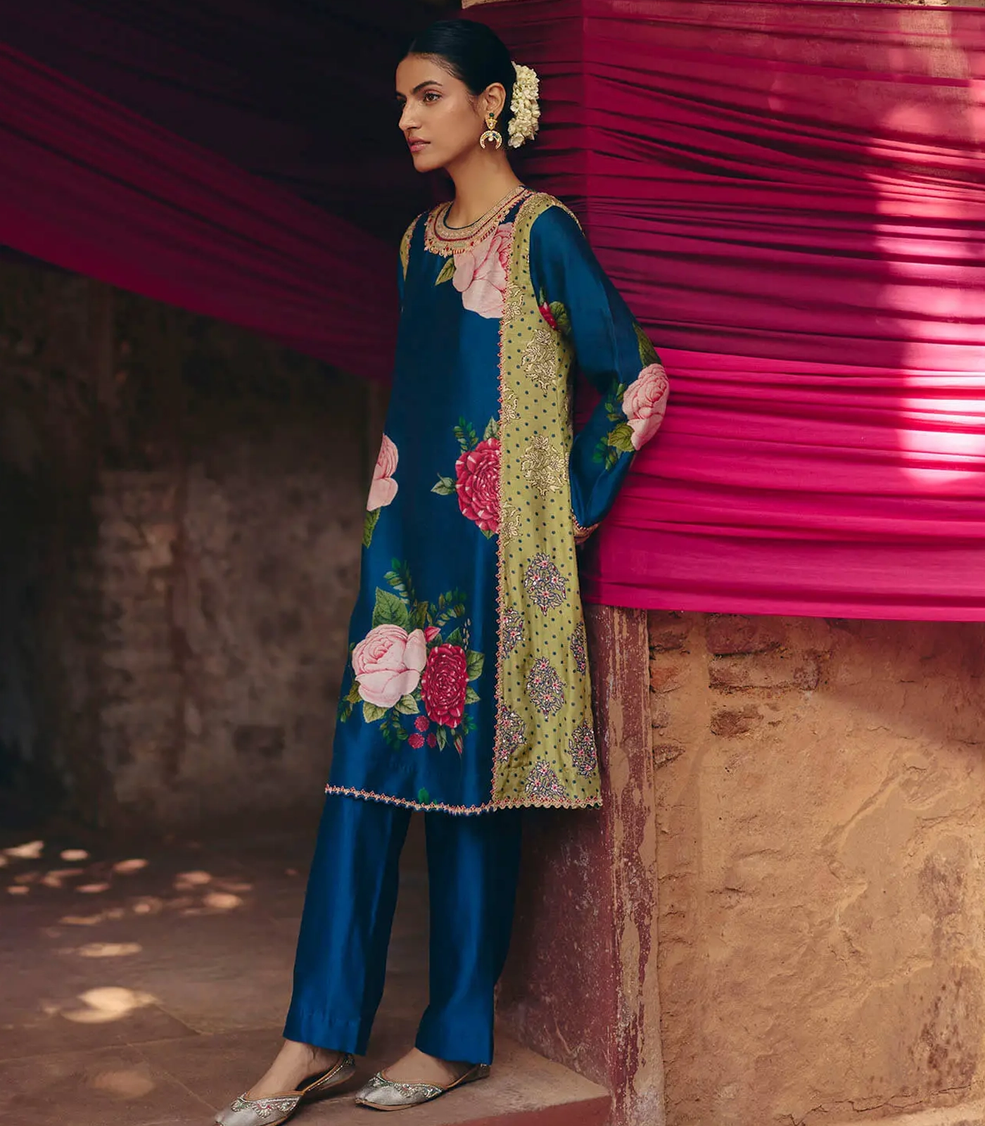 Blue & Green floral kurta – pant set with a vibrant print & embroidery in thread and marodi work. [Mulmul slip included]