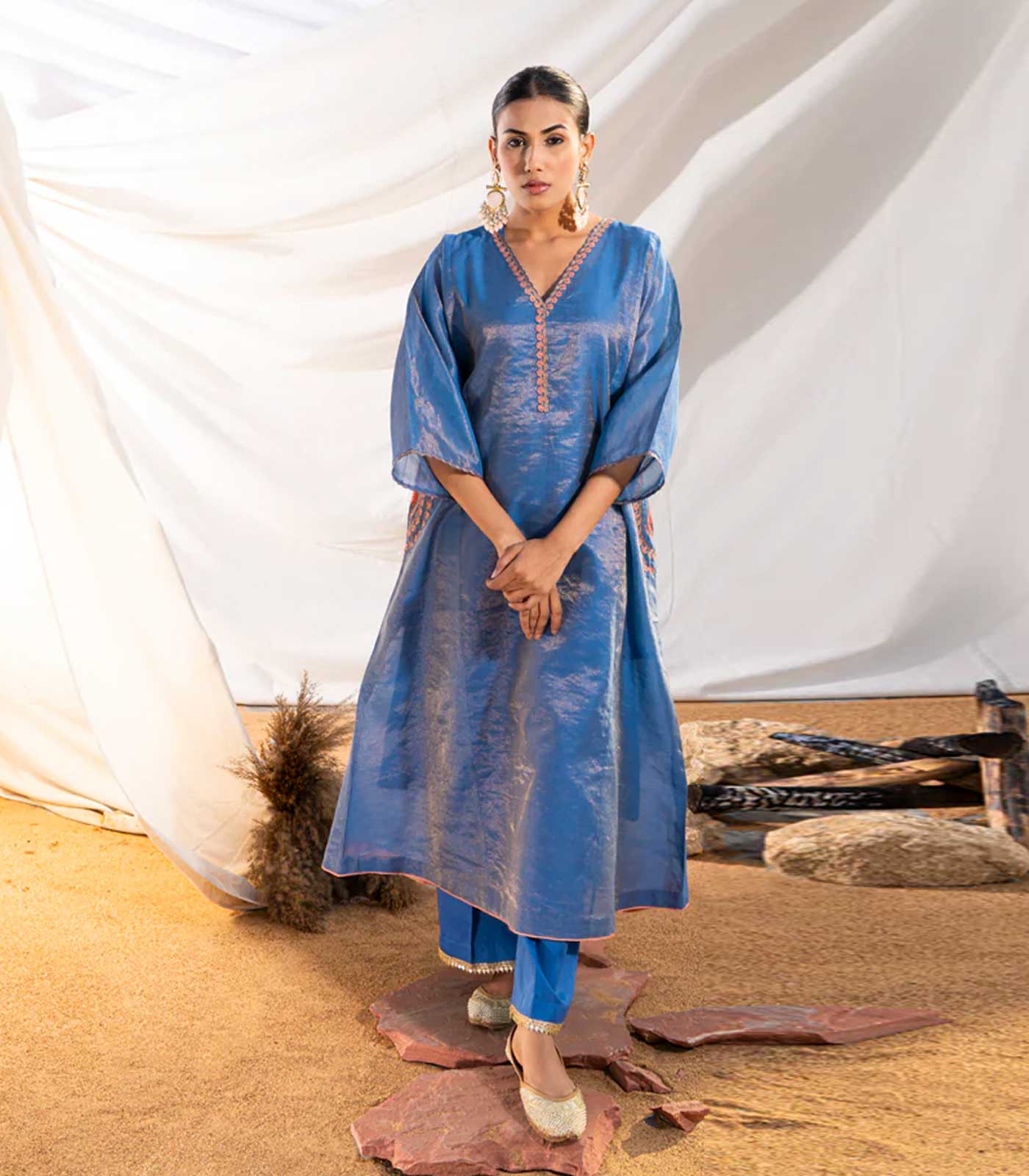 Blue Handloom Cotton Zari Tissue Embroidered Kurta Set Blue Handloom Cotton Zari Tissue 3-Panel Kurta creates a dynamic silhouette with the addition of embroidered side pockets that enhance its functionality and chic appeal.