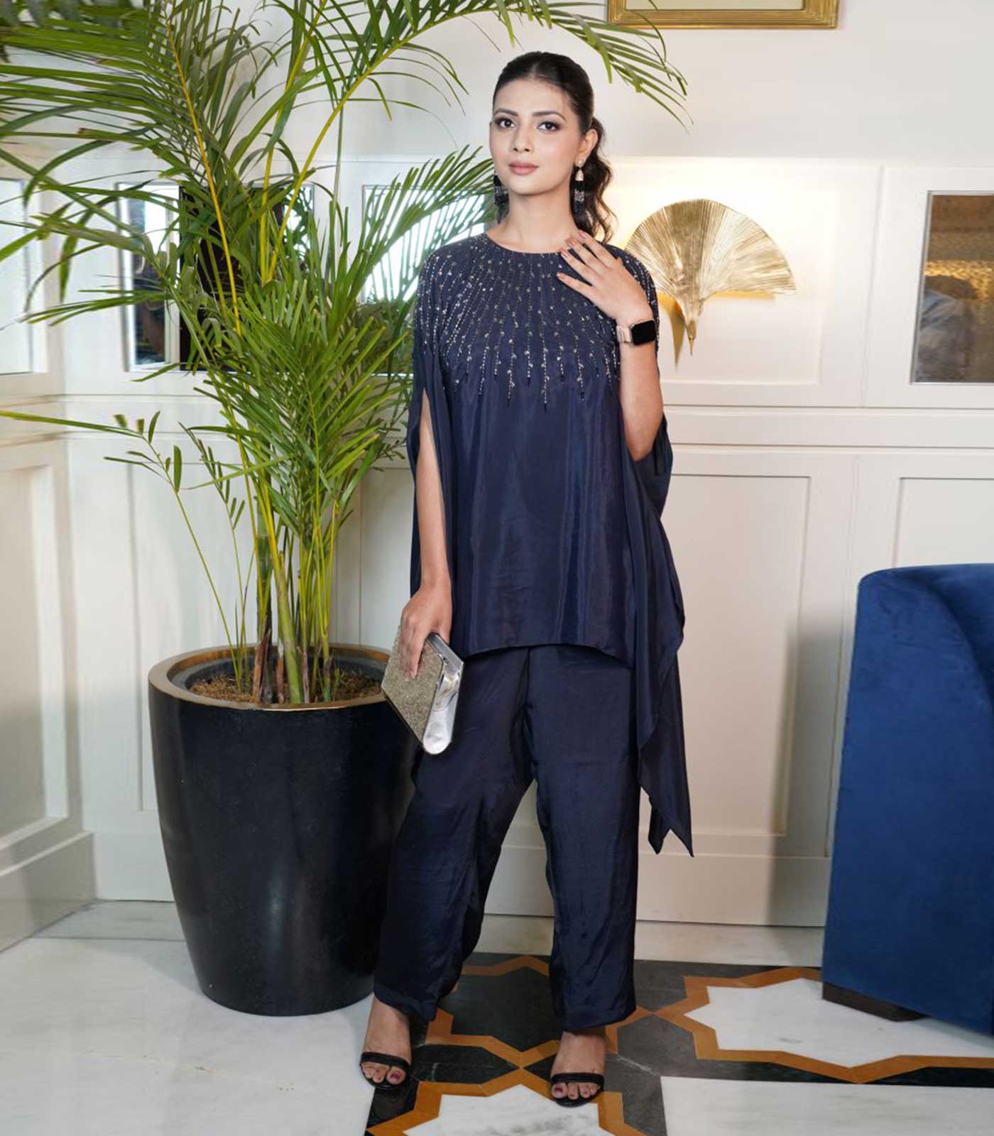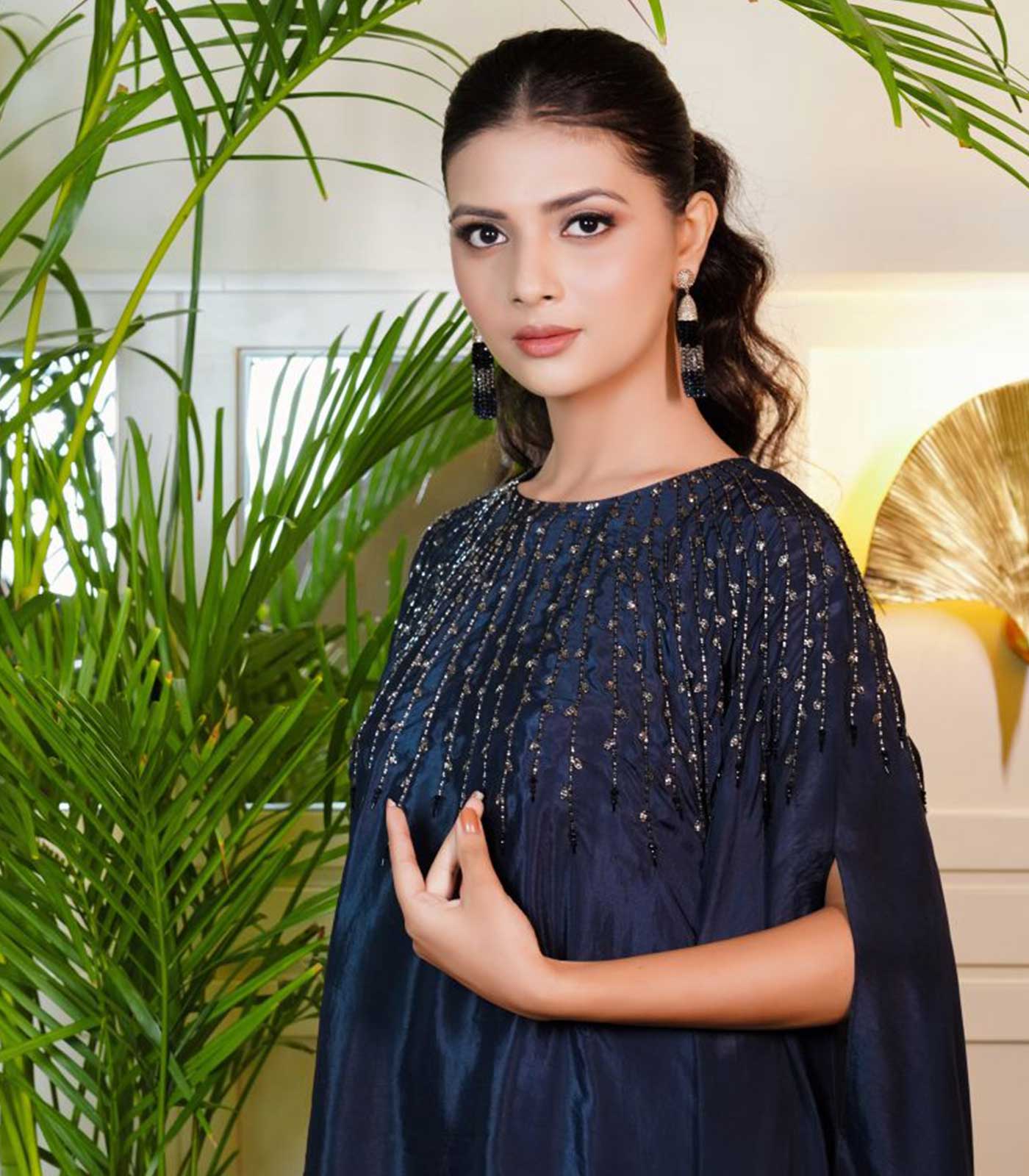 Blue Smocked top elegance like our navy blue crepe dress with hand-embroidered Nalki highlights on the front and back.