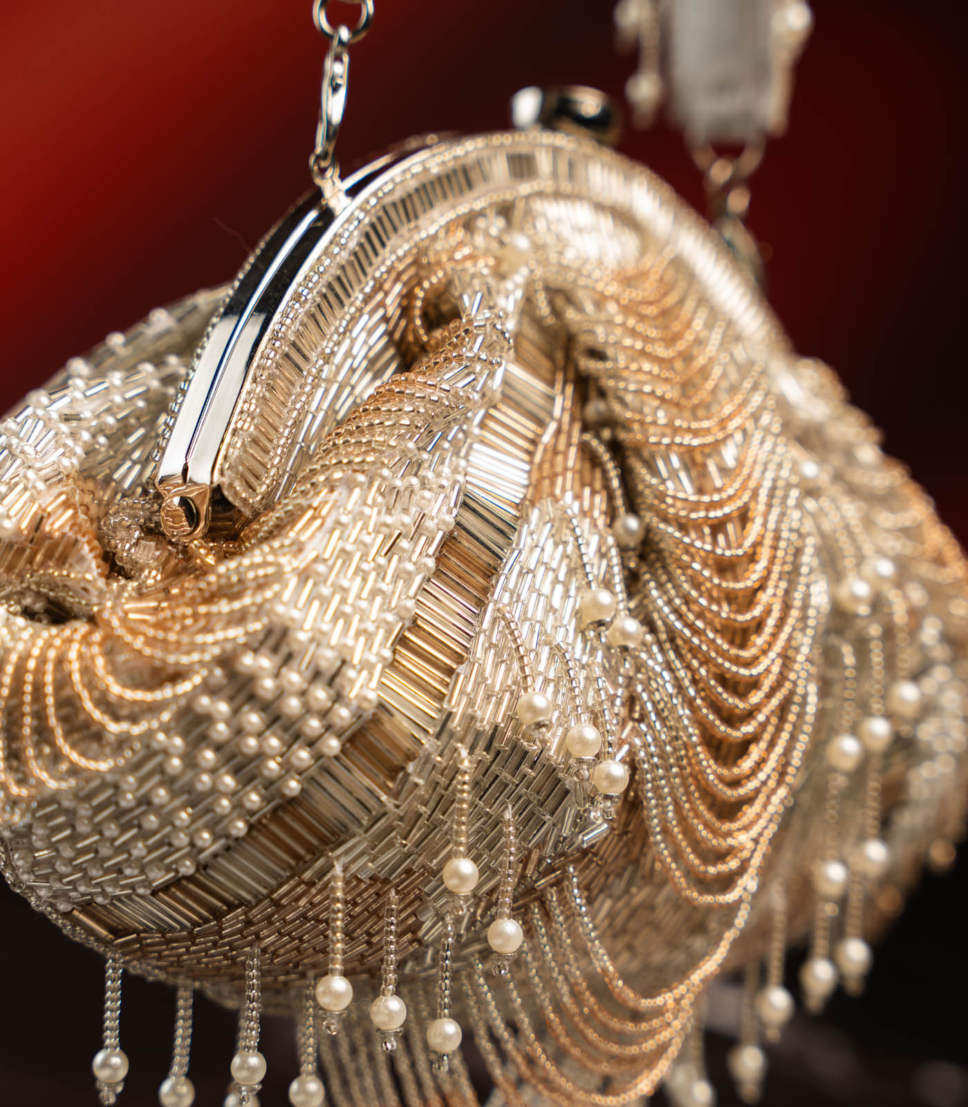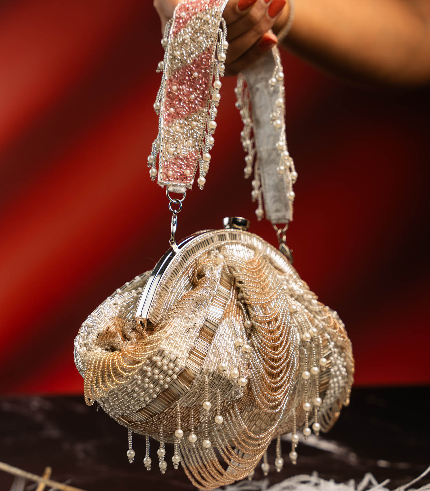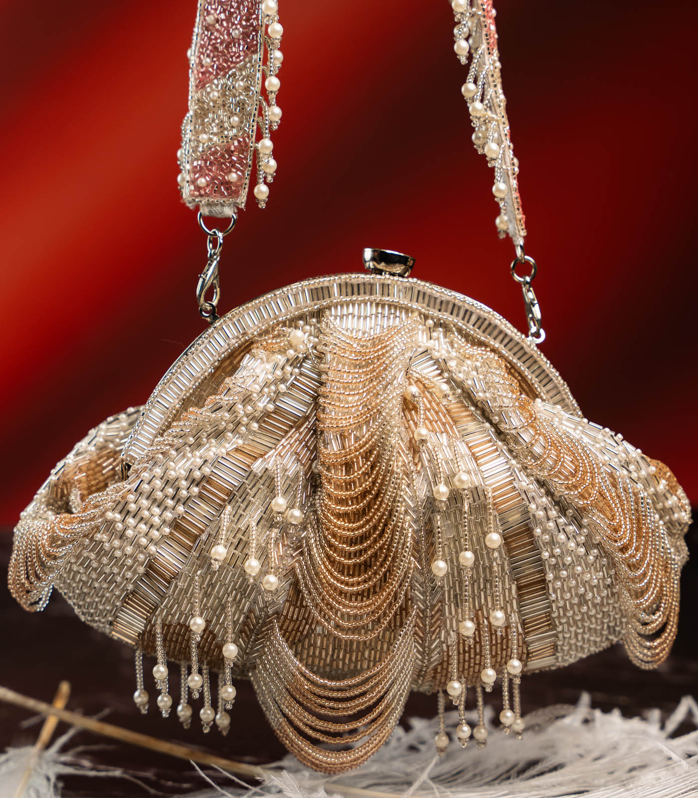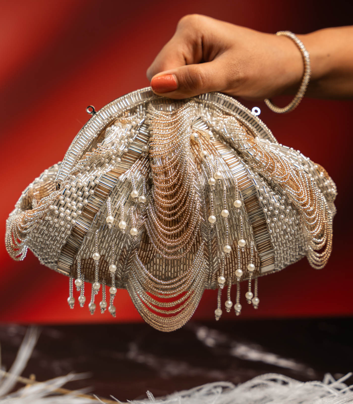 Add a hint of shimmer to your evening ensemble with this elegant Silver and Rose Gold Scallop Clutch. Featuring delicate scallop detailing in silver accented with a touch of rose gold, this piece is adorned with subtle beaded tassels and pearls for a graceful finish. The pearly beaded handle brings the perfect contrast to the design and is removable, allowing you to carry it as a traditional potli or a modern clutch. Finished with fine sequin and beadwork, it’s a versatile accessory designed to elevate your night-out look.