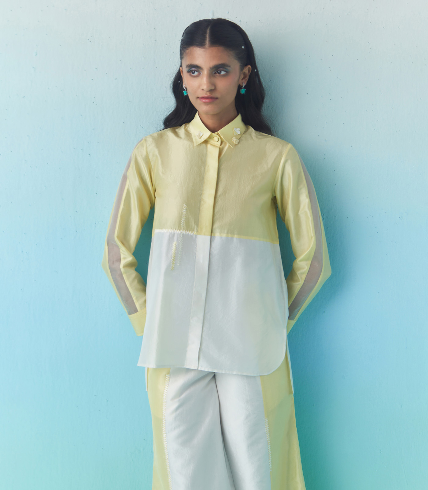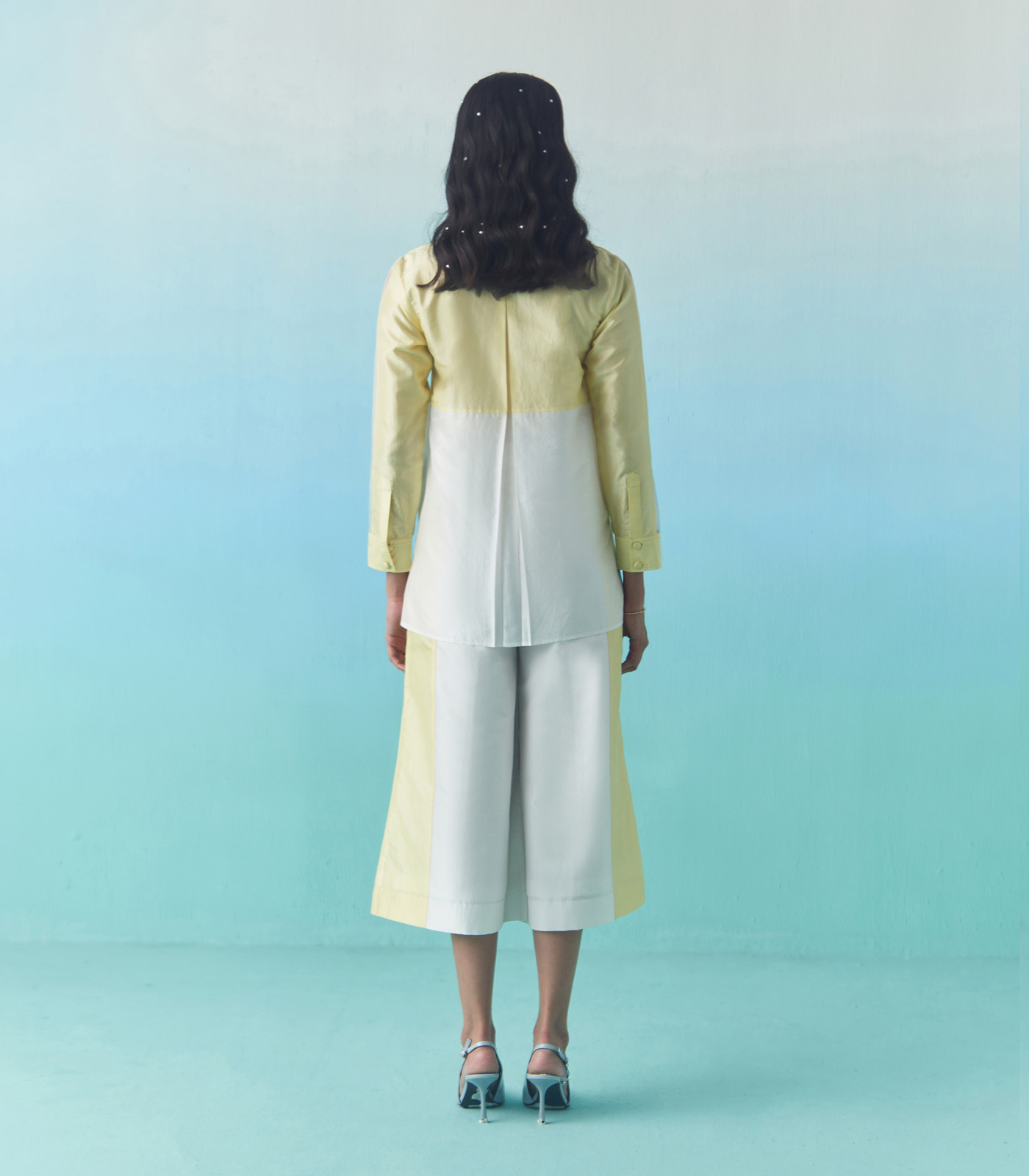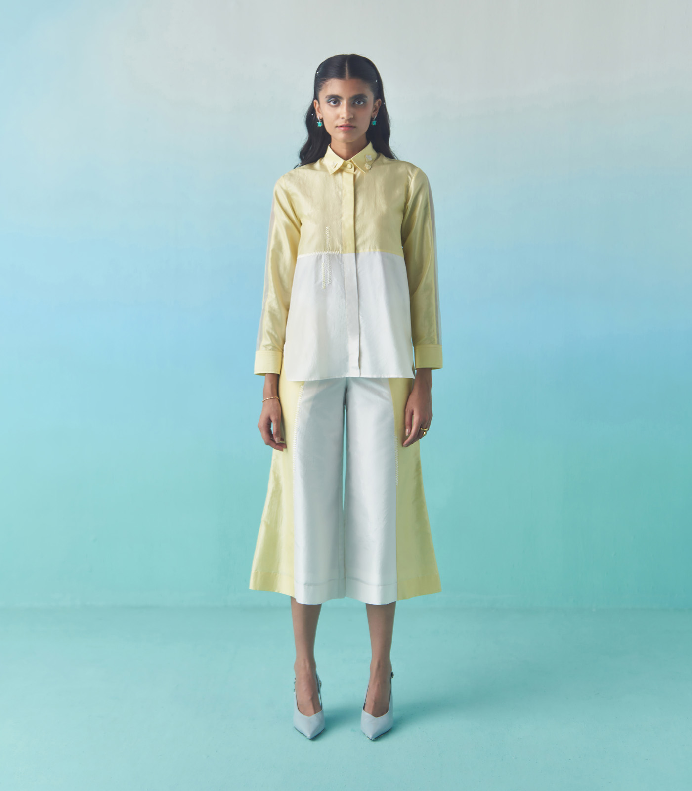 A set of colour block silk co-ords, featuring hand done details on the front of the top and culottes.