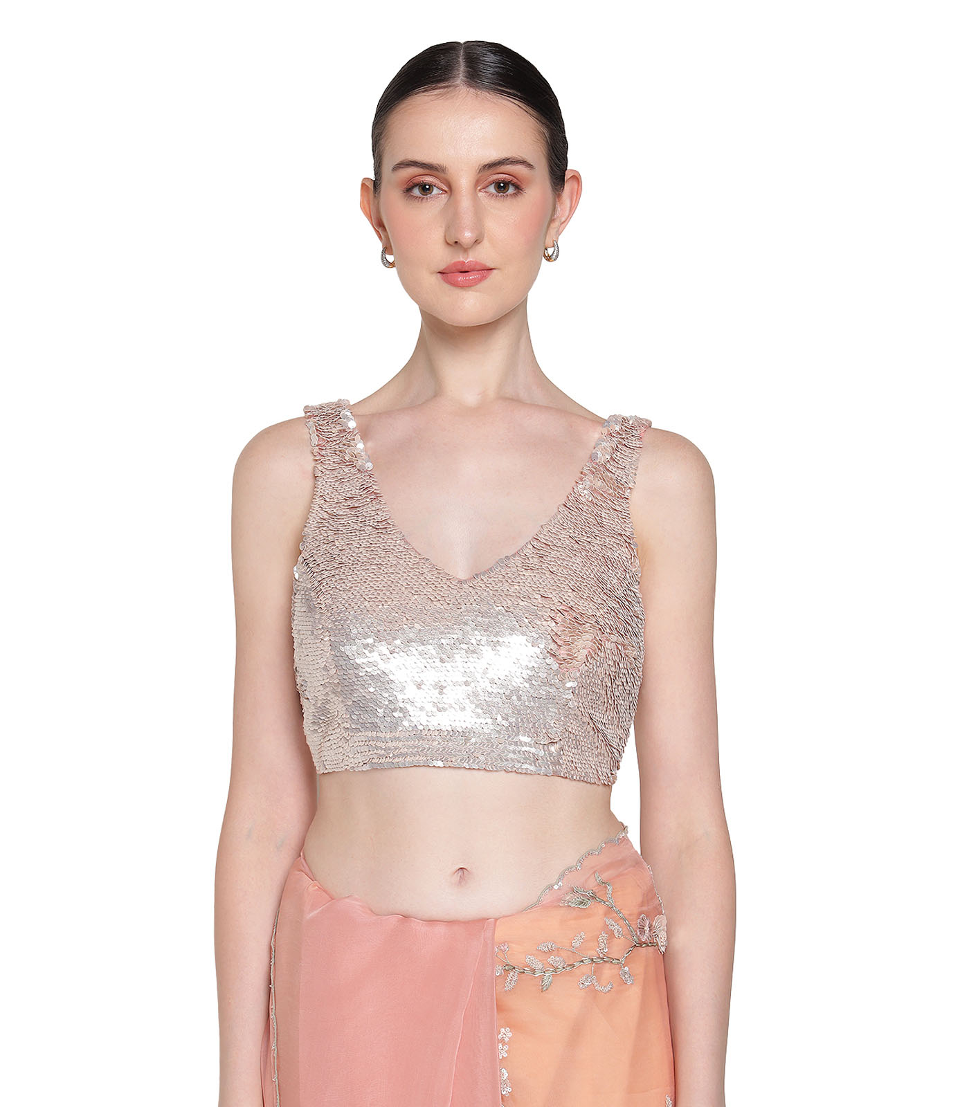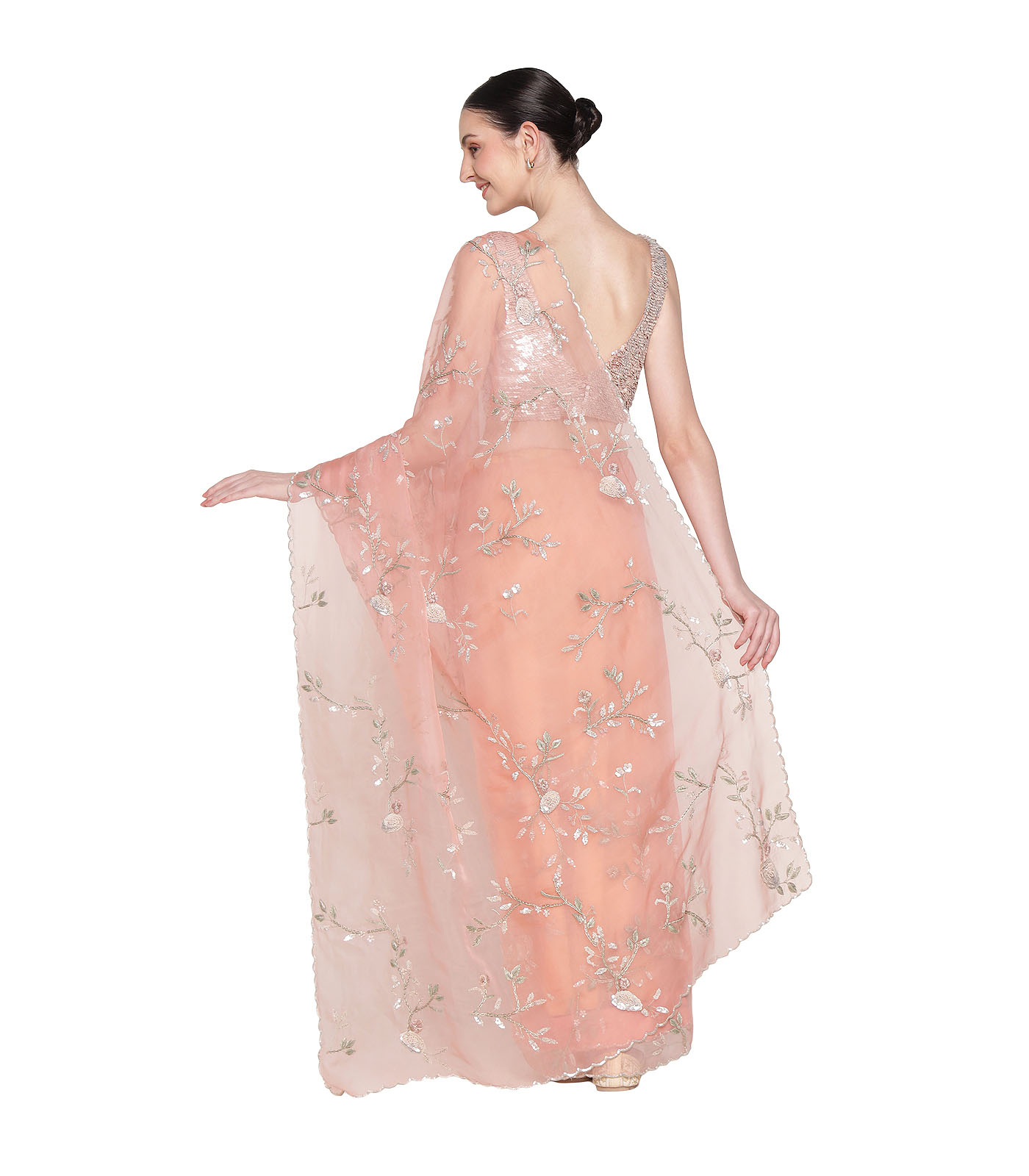 A cheerful yellow organza saree adorned with delicate hand embroidery. Lightweight, festive, and gracefully feminine—perfect for daytime celebrations and joyful occasions.