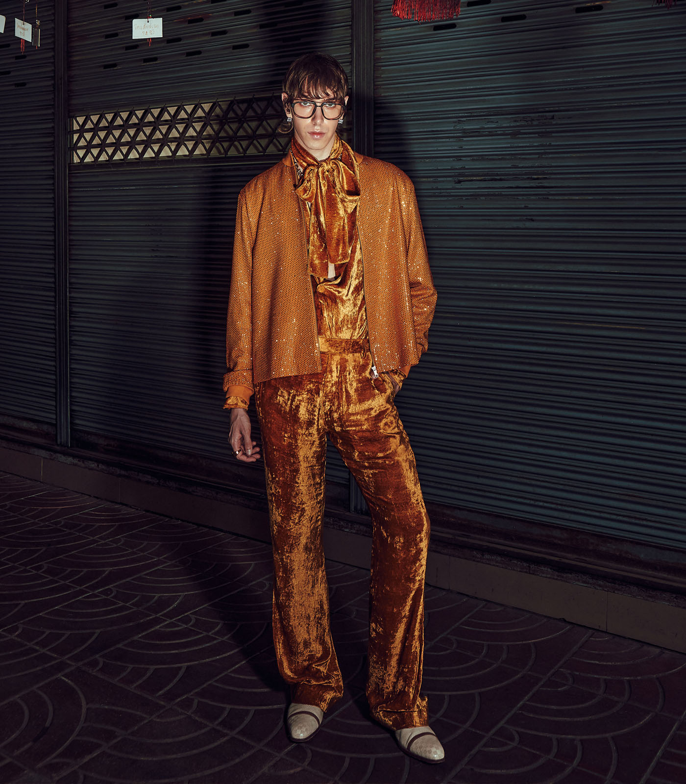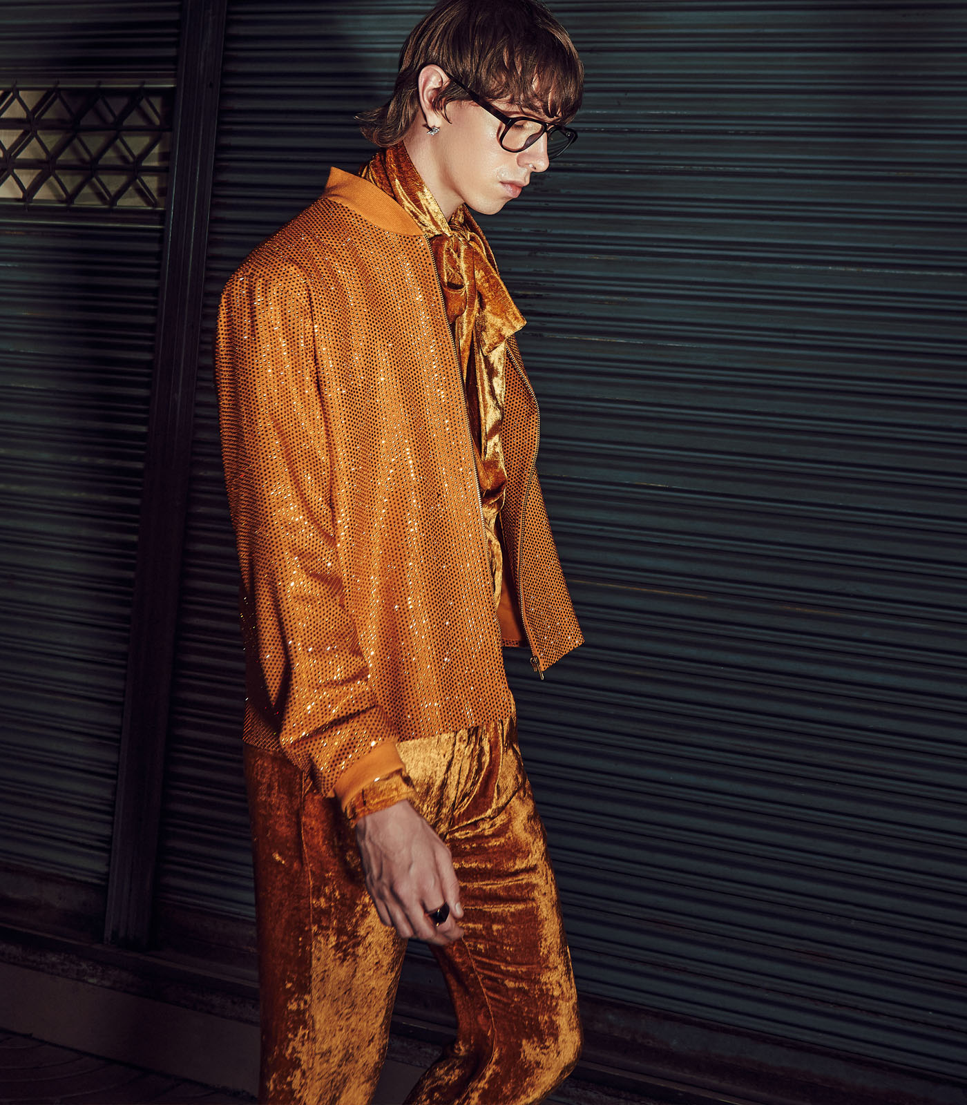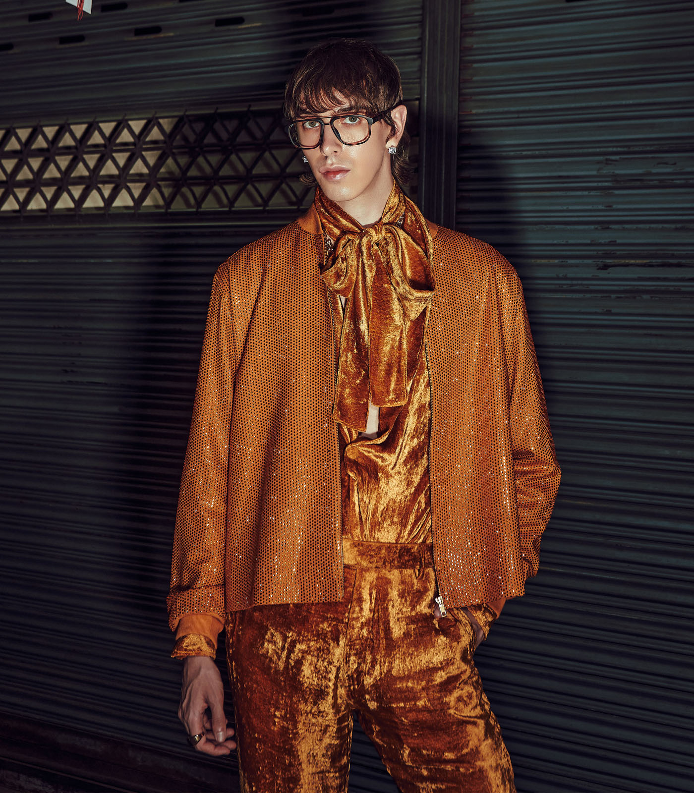 This set includes a mustard bomber jacket in melon crepe and a matching velvet coord set.
