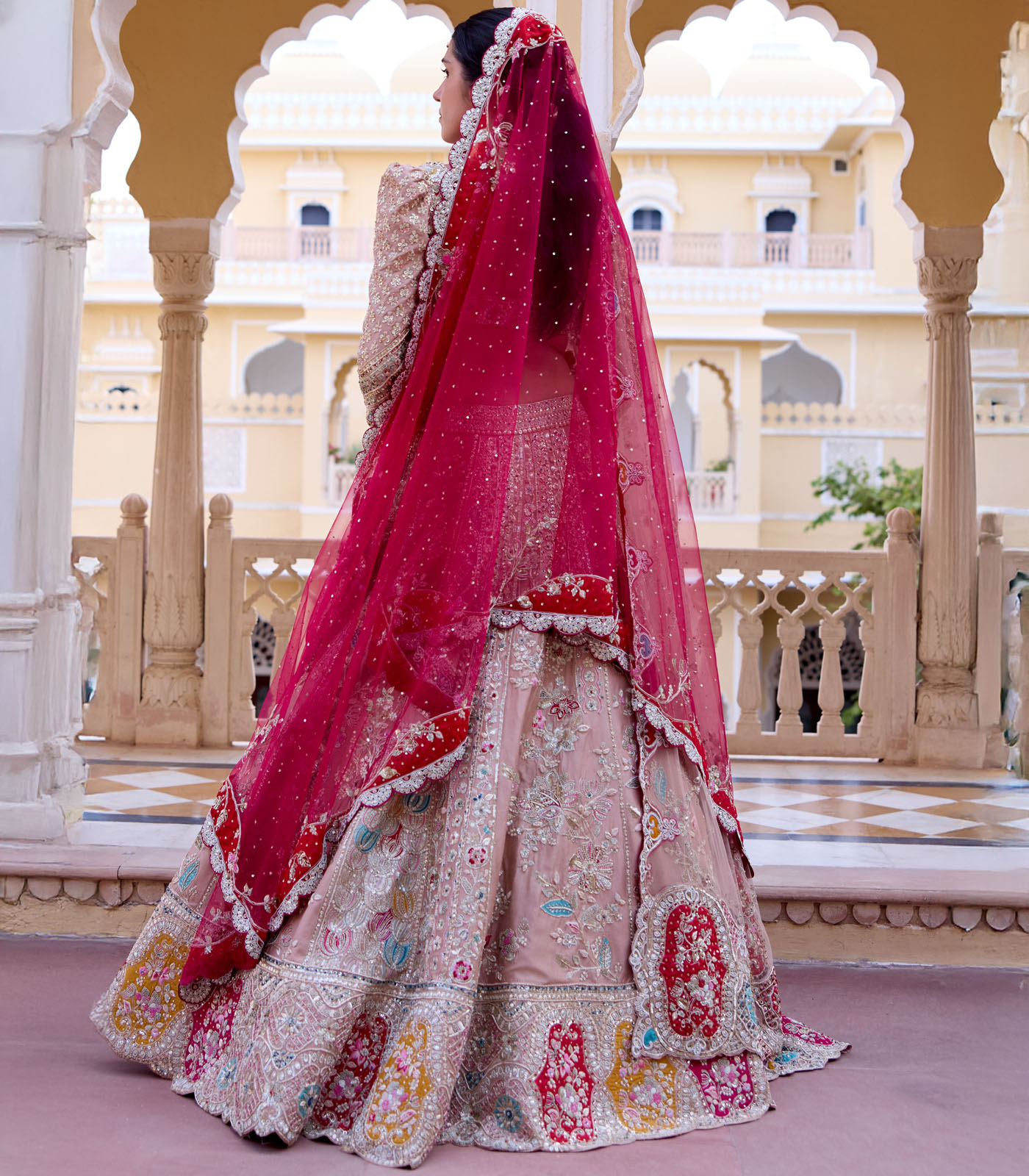 The set is handcrafted with zardozi, french knots, contrast multi colored appliques and dori embroidery, paired with a contrast veil