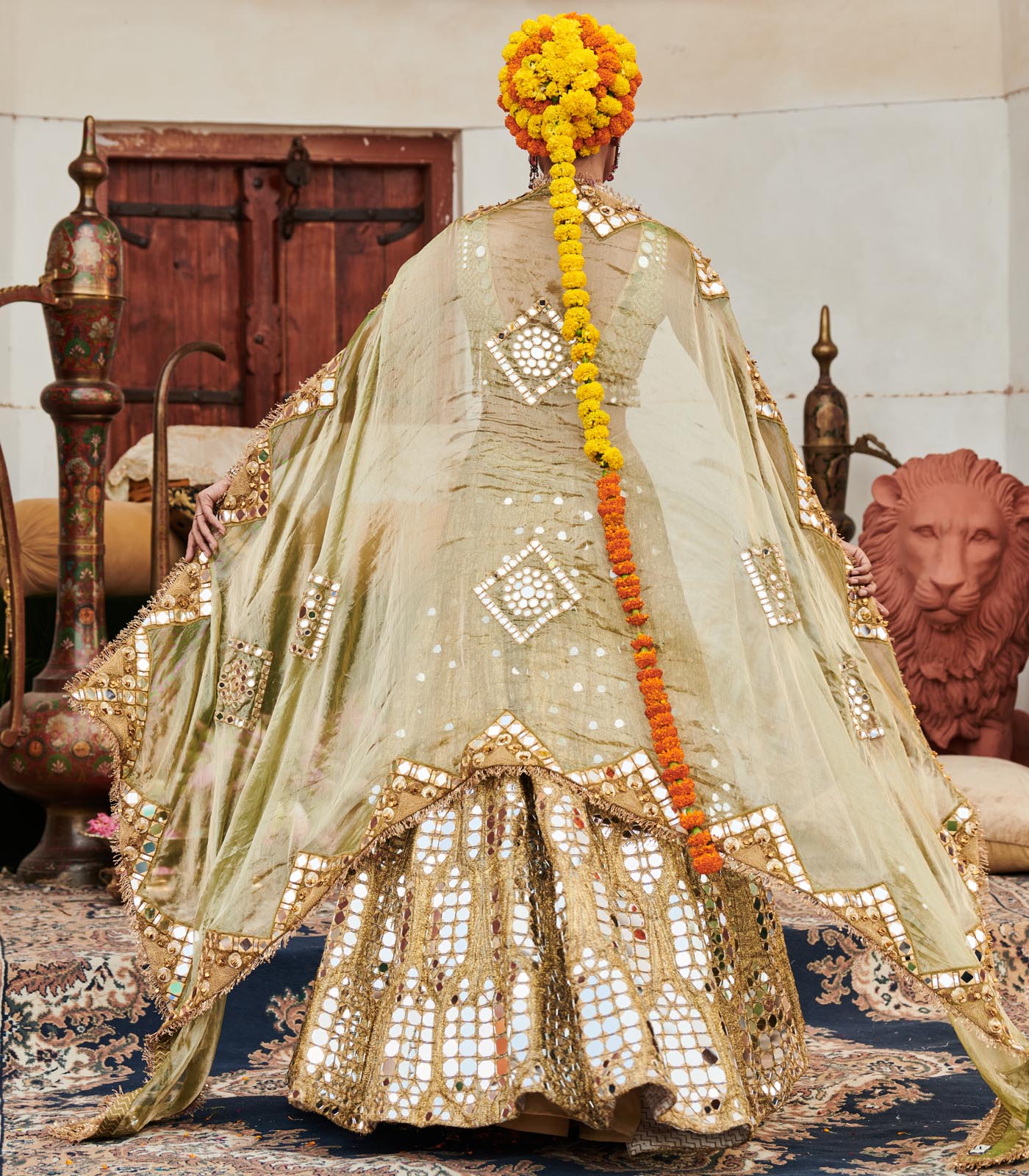 Golden chanderi lehenga adorned with intricately placed mirrors and mirror work blouse on gota lined with chanderi silk paired with a tissue dupatta with fine kiran.