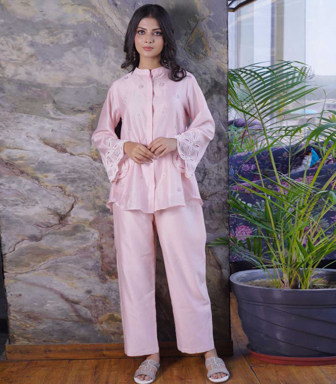 Chanderi Cord -Set With Resham Mooti embroidery in White and peach color on the bell sleevs.