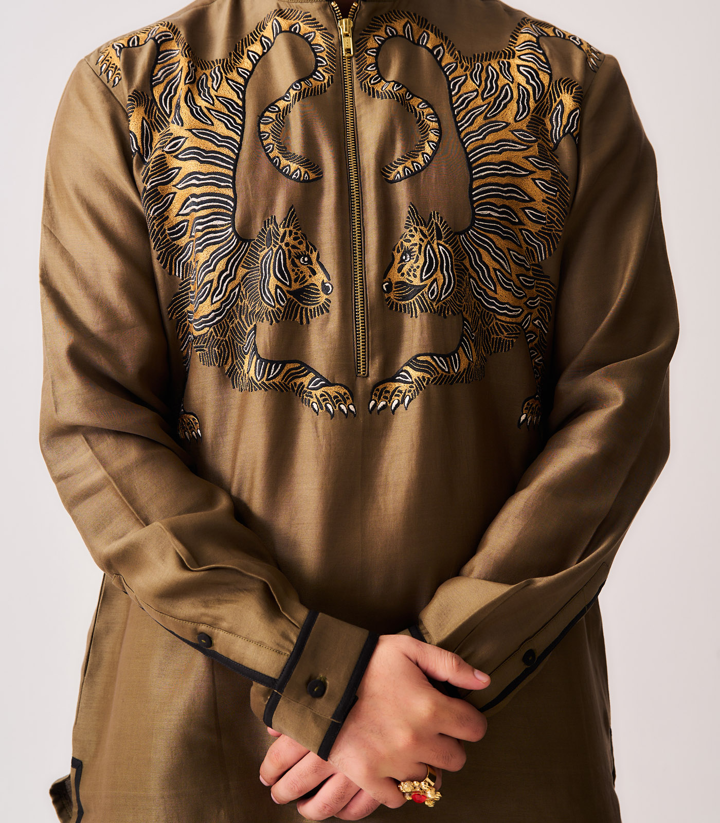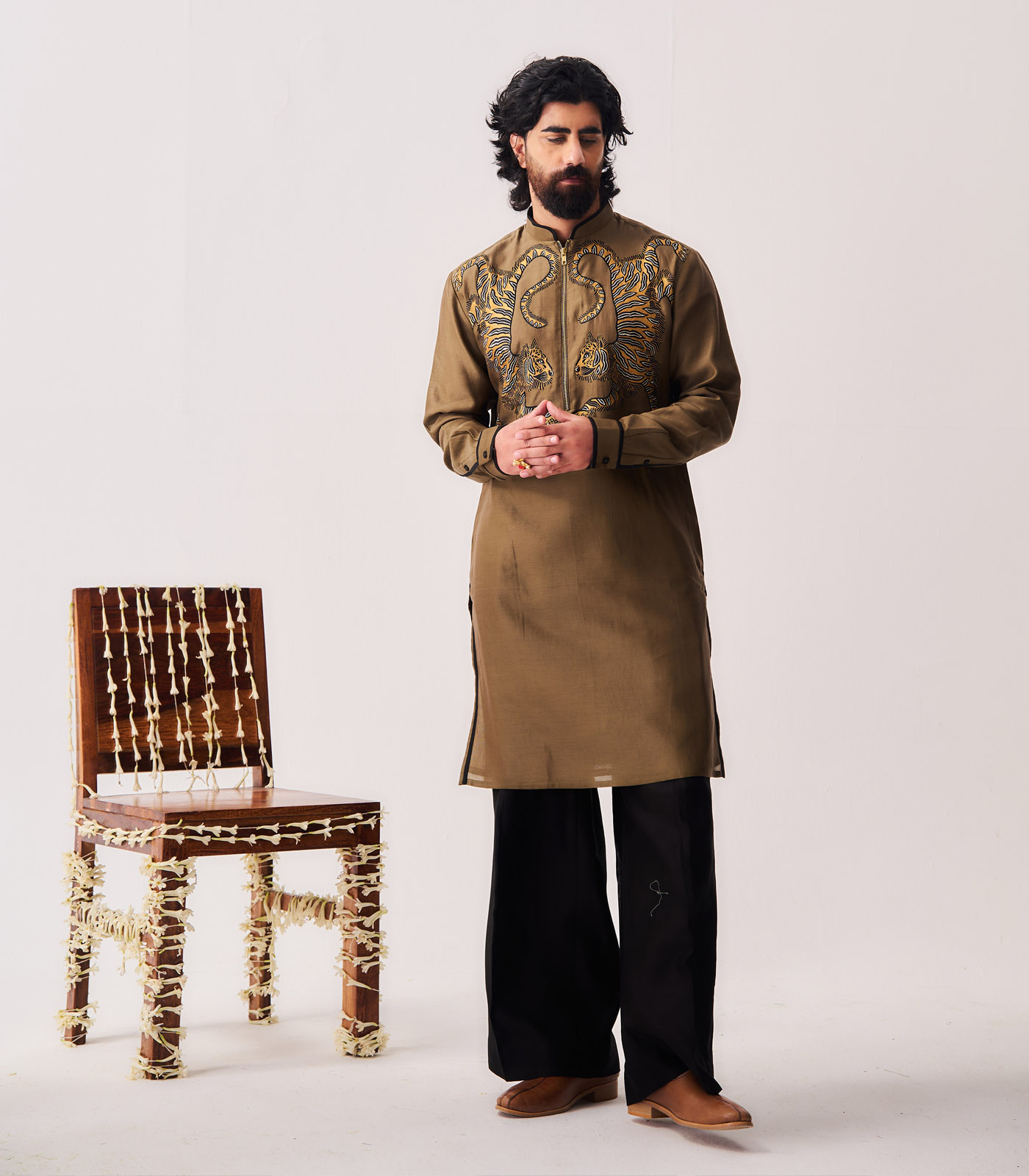 Kurta With Flare Pants / Chanderi / Olive Brown / Twin Guardians / Resham Embroidery