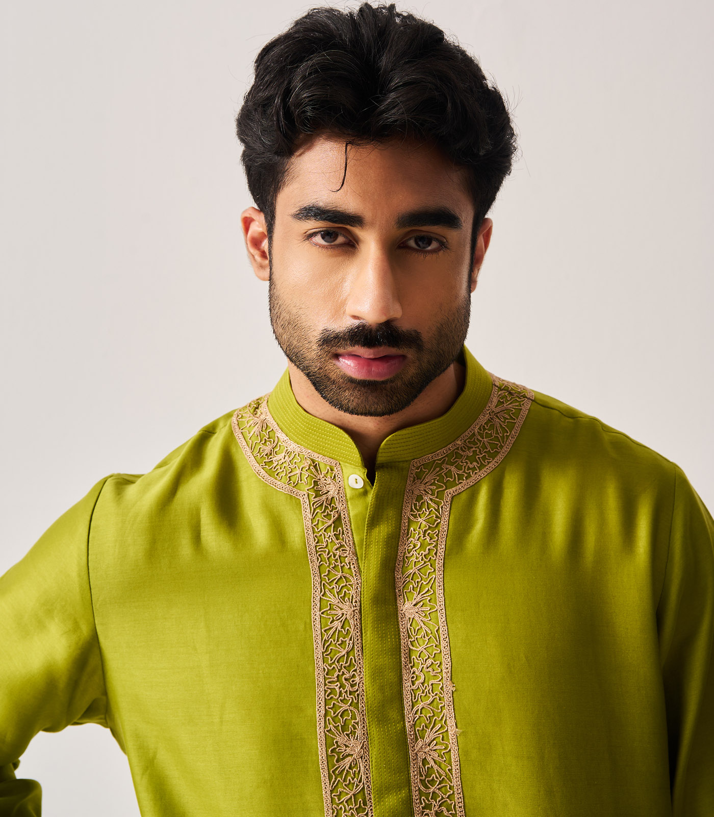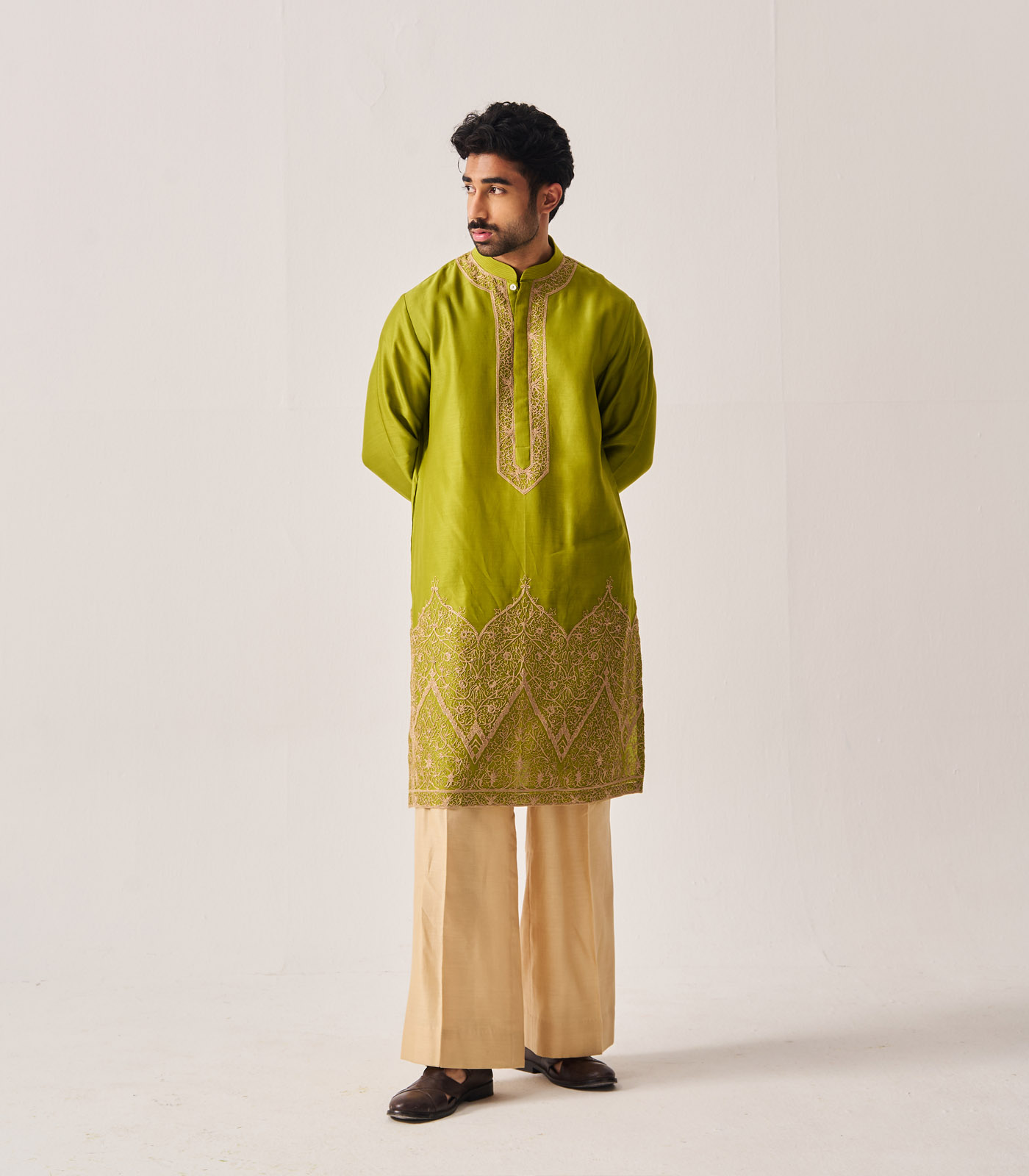 Kurta With Flare Pants / Chanderi / Leaf Green / Floral Dome / Dori Embroidery